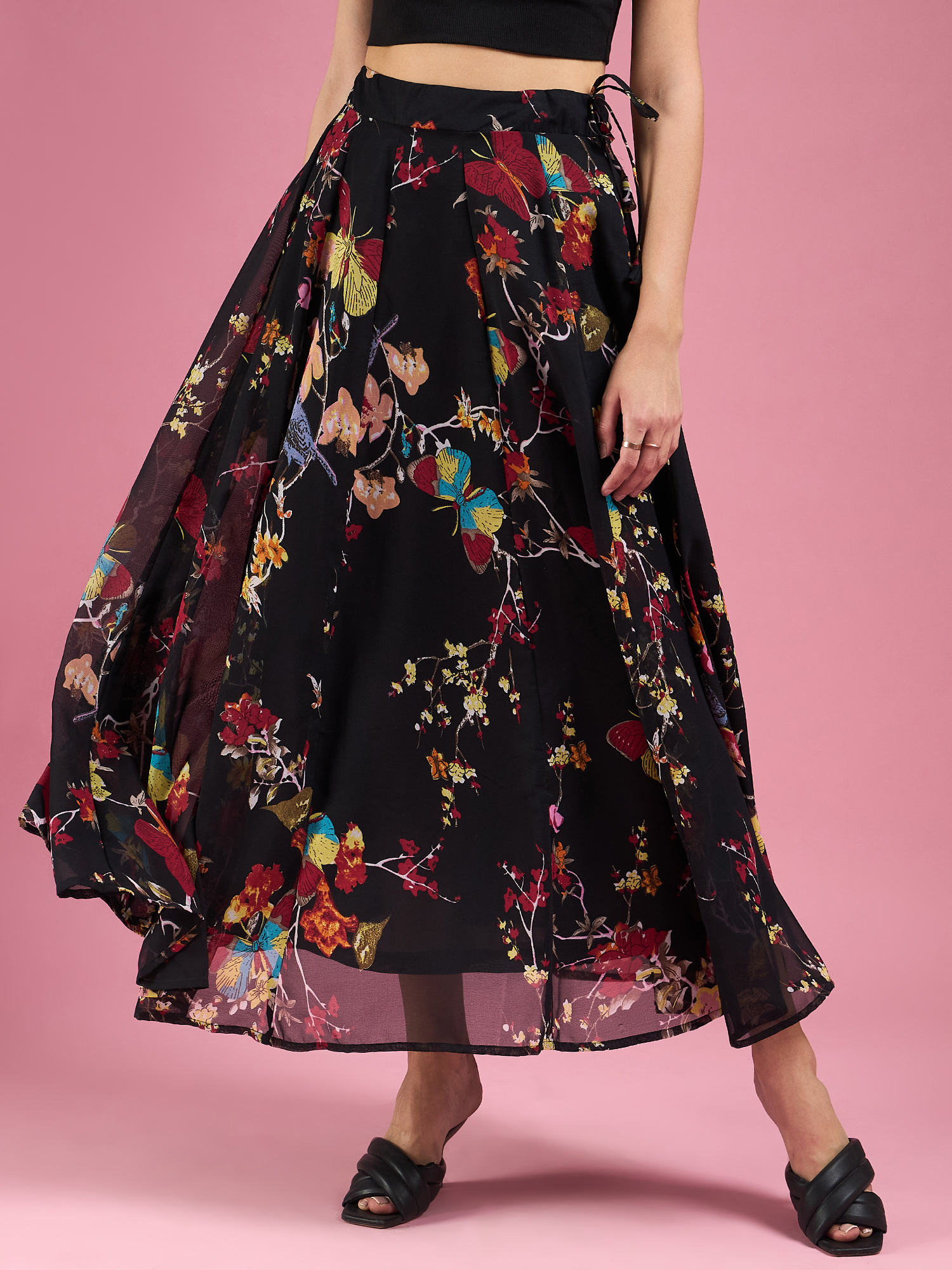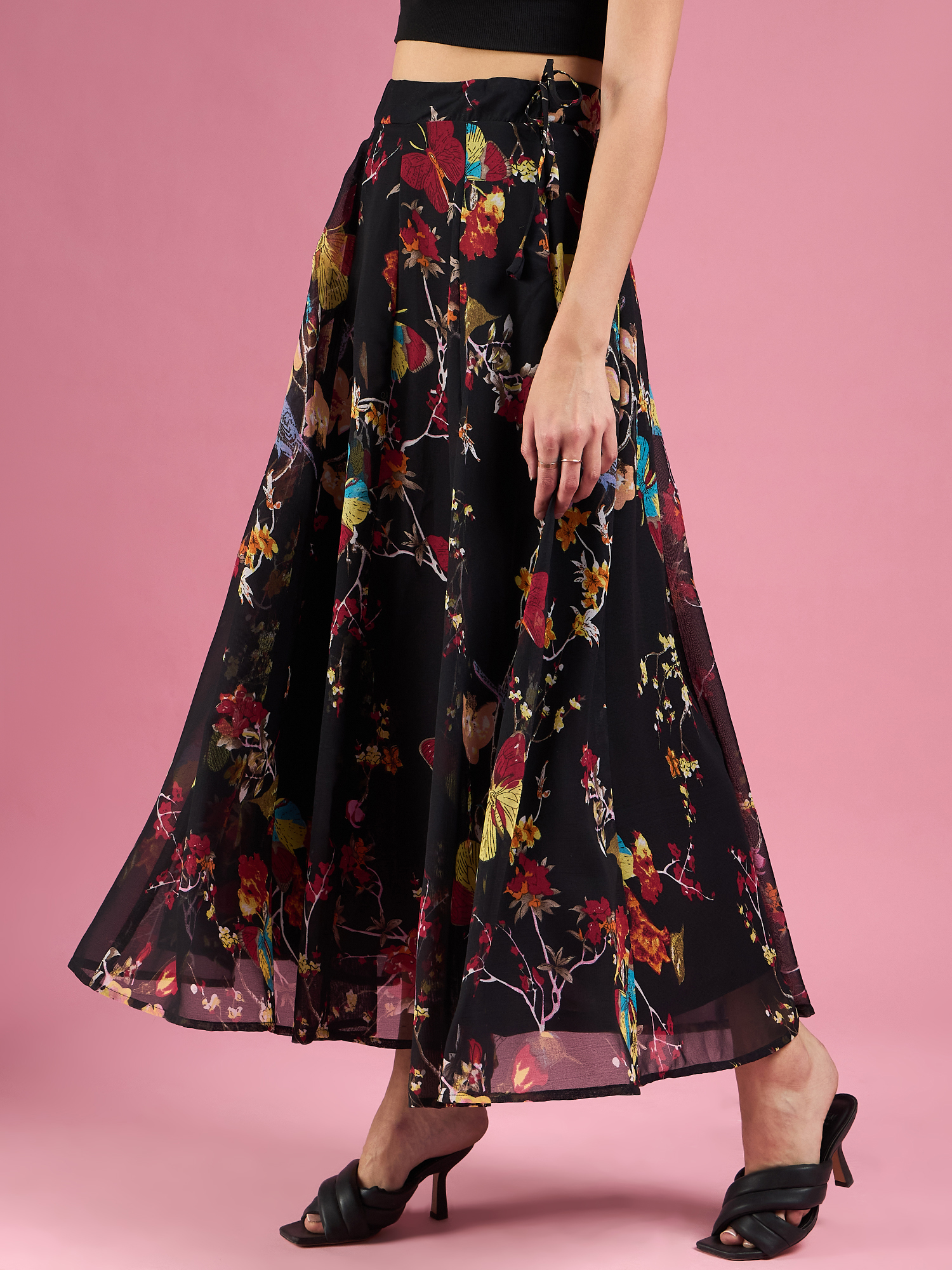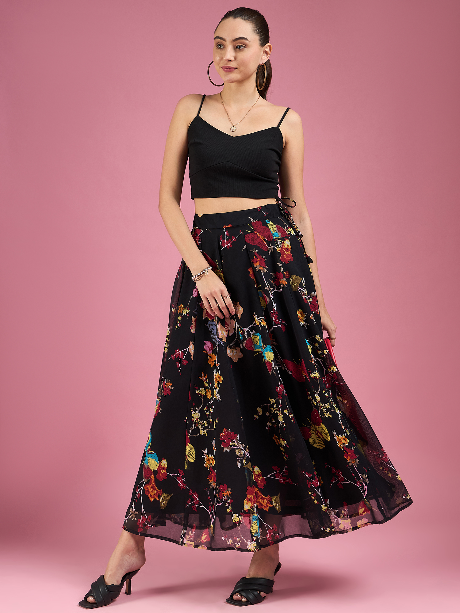 Add a touch of timeless charm to your wardrobe with this floral print black maxi skirt. Featuring a stunning blend of vibrant floral motifs, this flowing skirt is designed for both style and comfort. The high-waisted silhouette flatters the figure, while the lightweight fabric ensures effortless movement. Whether paired with a simple blouse for casual outings or dressed up for a special occasion, this skirt is a versatile staple.