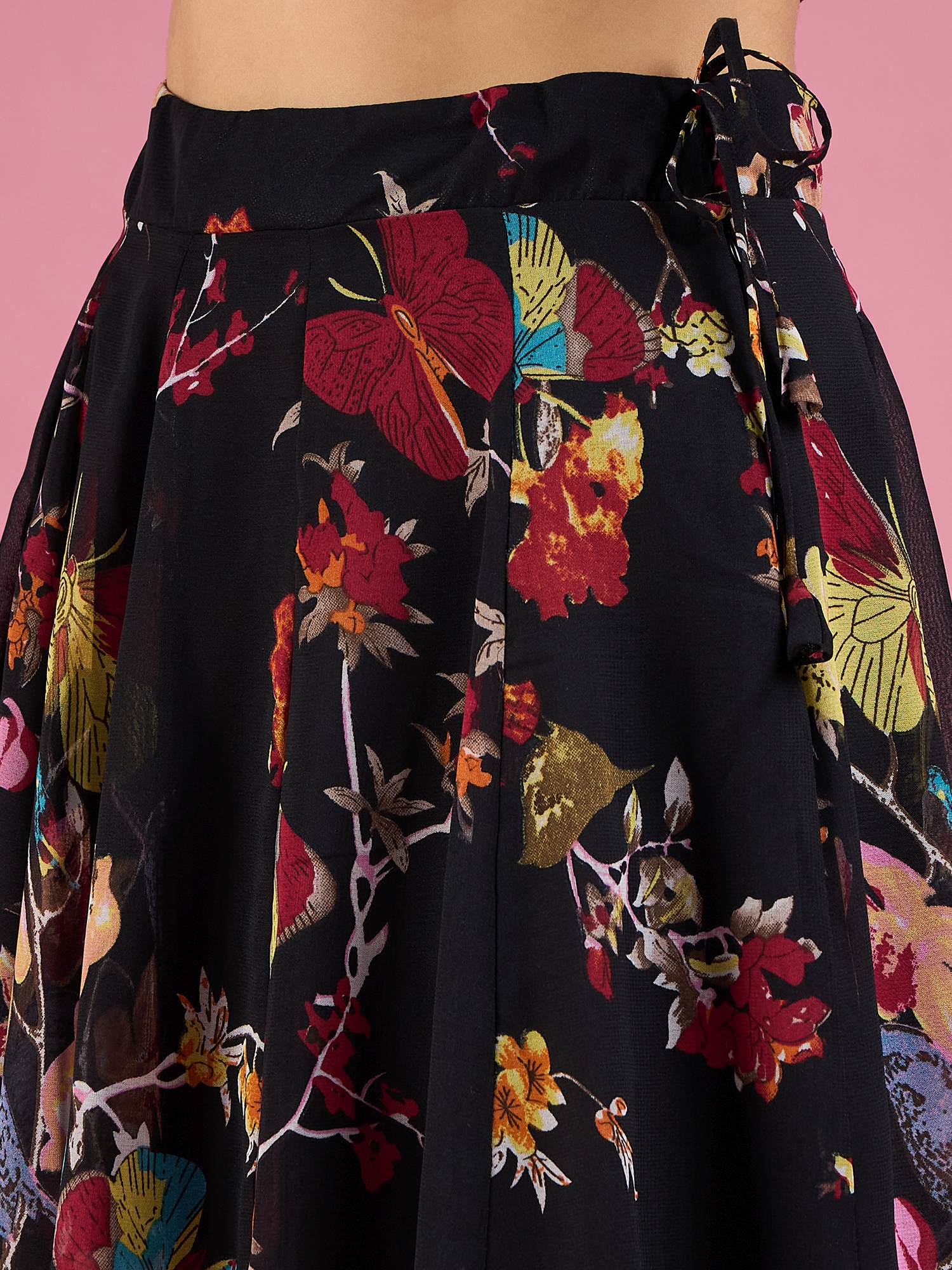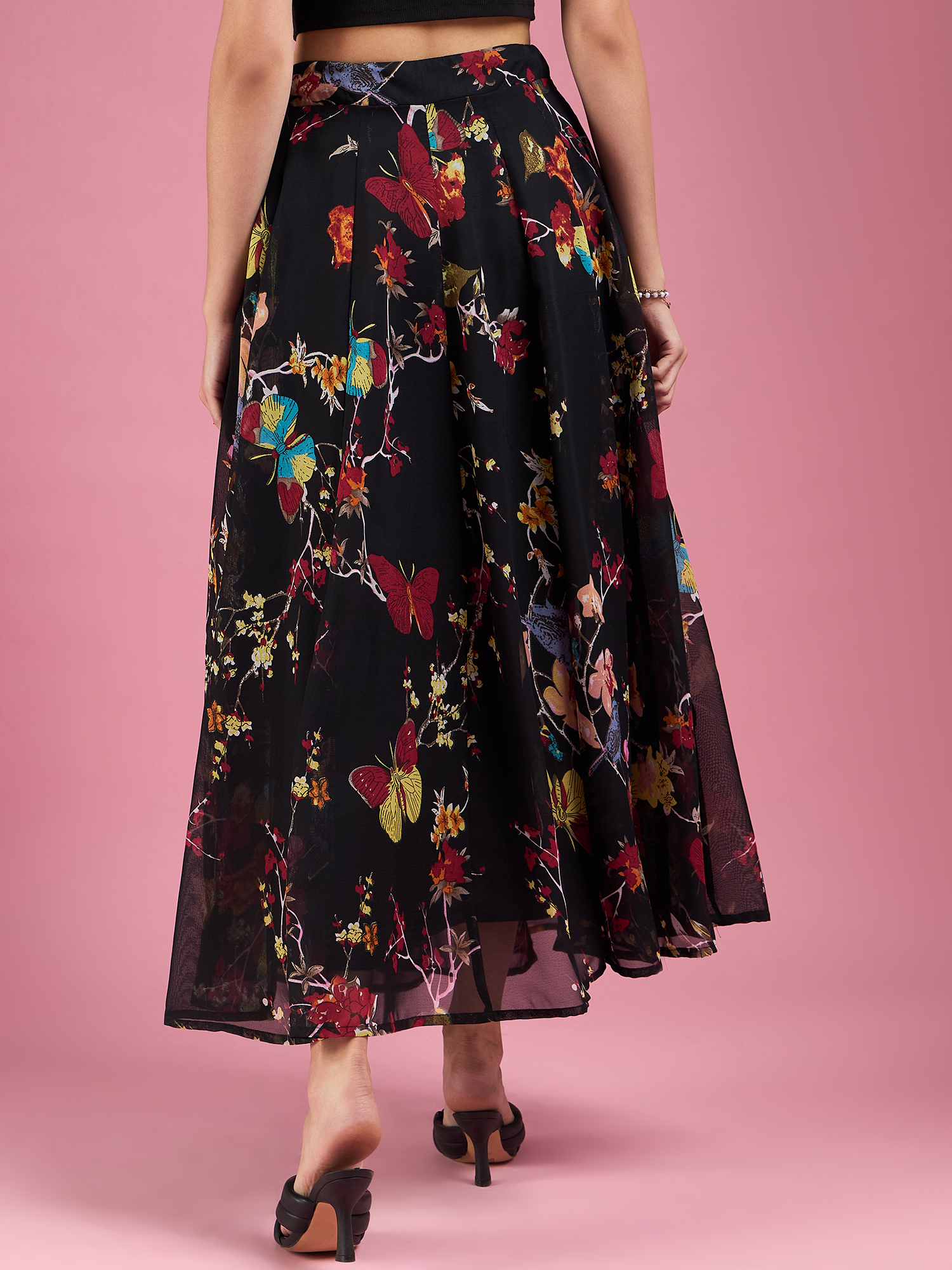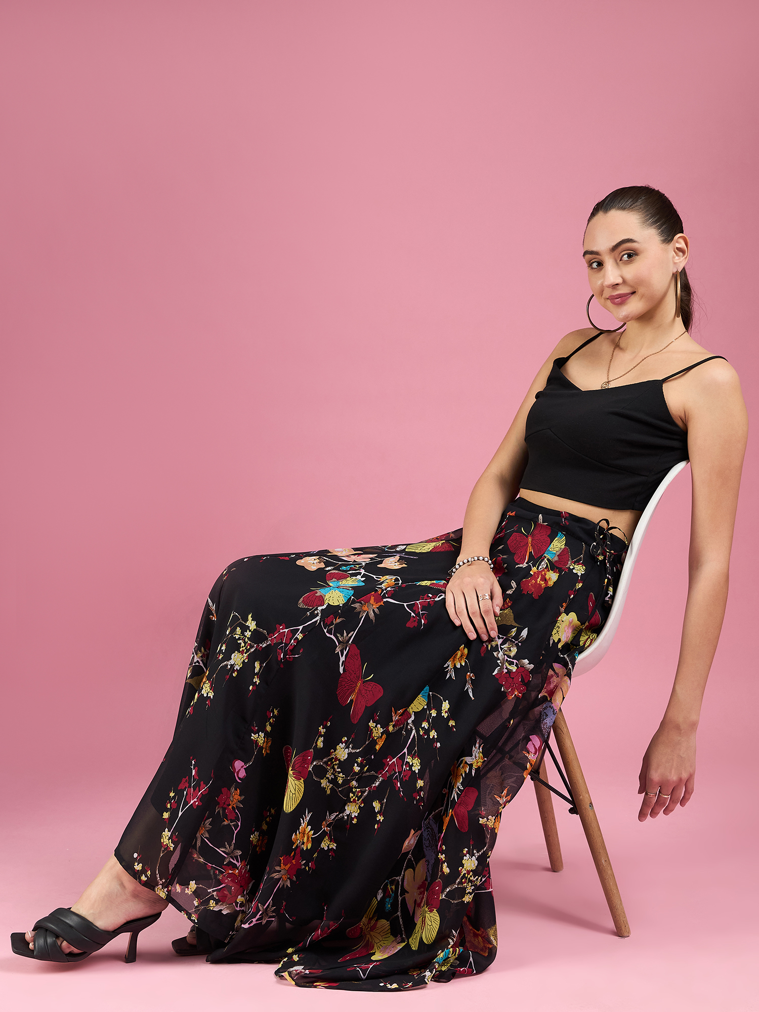 Add a touch of timeless charm to your wardrobe with this floral print black maxi skirt. Featuring a stunning blend of vibrant floral motifs, this flowing skirt is designed for both style and comfort. The high-waisted silhouette flatters the figure, while the lightweight fabric ensures effortless movement. Whether paired with a simple blouse for casual outings or dressed up for a special occasion, this skirt is a versatile staple.