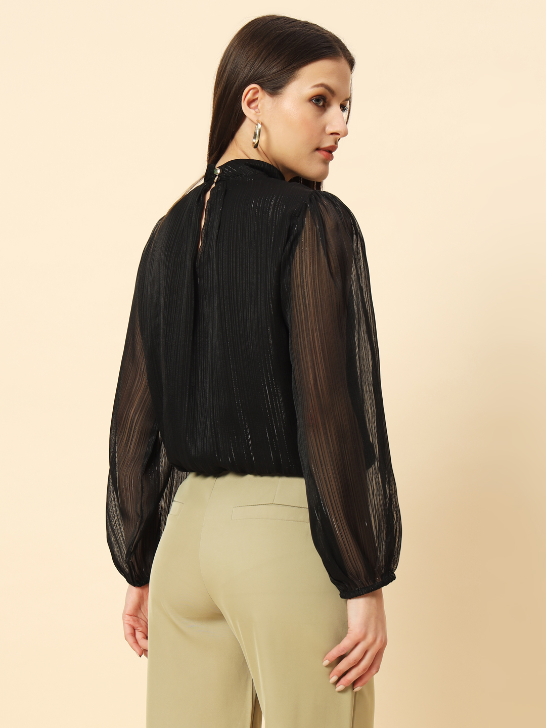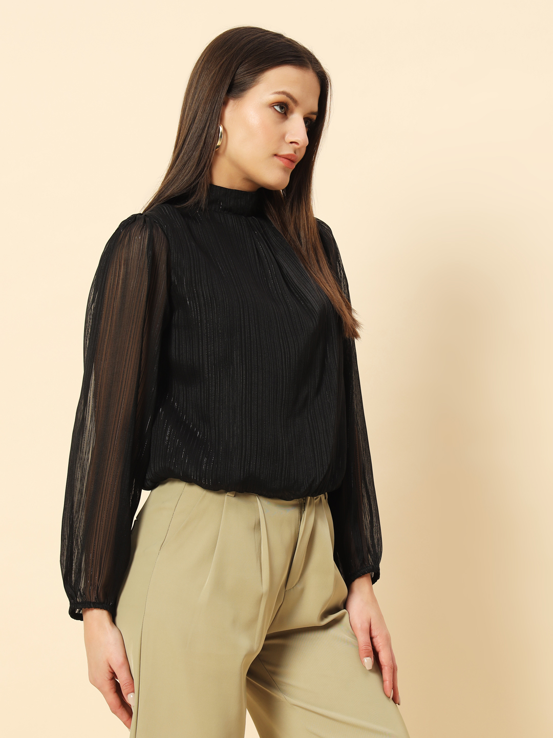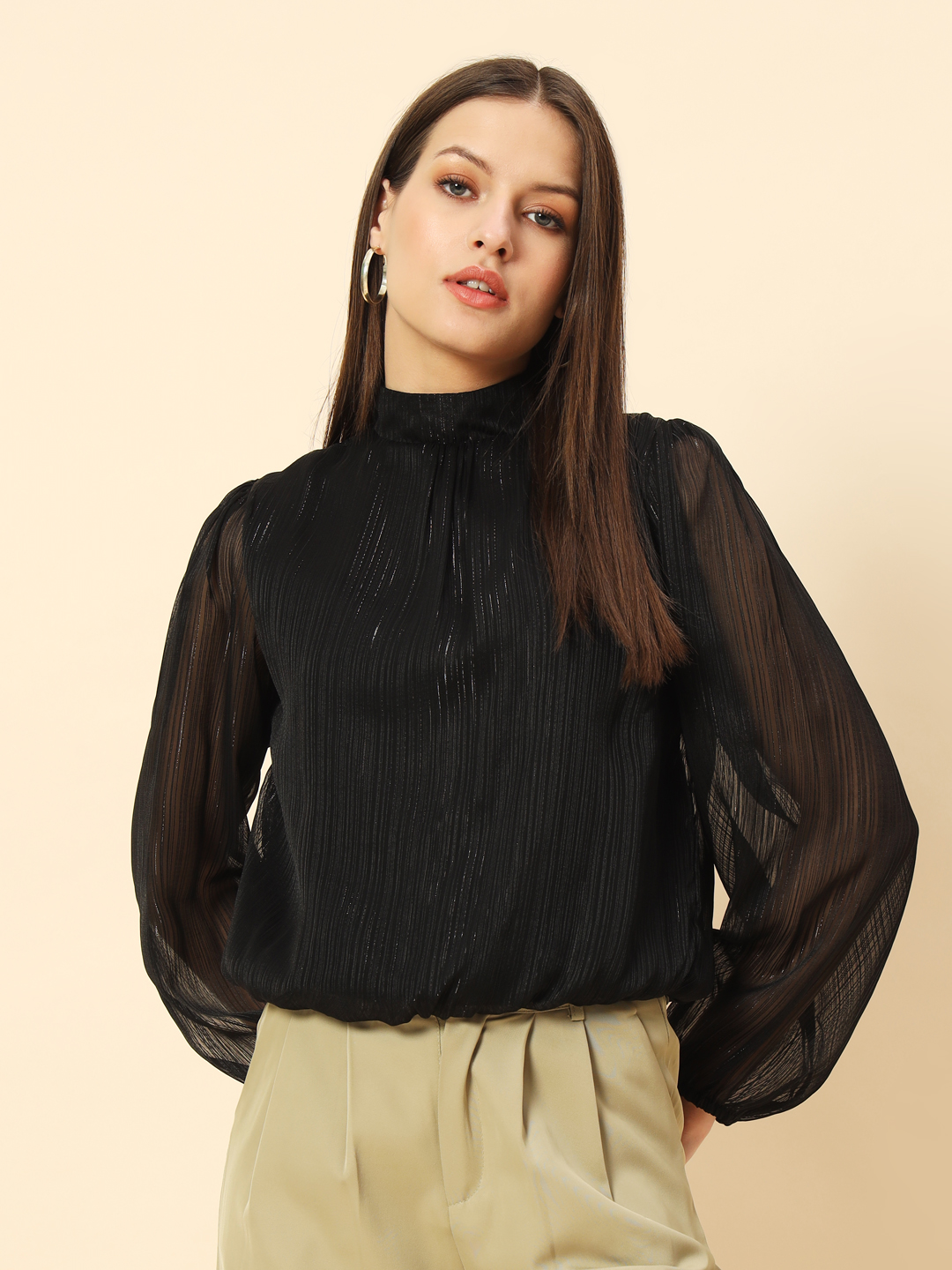 Deewa Elegant Black Pleated Long-Sleeve Blouse