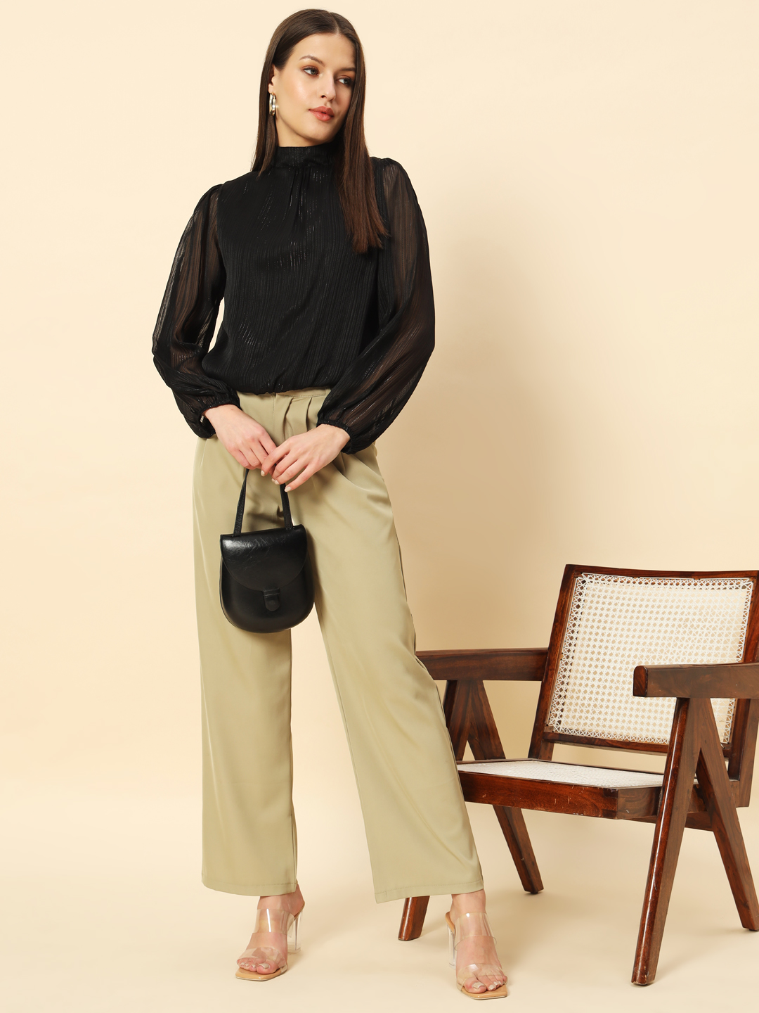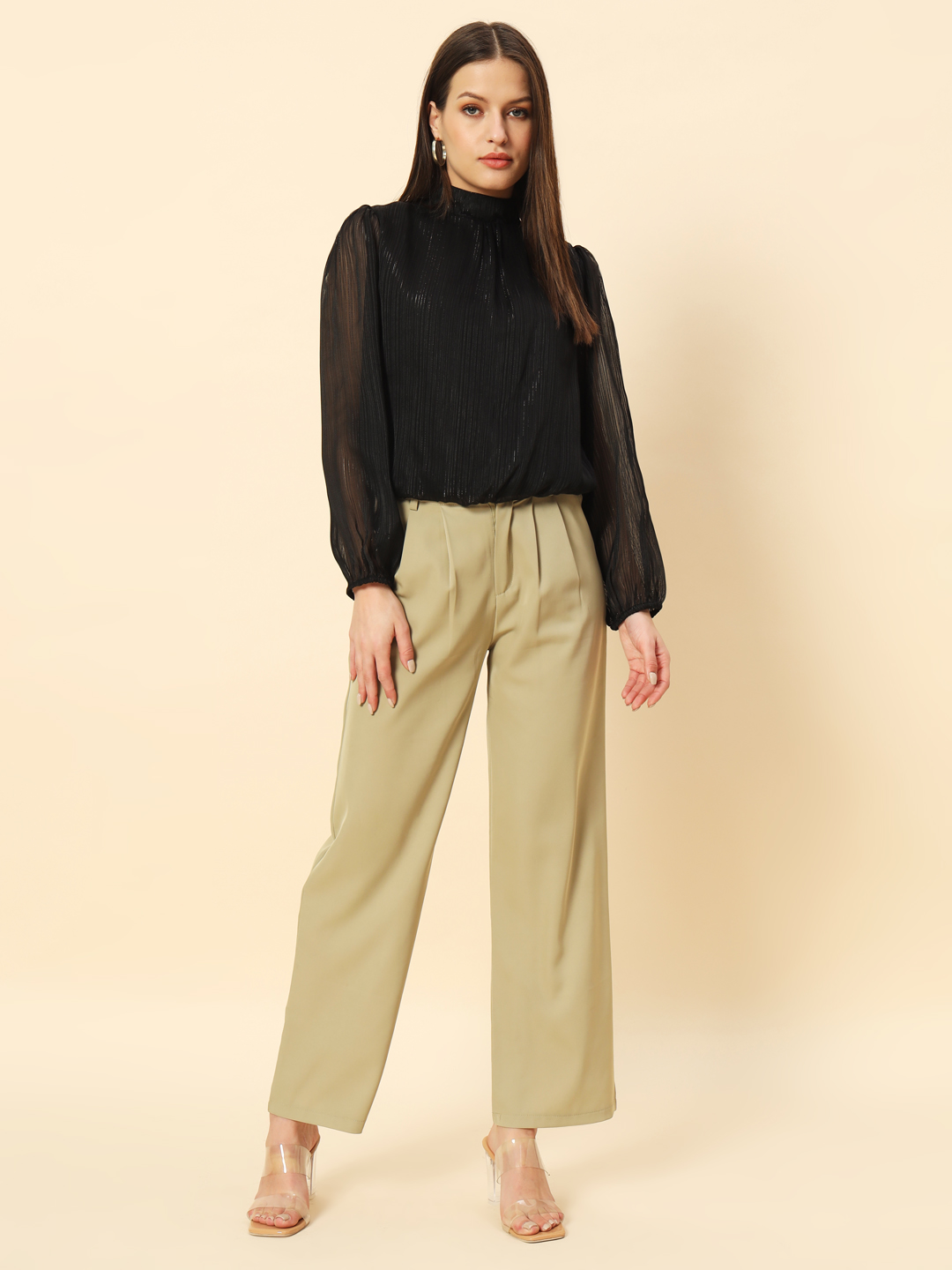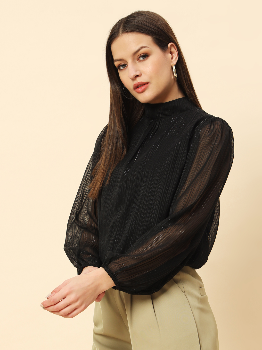 Deewa Elegant Black Pleated Long-Sleeve Blouse