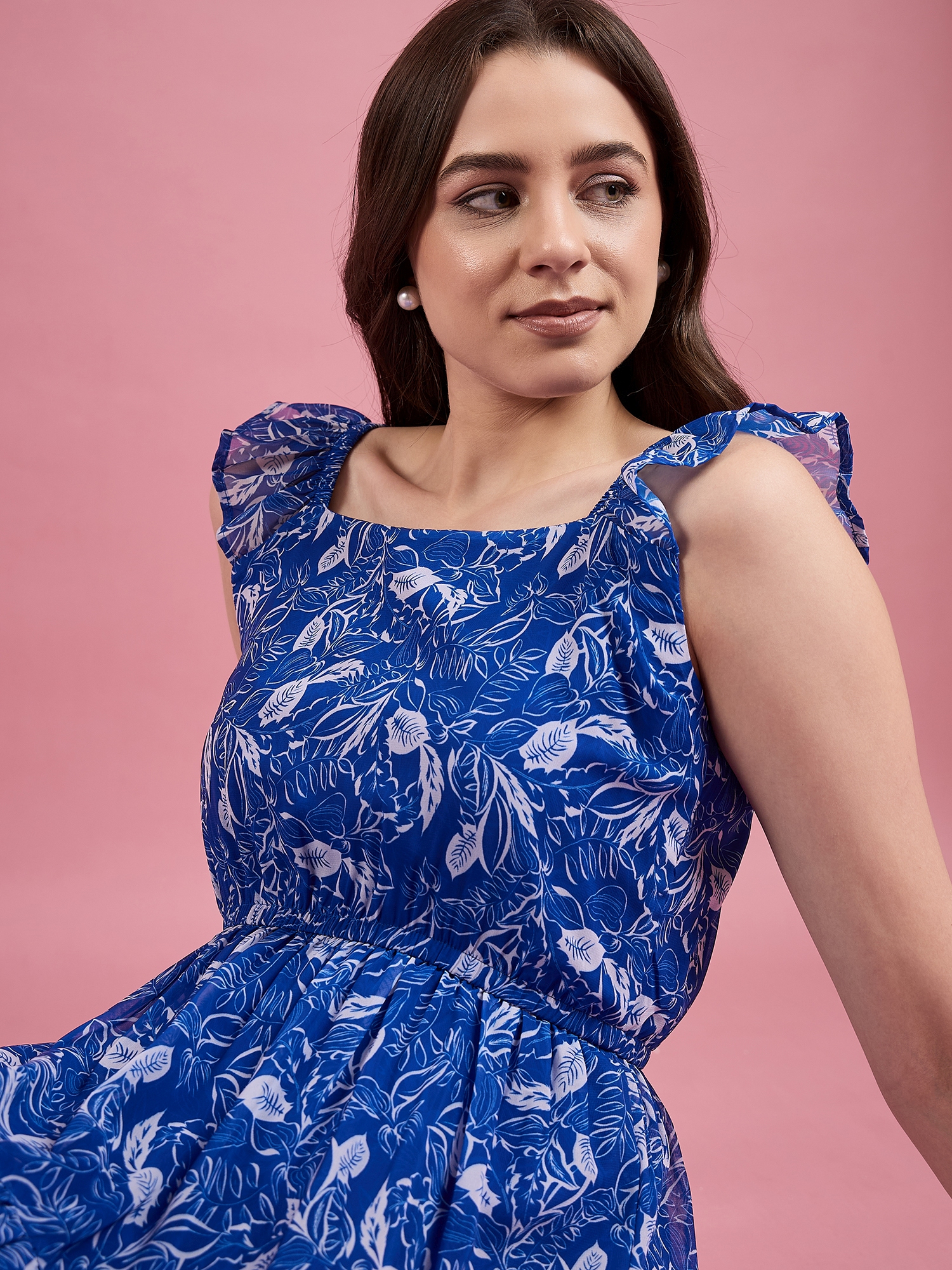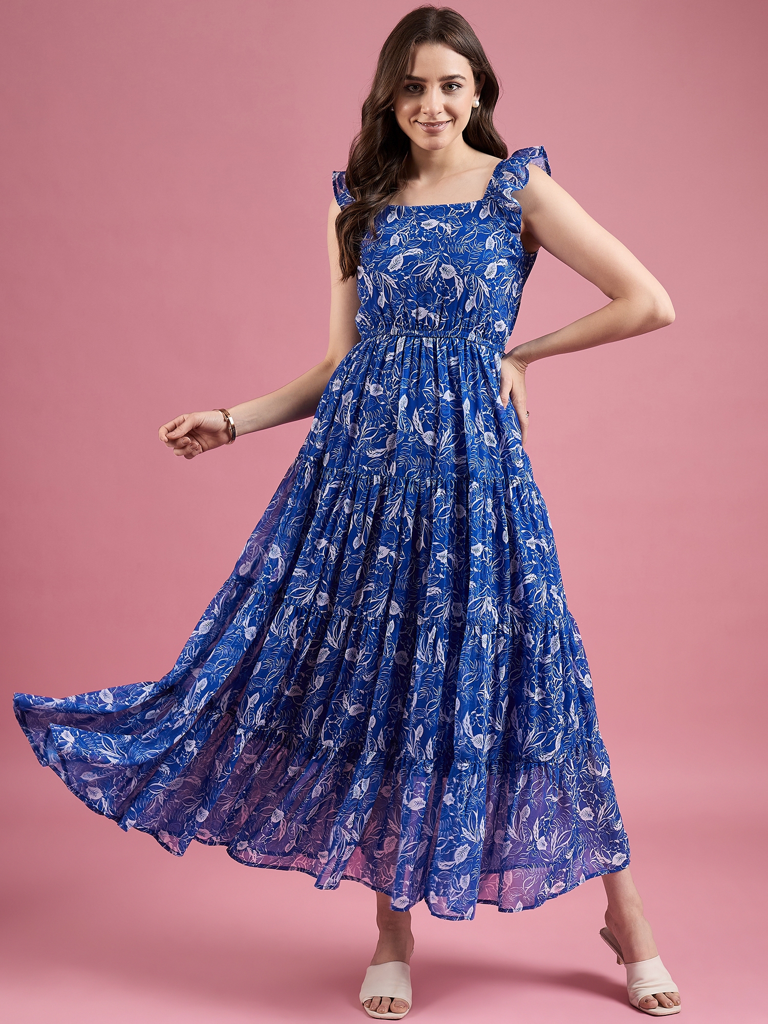 Deewa Elegant Blue Floral Printed Square Neck Empire Maxi Dress
