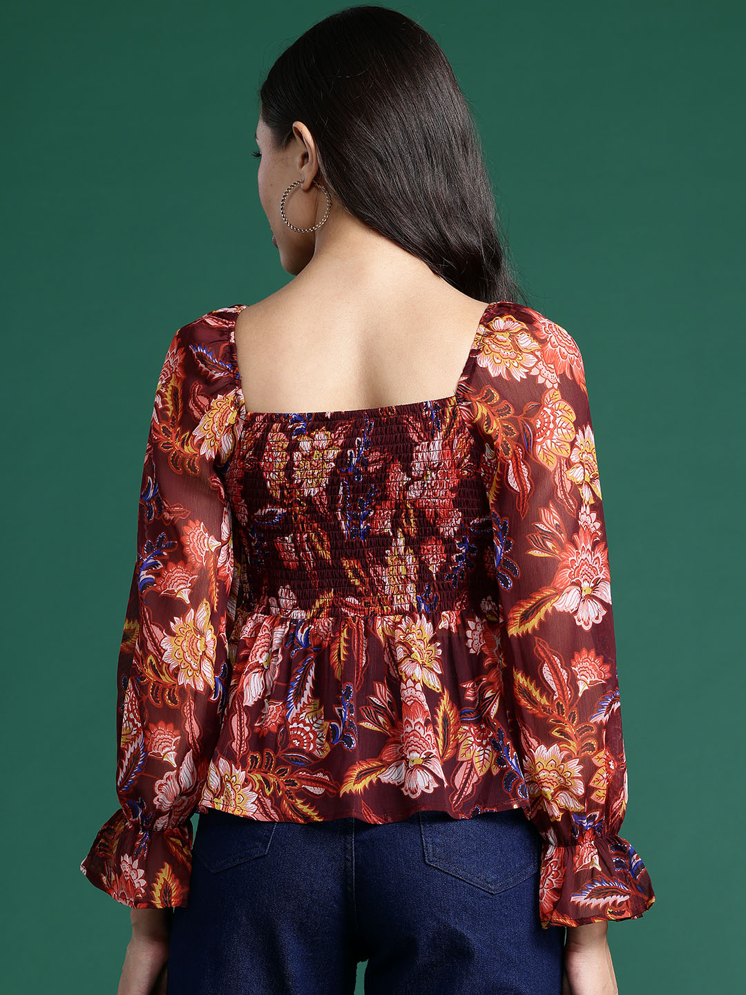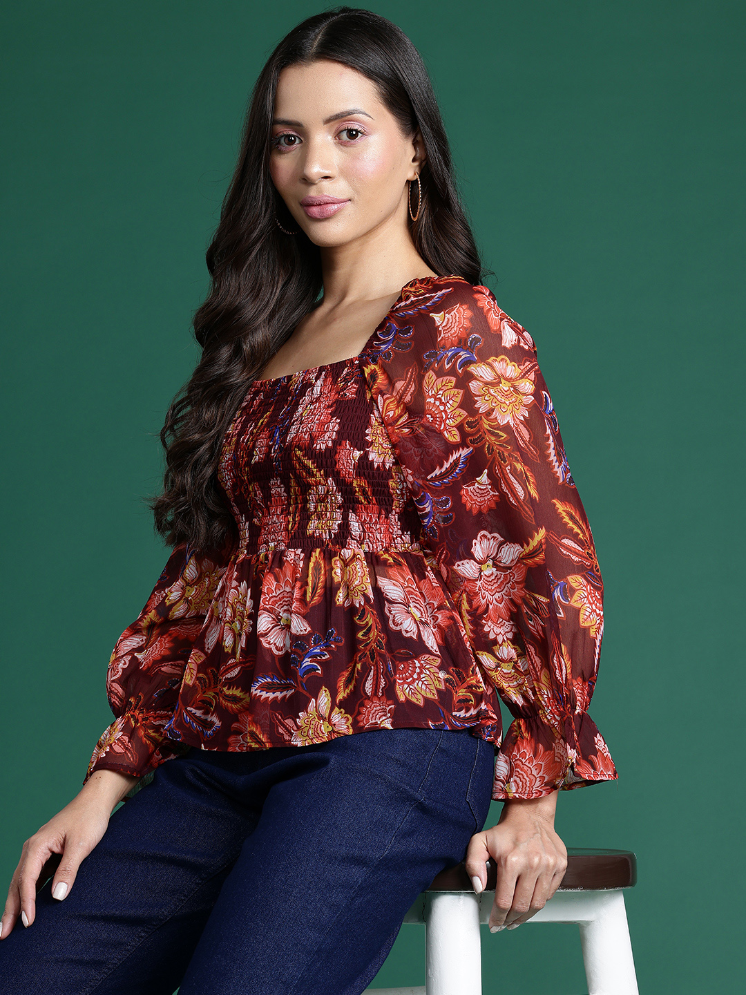 Embrace timeless femininity with this maroon floral smocked peplum blouse, featuring delicate multicolor floral prints that add a touch of romance to any outfit. Designed with a flattering square neckline and long, billowy sleeves with elastic cuffs, this blouse ensures both style and comfort. The smocked bodice creates a structured yet flexible fit, while the peplum hem enhances the elegant silhouette. Perfect for casual outings, brunch, or special occasions, this top is a must-have fashion essential.