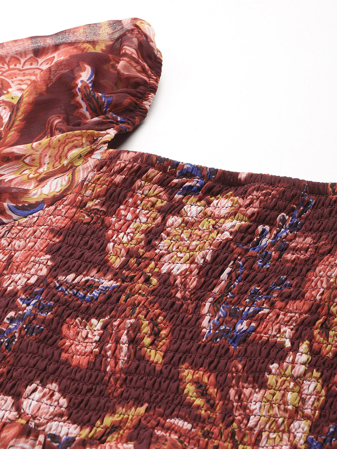 This Maroon floral smocked peplum blouse is ideal for multiple occasions. Whether you’re heading out for a relaxed brunch, a casual gathering, or dressing up for a daytime event, its romantic floral print and structured design create an effortlessly elegant look. Pair it with jeans for a laid-back style or skirts for a dressier ensemble. Add delicate accessories and heels for an elevated outfit perfect for evening dinners or celebrations.