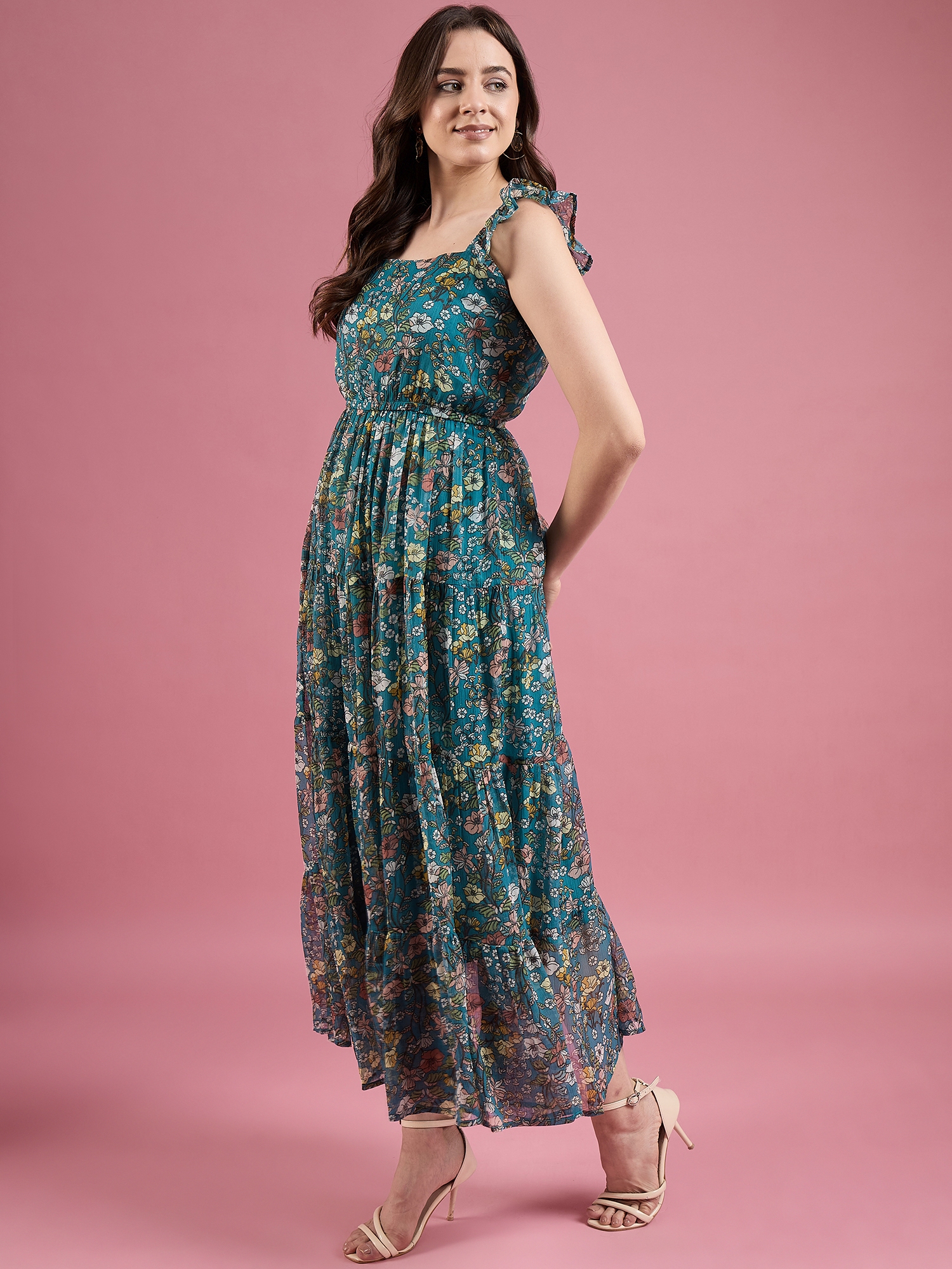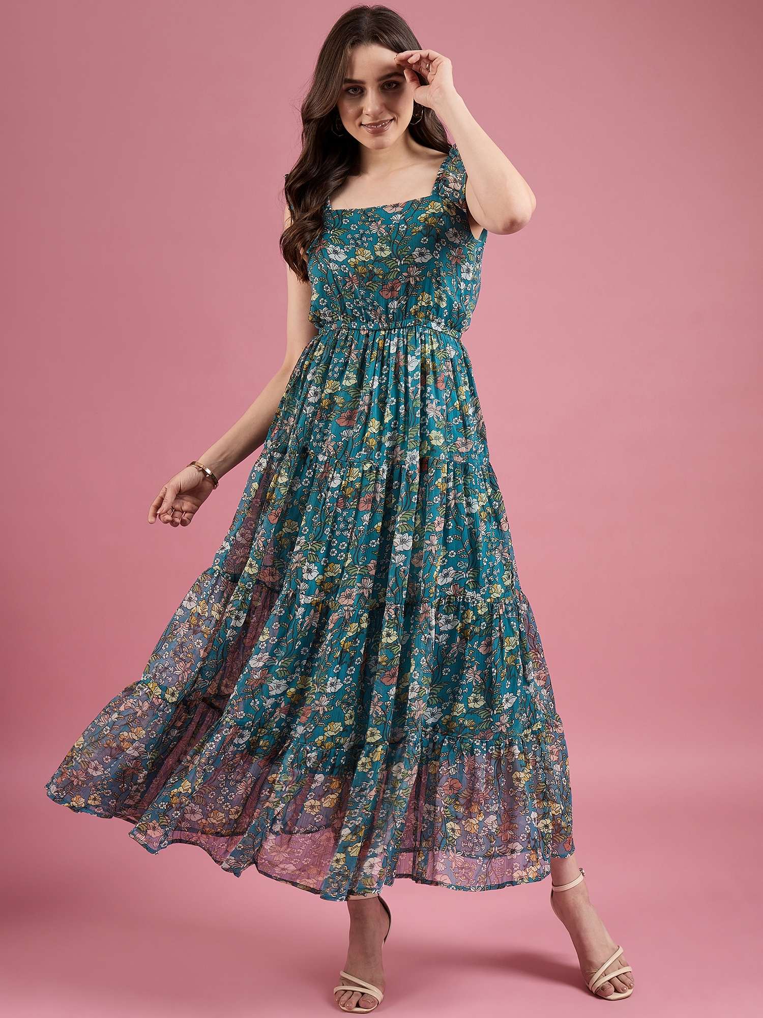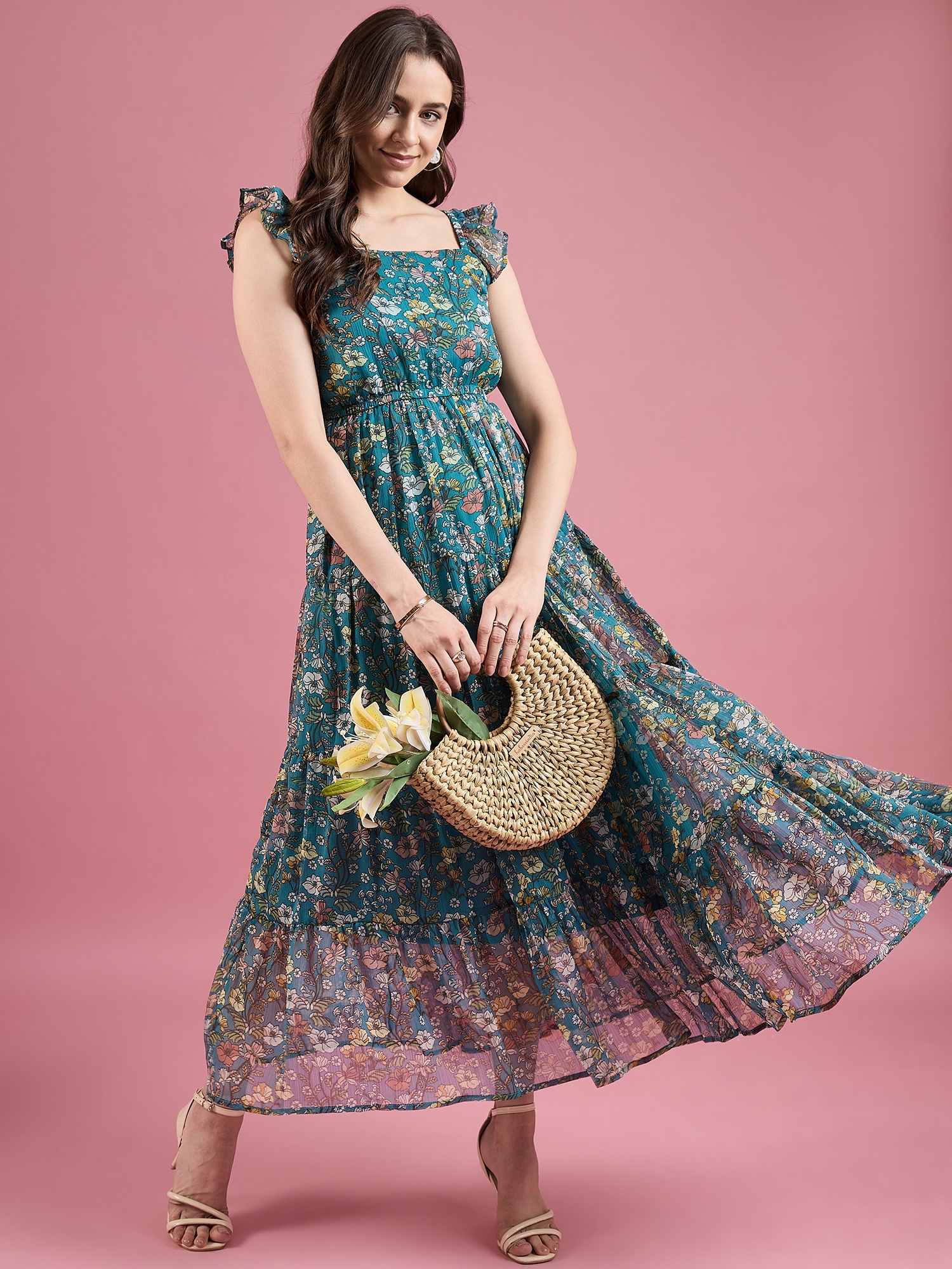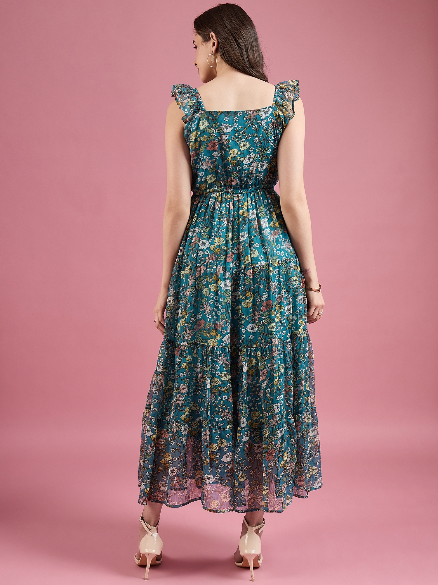 Deewa Elegant Sea Green Floral Printed Square Neck Empire Maxi Dress