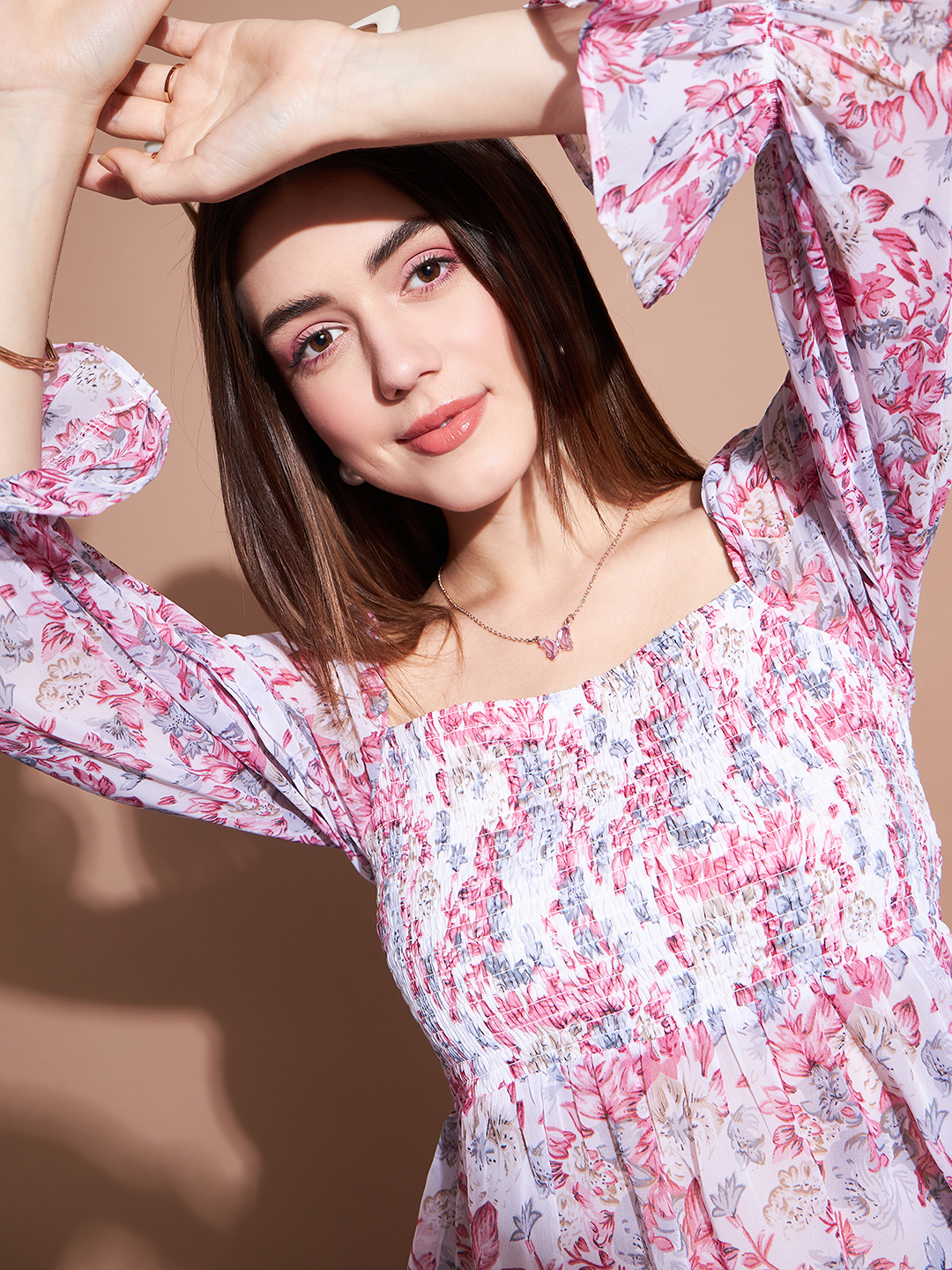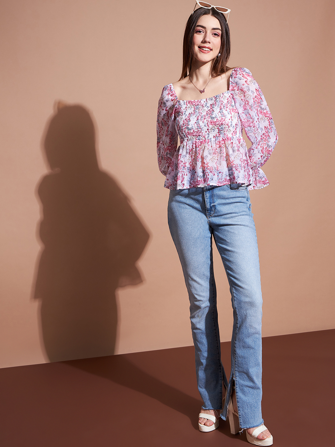 Embrace timeless femininity with this white floral smocked peplum blouse, featuring delicate multicolor floral prints that add a touch of romance to any outfit. Designed with a flattering square neckline and long, billowy sleeves with elastic cuffs, this blouse ensures both style and comfort. The smocked bodice creates a structured yet flexible fit, while the peplum hem enhances the elegant silhouette. Perfect for casual outings, brunch, or special occasions, this top is a must-have fashion essential.