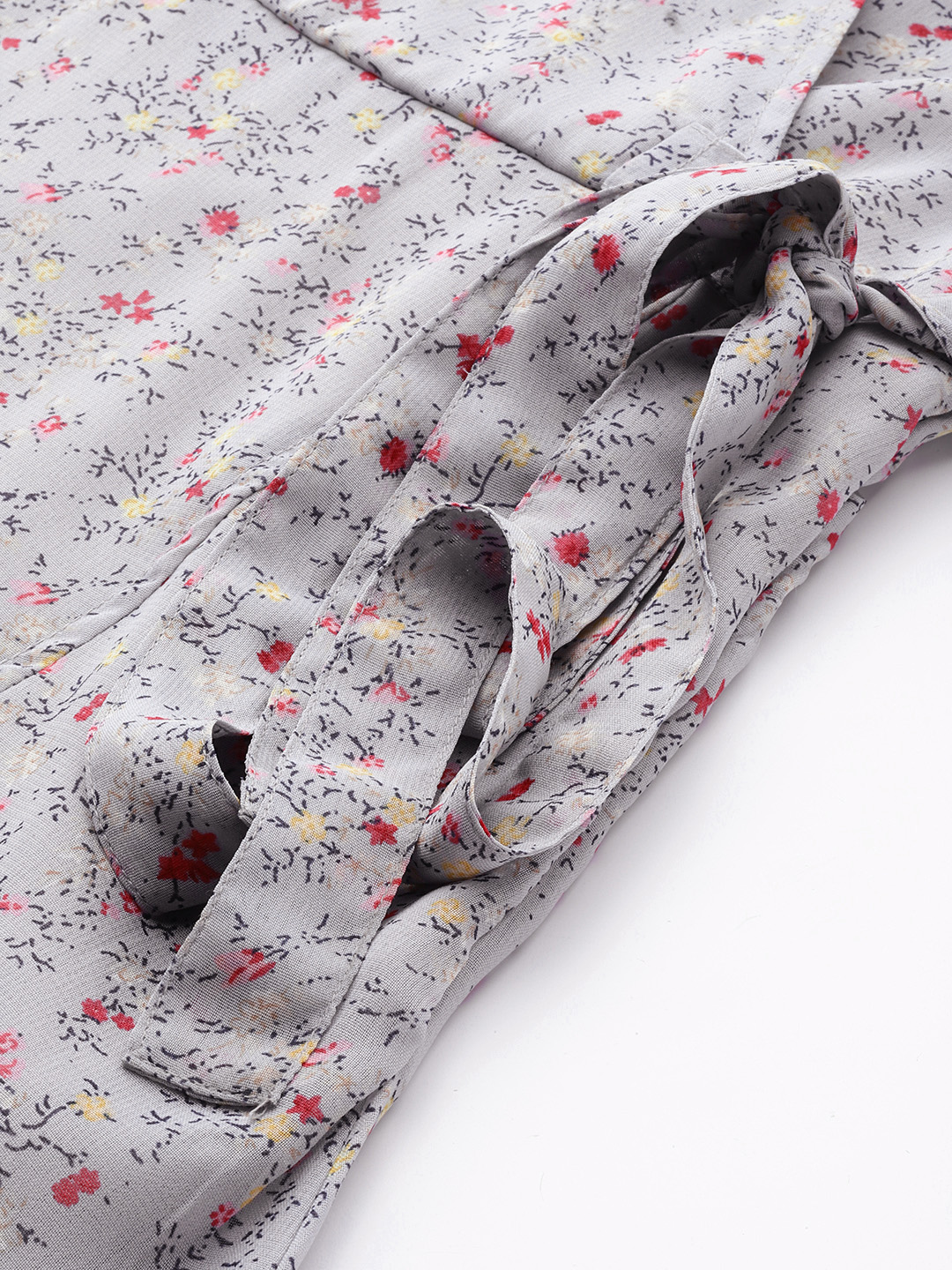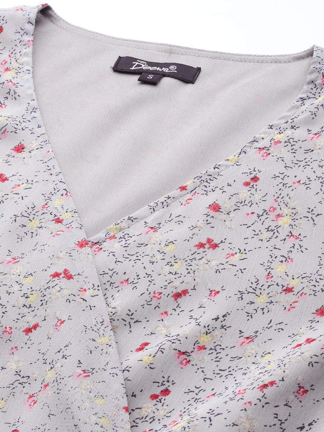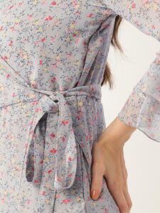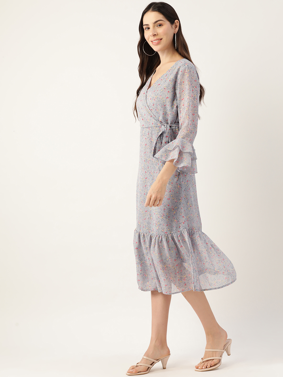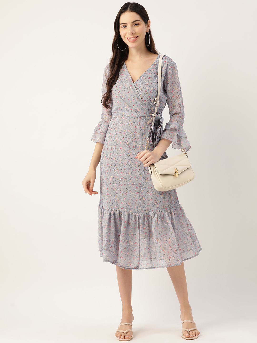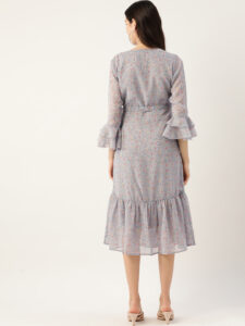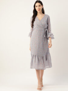 Elevate your everyday wardrobe with this chic Grey floral midi dress. Designed in soft chiffon, this dress features a flattering V-neckline and elegant 3/4 bell sleeves that add a romantic flair. The floral print in delicate shades of pink offers a subtle pop of color, while the tiered hemline enhances the graceful silhouette. Perfect for work, brunches, or evening strolls, this dress effortlessly blends style with comfort.