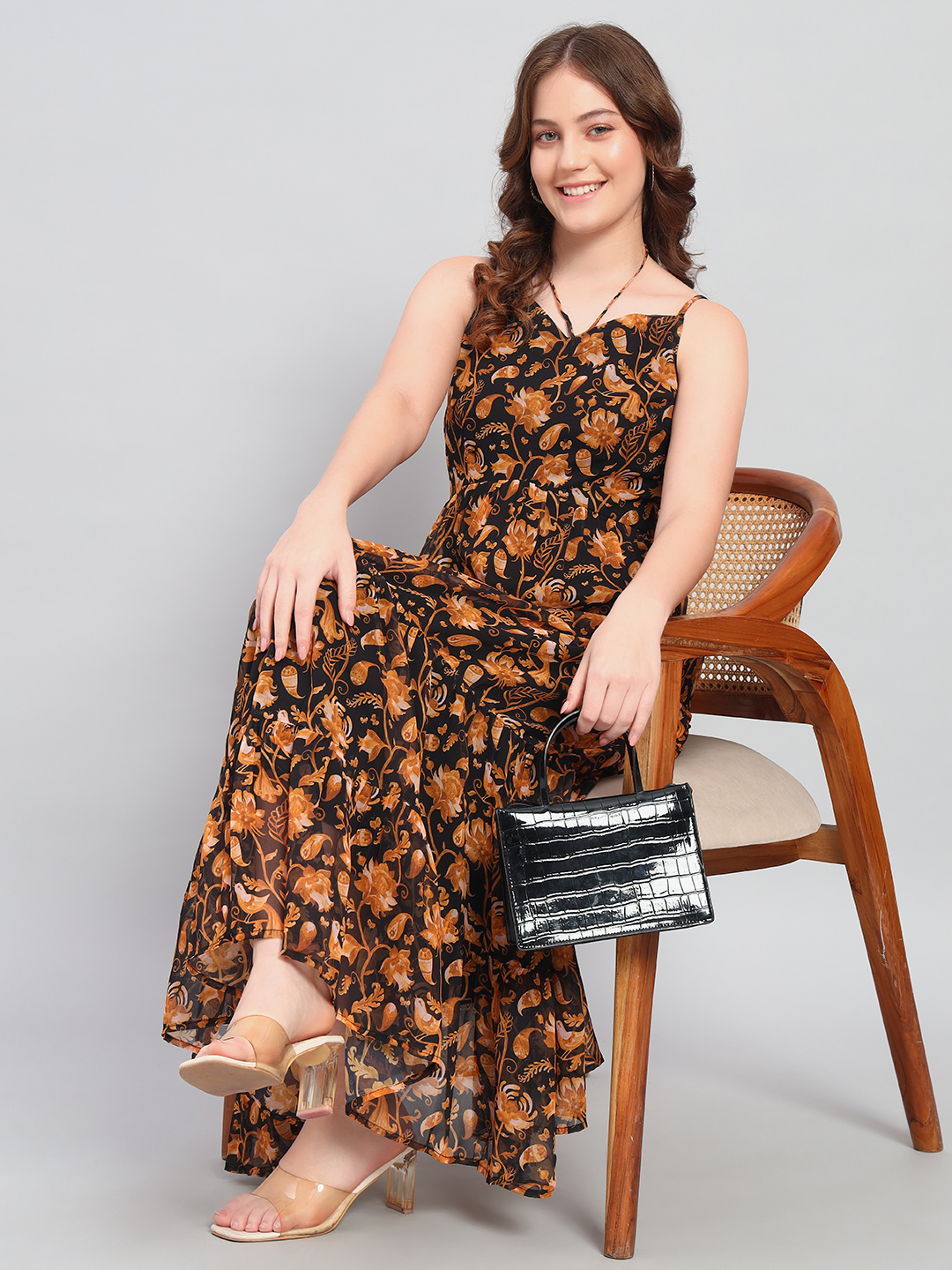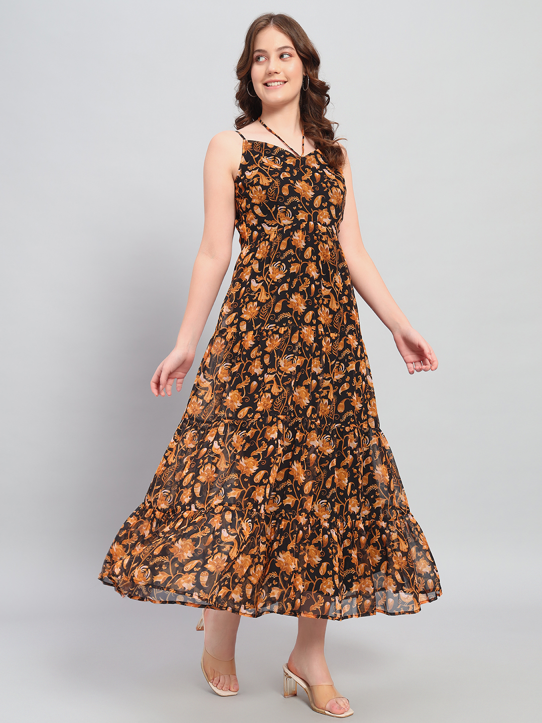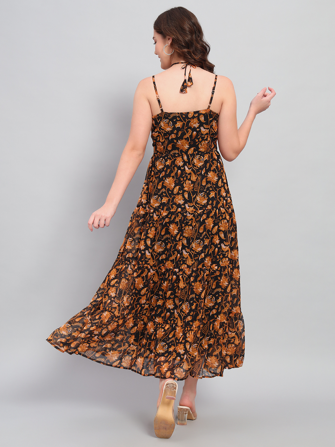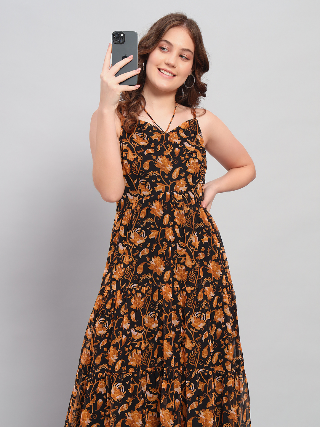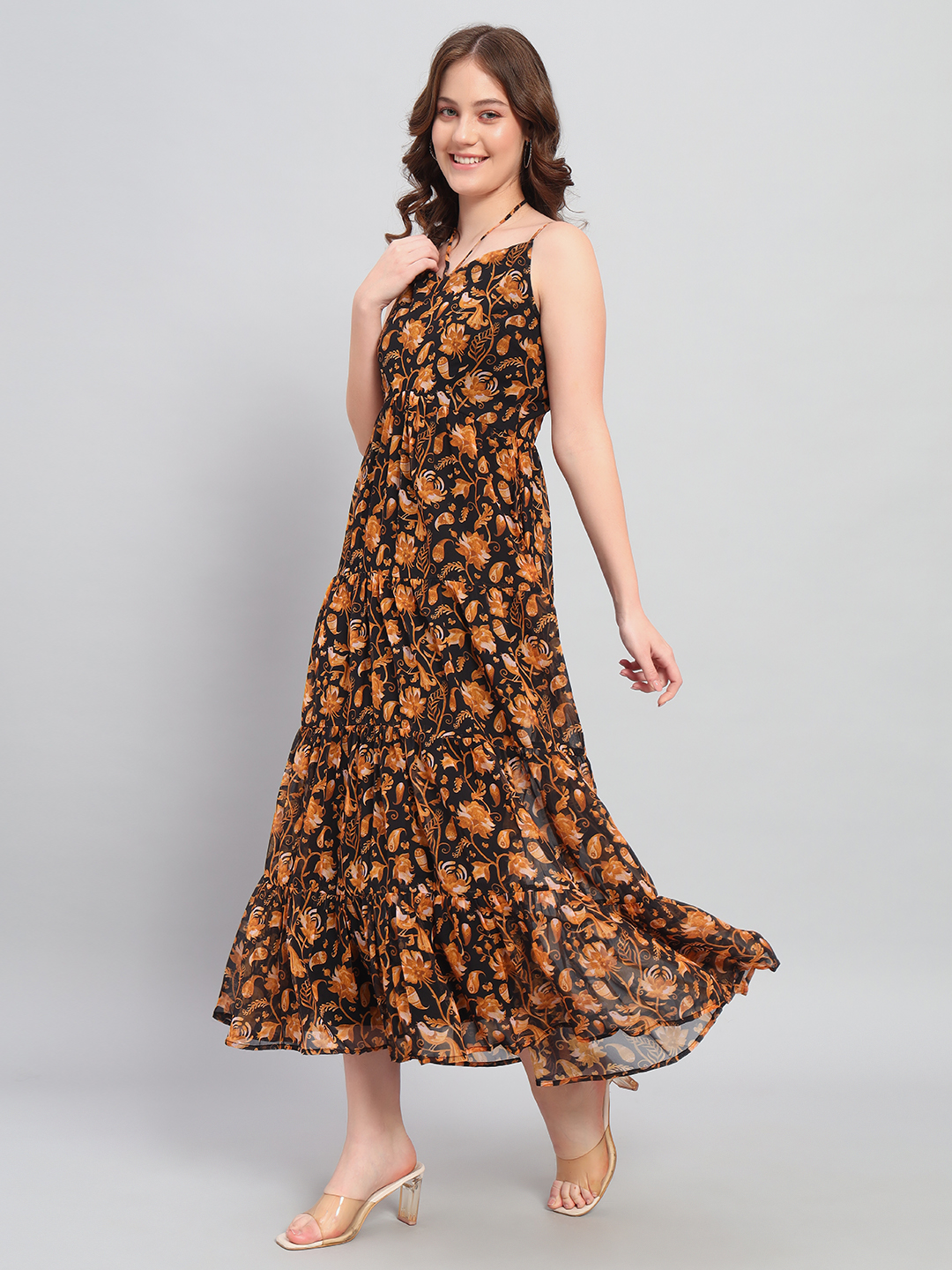 Deewa Mustard Floral Printed Tie-up Neck Sleeveless Maxi Dress