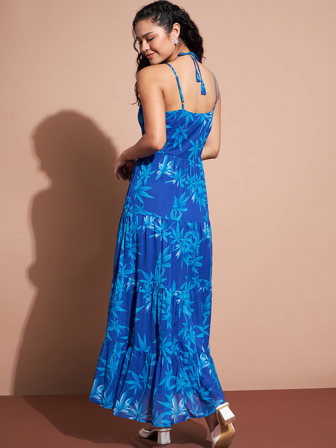 Embrace the essence of summer with this Tropical Floral Maxi Dress, featuring a stunning Navy Blue base adorned with navy and Blue floral prints. The sleeveless design and V-neckline add a touch of elegance, while the tiered skirt provides a flowy and comfortable fit. Perfect for casual outings or beach vacations, this dress ensures effortless style and all-day comfort.