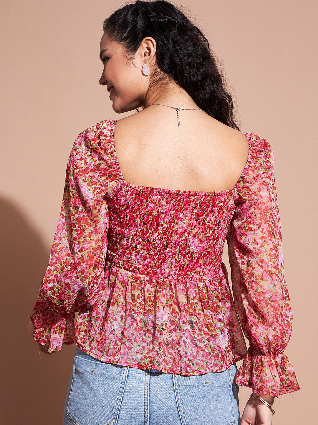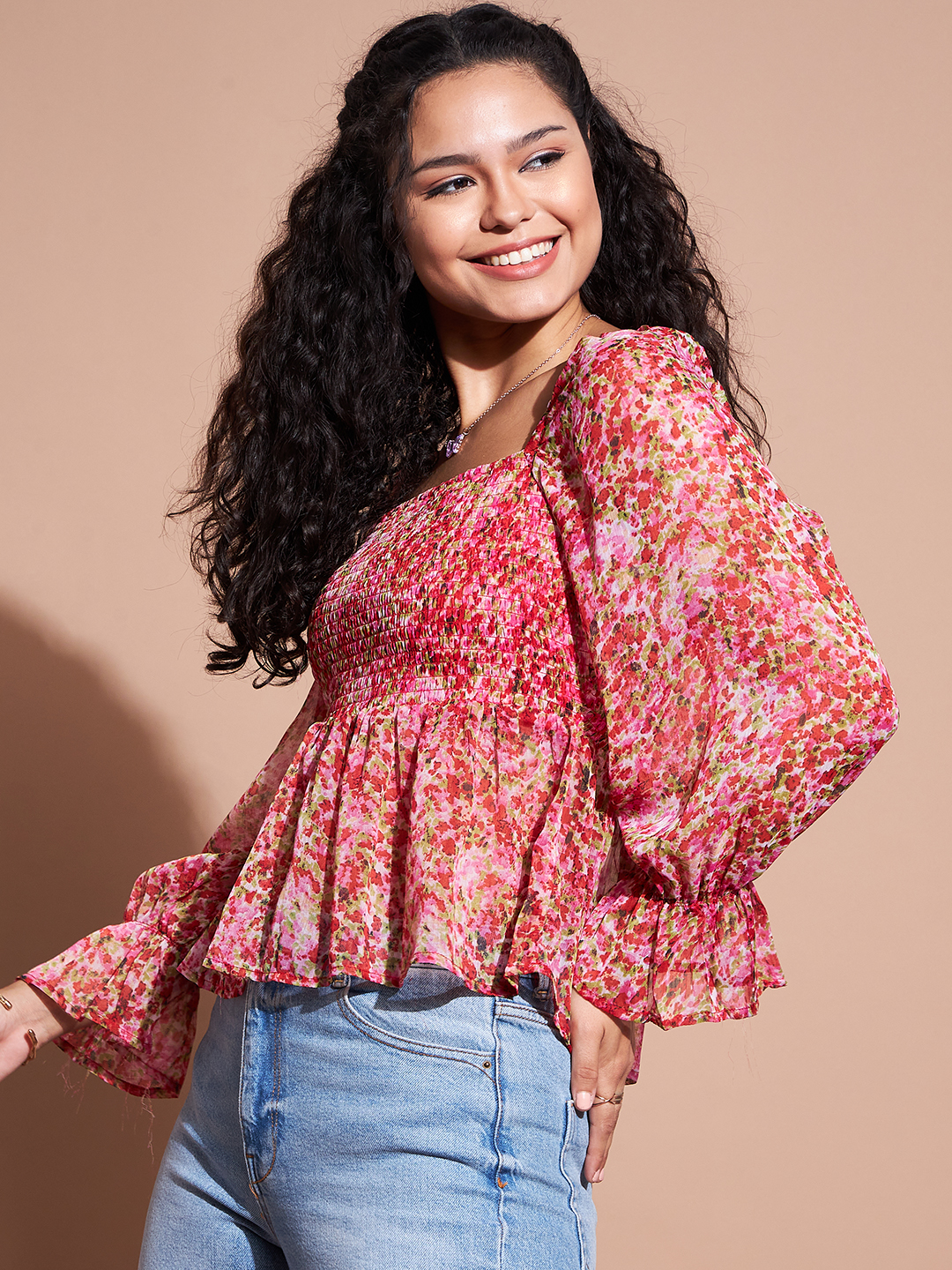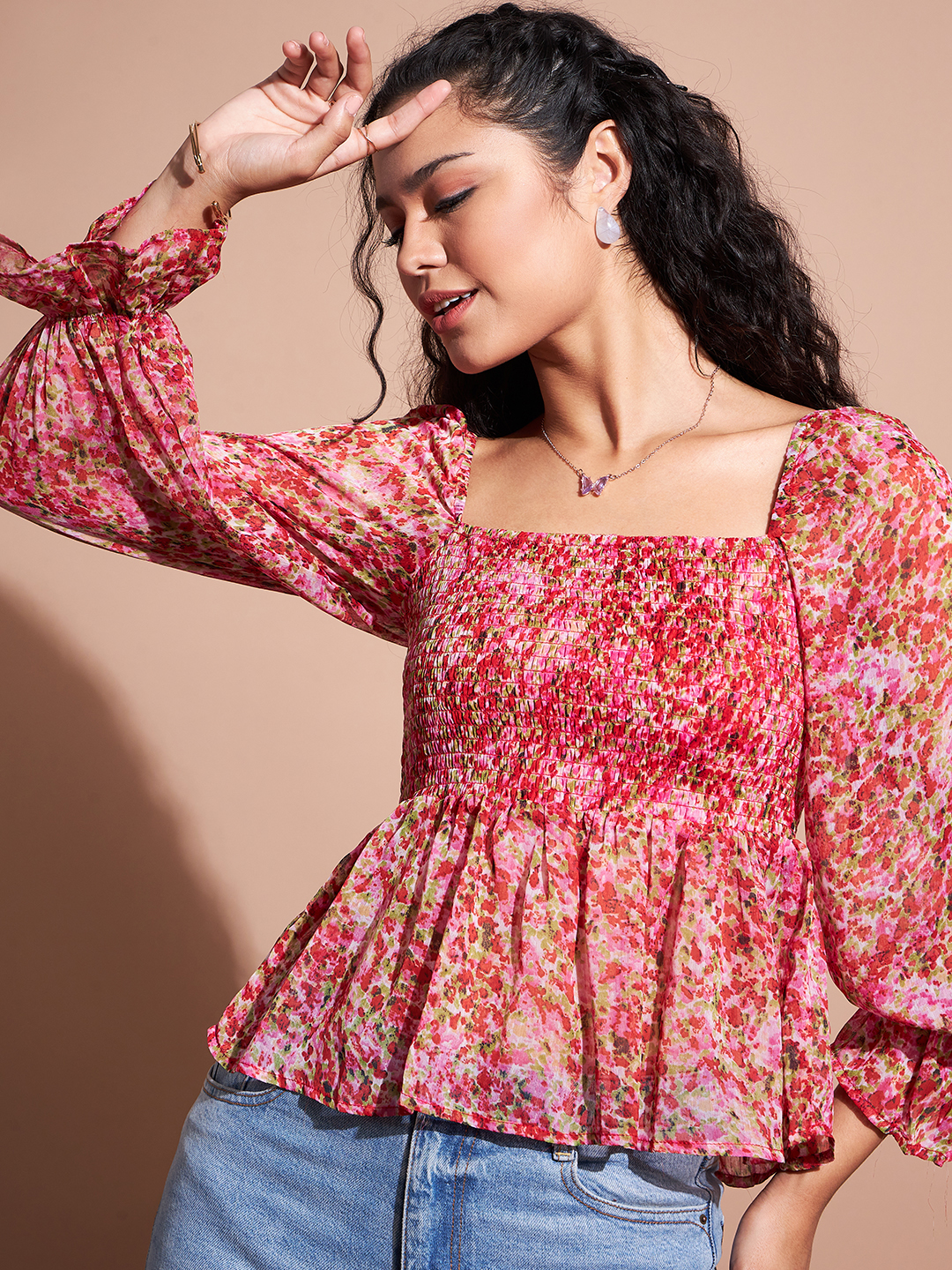 Deewa Pink Romantic Floral Print Smocked Peplum Blouse