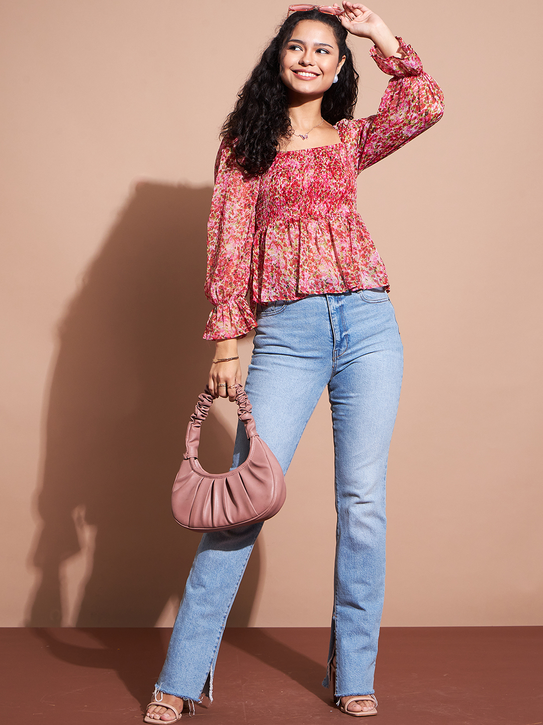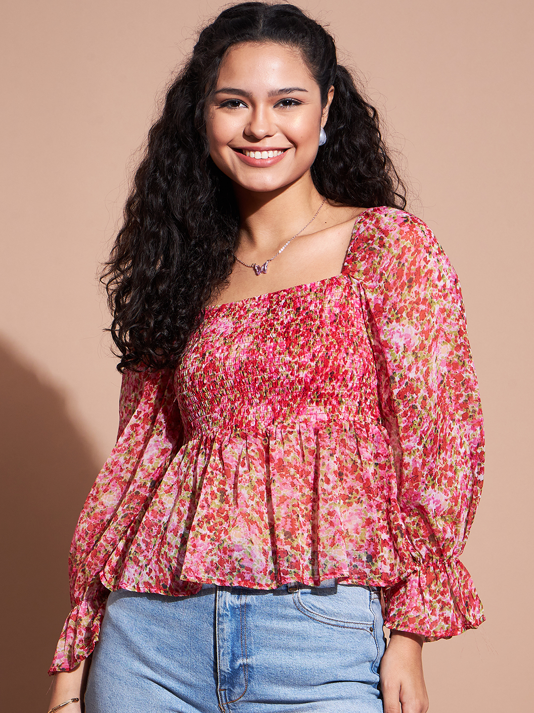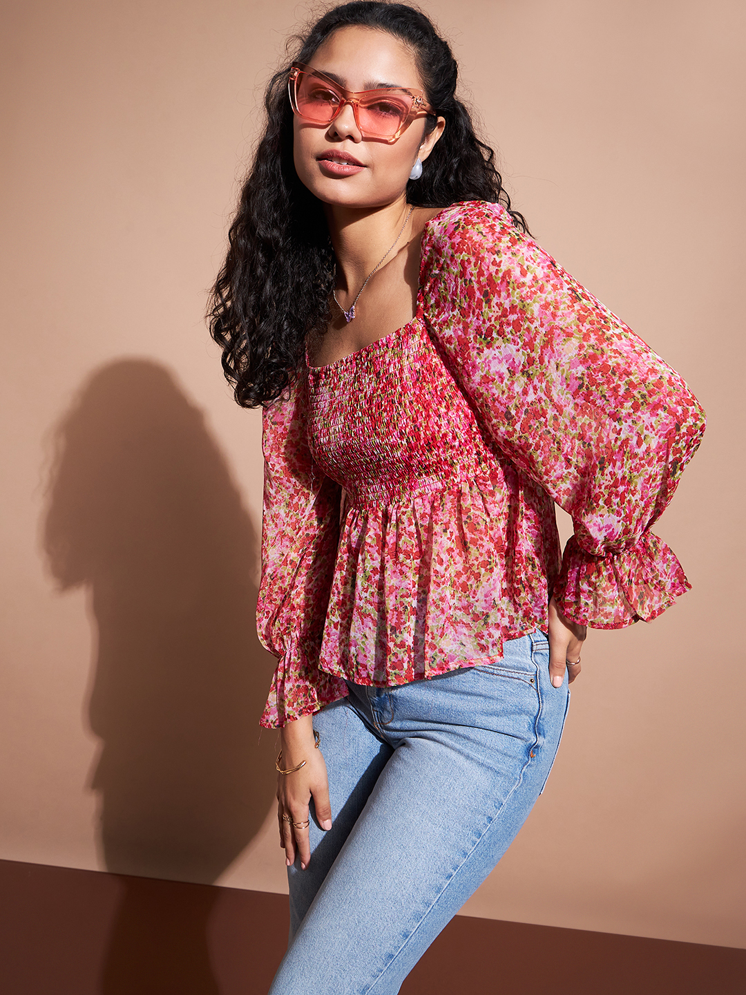 Deewa Pink Romantic Floral Print Smocked Peplum Blouse