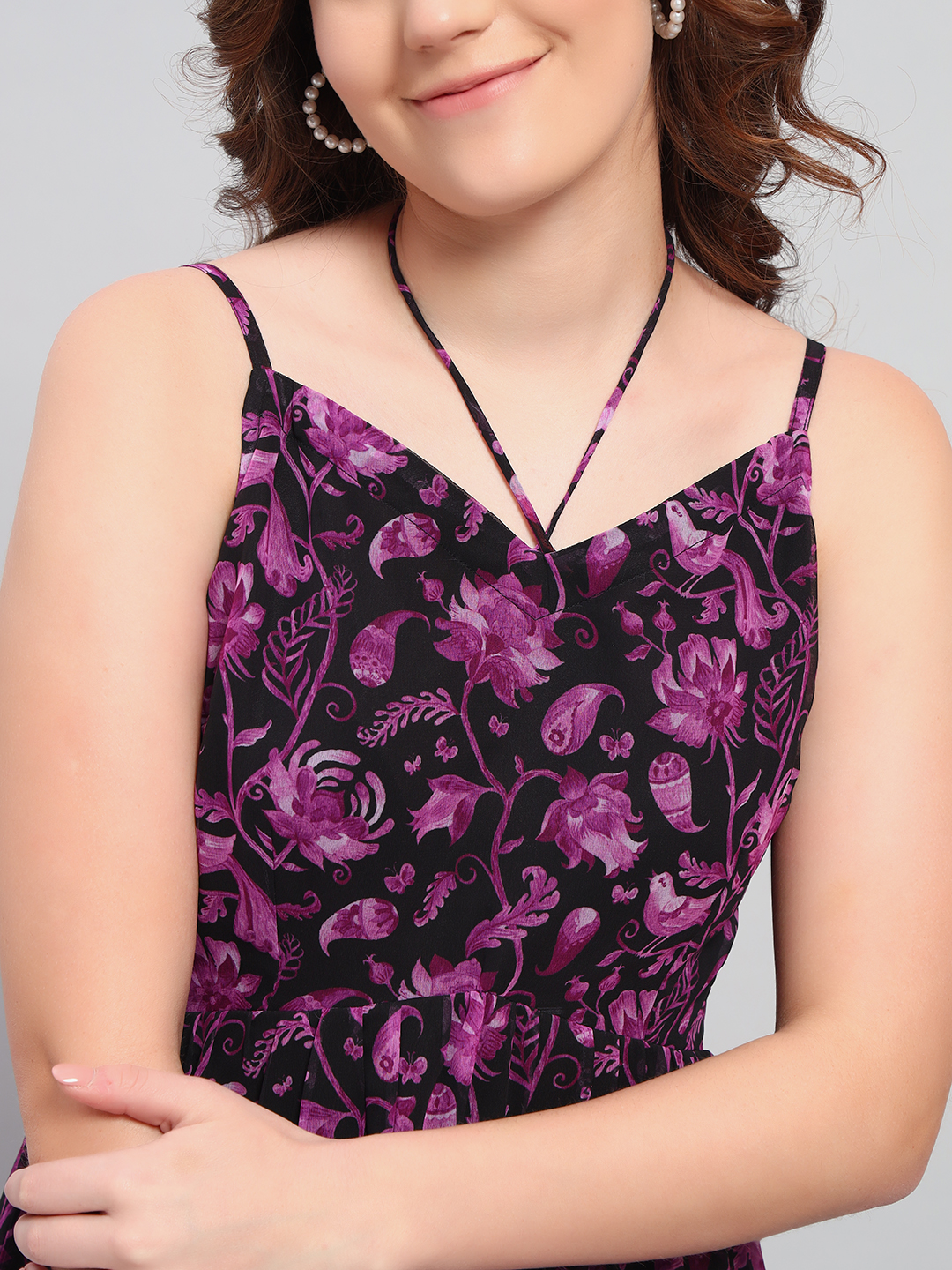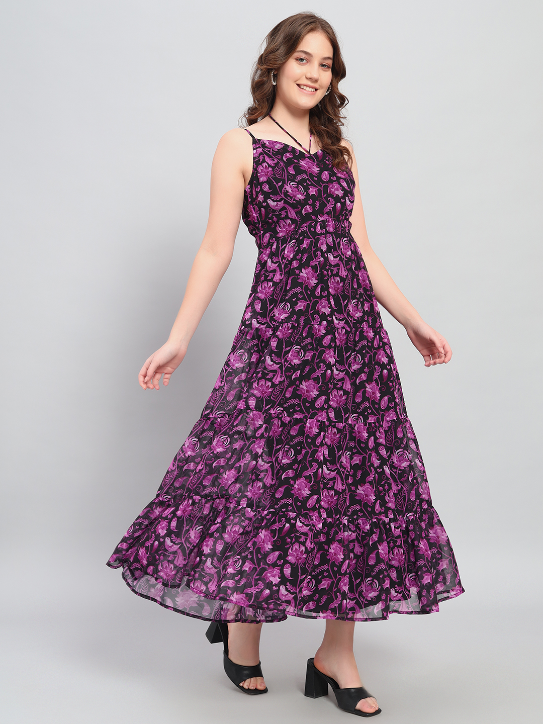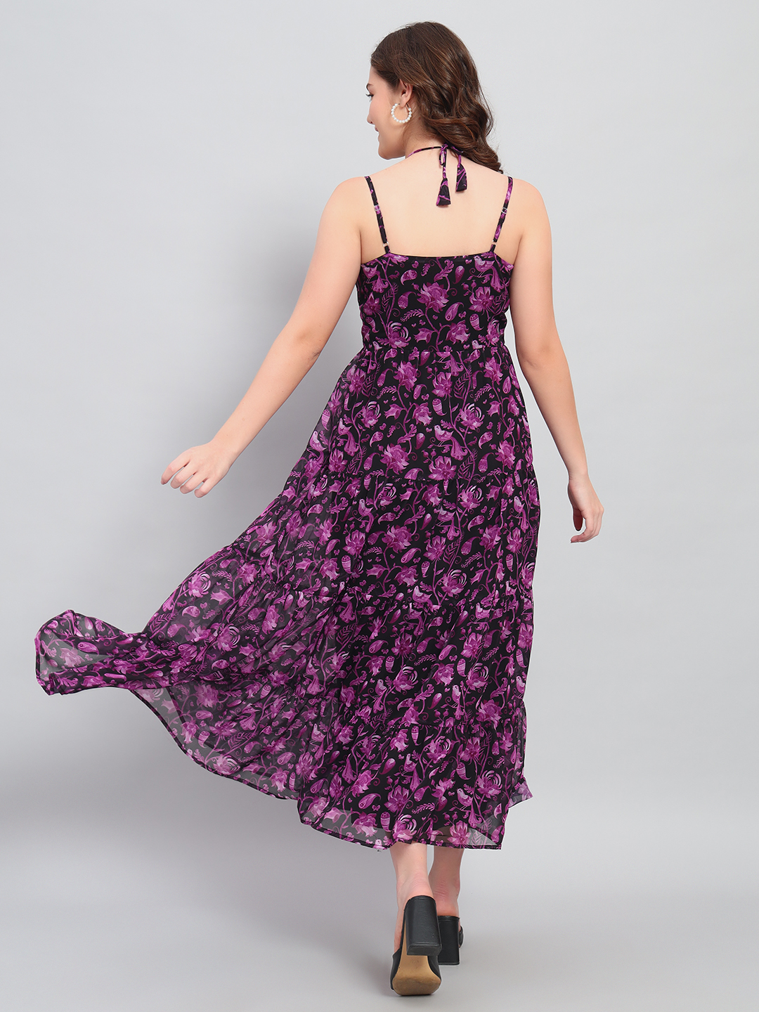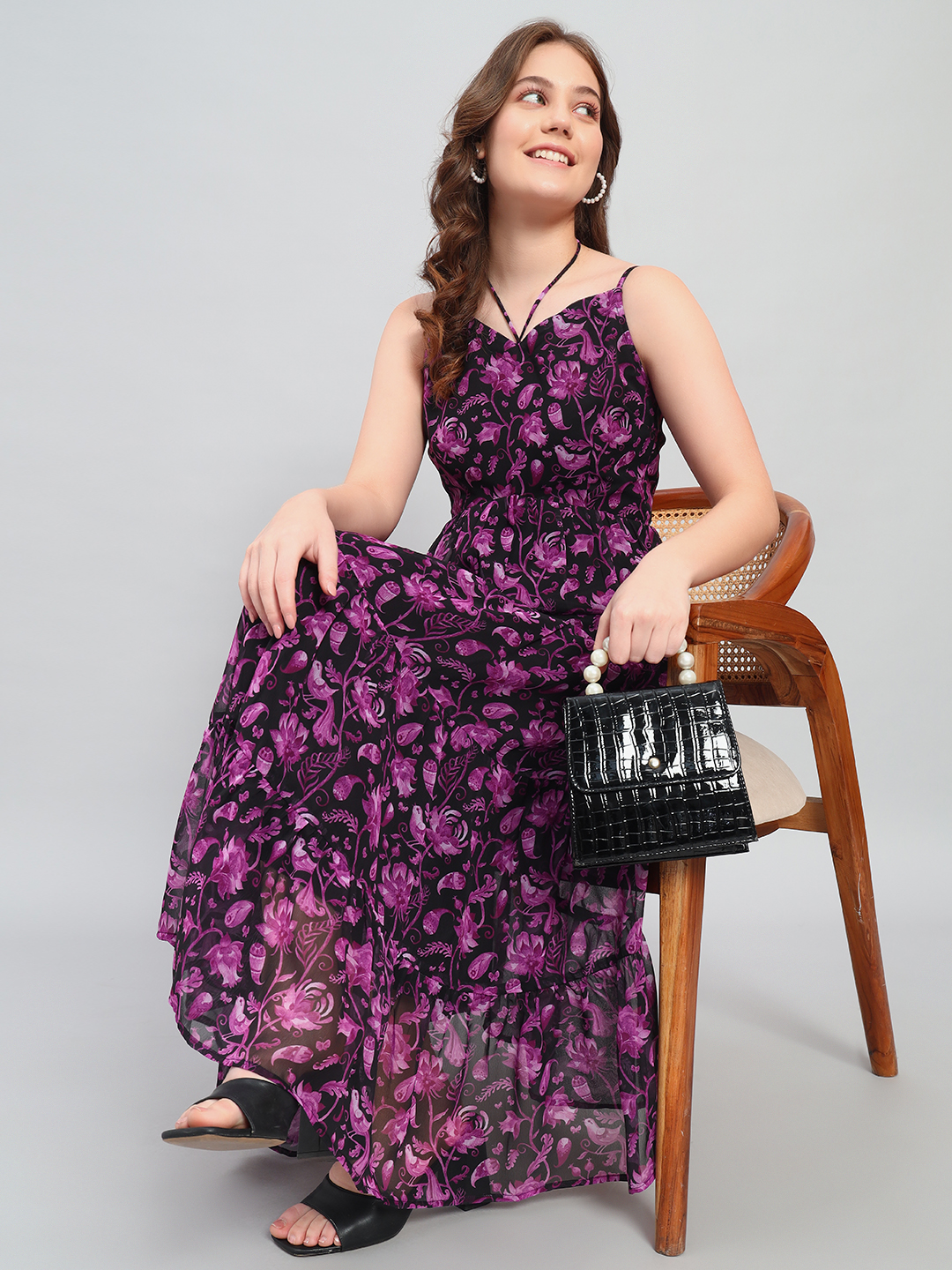 Embrace the essence of summer with this Tropical Floral Maxi Dress, featuring a stunning Black base adorned with Purple floral prints. The sleeveless design and V-neckline add a touch of elegance, while the tiered skirt provides a flowy and comfortable fit. Perfect for casual outings or beach vacations, this dress ensures effortless style and all-day comfort.