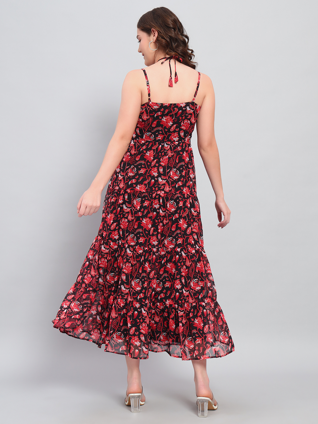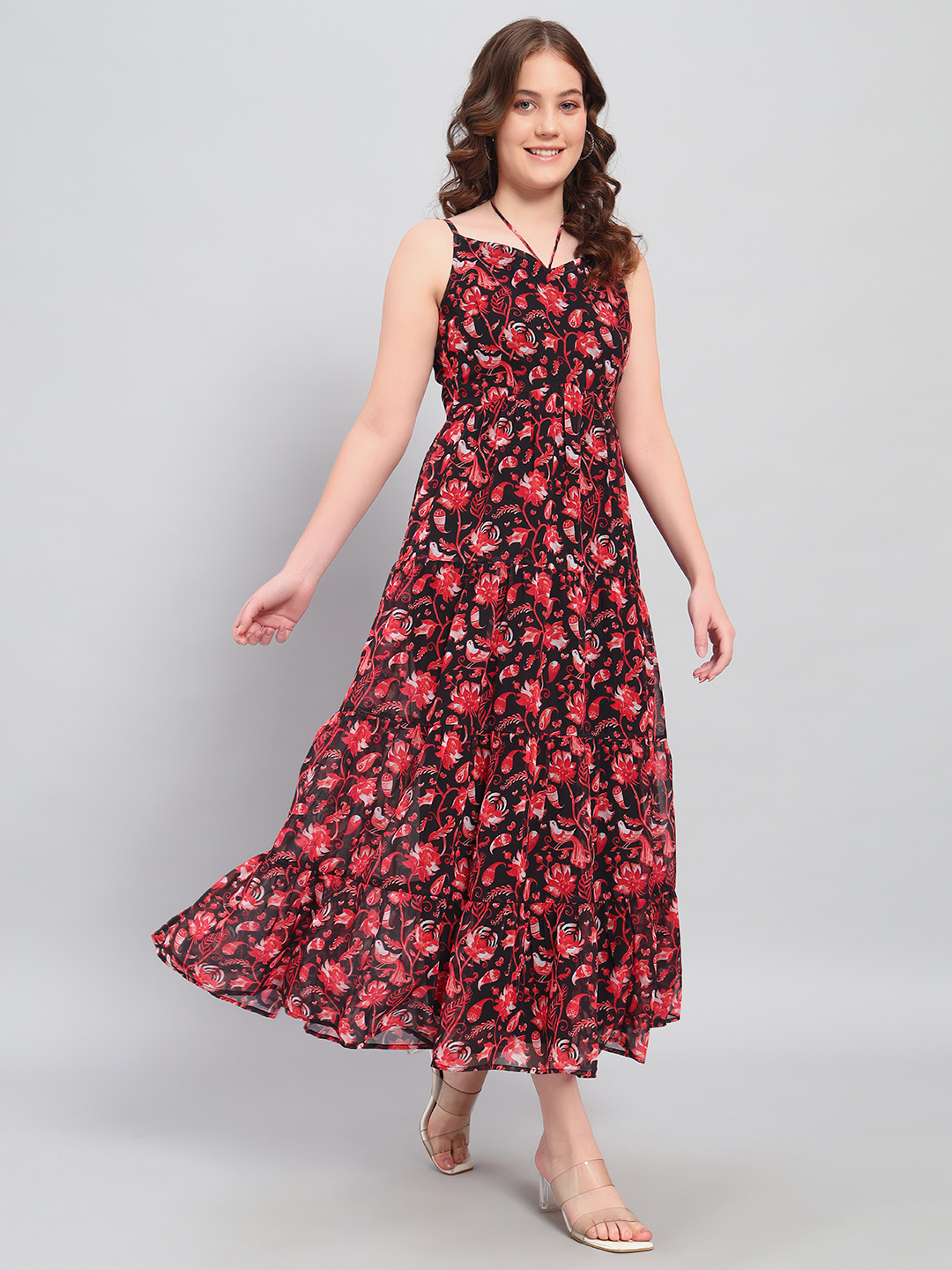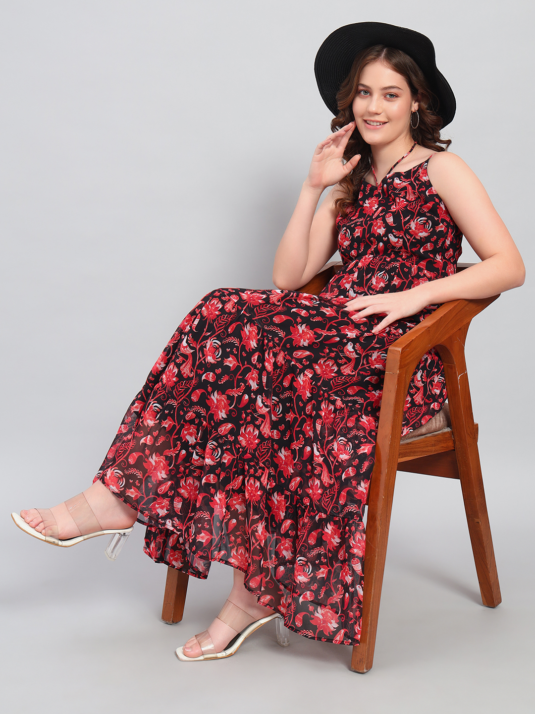 Embrace the essence of summer with this Tropical Floral Maxi Dress, featuring a stunning Black base adorned with Red floral prints. The sleeveless design and V-neckline add a touch of elegance, while the tiered skirt provides a flowy and comfortable fit. Perfect for casual outings or beach vacations, this dress ensures effortless style and all-day comfort.