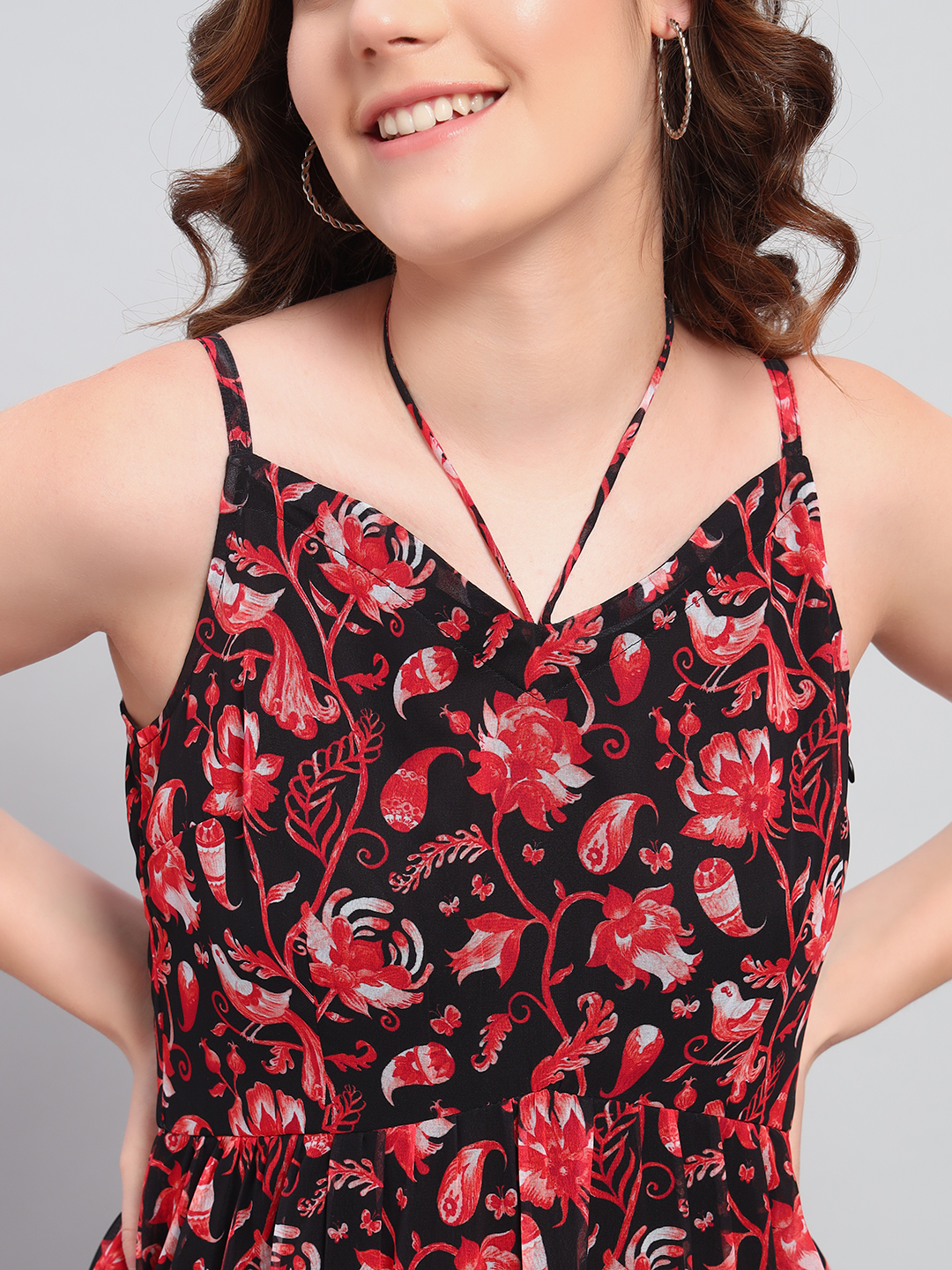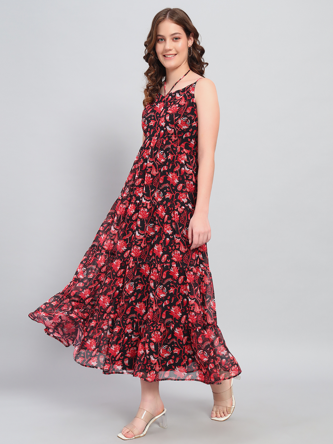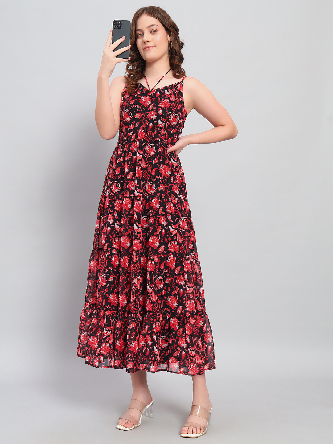 Embrace the essence of summer with this Tropical Floral Maxi Dress, featuring a stunning Black base adorned with Red floral prints. The sleeveless design and V-neckline add a touch of elegance, while the tiered skirt provides a flowy and comfortable fit. Perfect for casual outings or beach vacations, this dress ensures effortless style and all-day comfort.