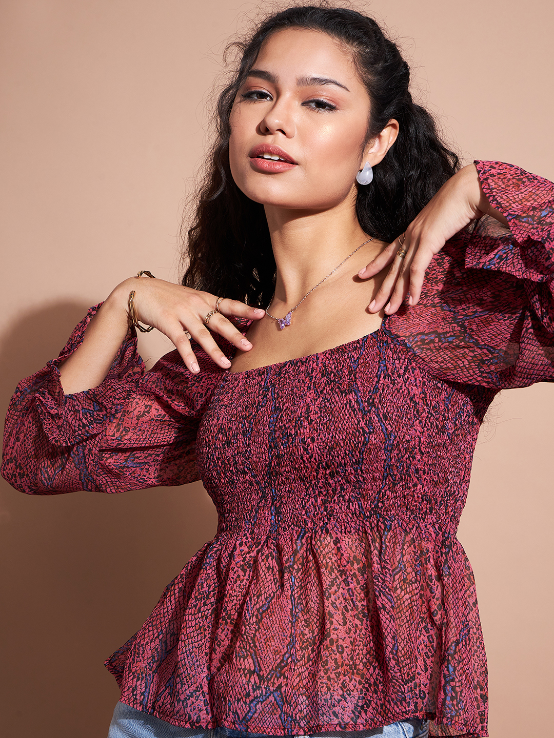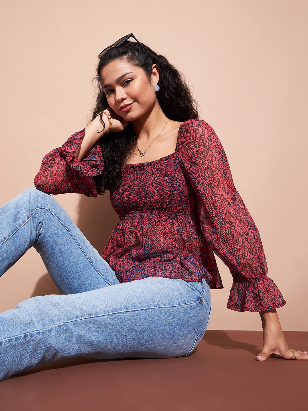 Be the first to review “Deewa Red Romantic Floral Print Smocked Peplum Blouse”