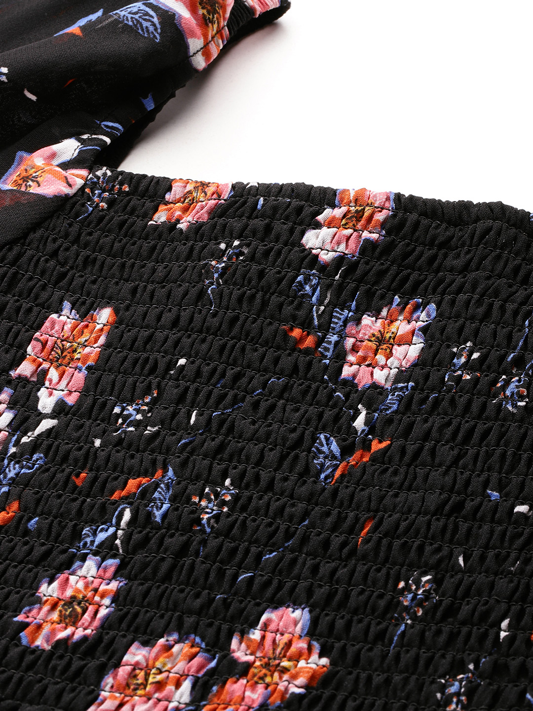 This Black floral smocked peplum blouse is ideal for multiple occasions. Whether you’re heading out for a relaxed brunch, a casual gathering, or dressing up for a daytime event, its romantic floral print and structured design create an effortlessly elegant look. Pair it with jeans for a laid-back style or skirts for a dressier ensemble. Add delicate accessories and heels for an elevated outfit perfect for evening dinners or celebrations.