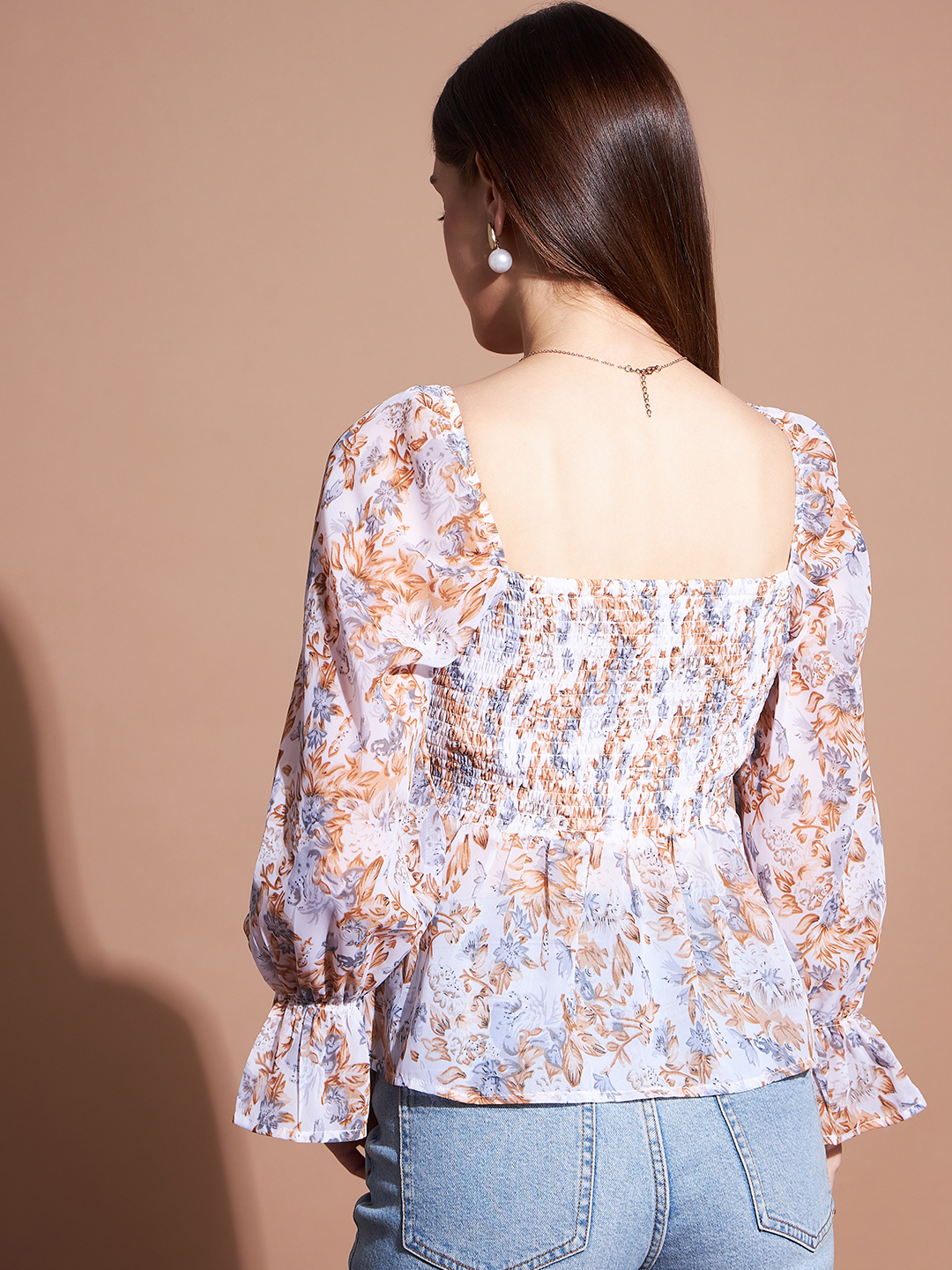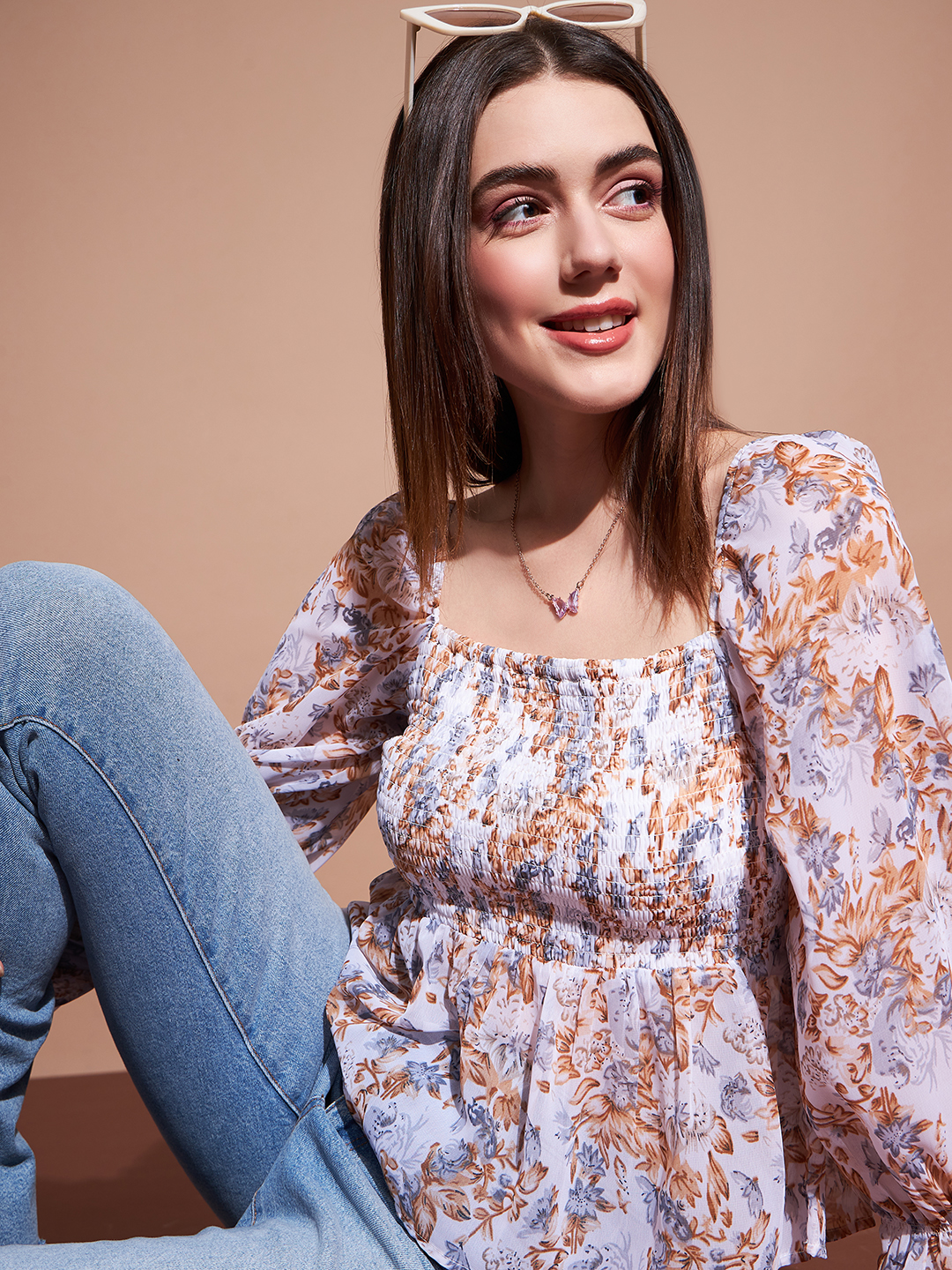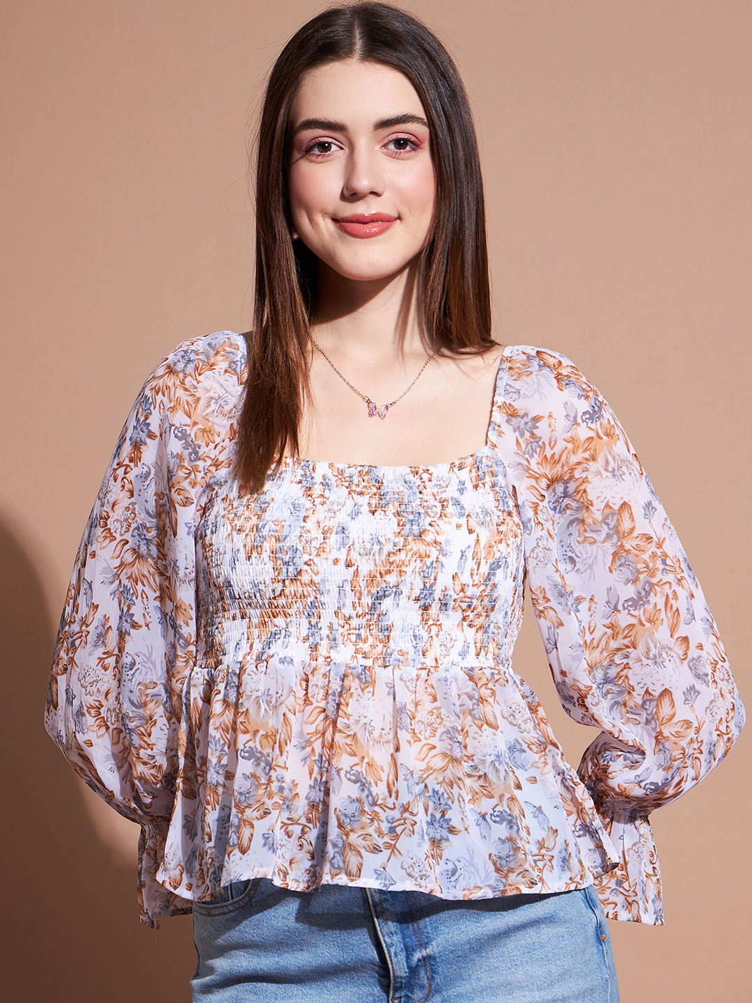 Embrace elegance with this Romantic Floral Print Smocked Peplum Blouse, designed to elevate any wardrobe. Featuring a delicate multicolor floral pattern on a soft white base, this blouse has a flattering square neckline and long, gently puffed sleeves with elastic cuffs. The smocked bodice ensures a comfortable and structured fit, while the peplum hem adds a graceful, feminine touch. Perfect for casual outings, brunch dates, and semi-formal gatherings, this top blends sophistication with effortless charm
