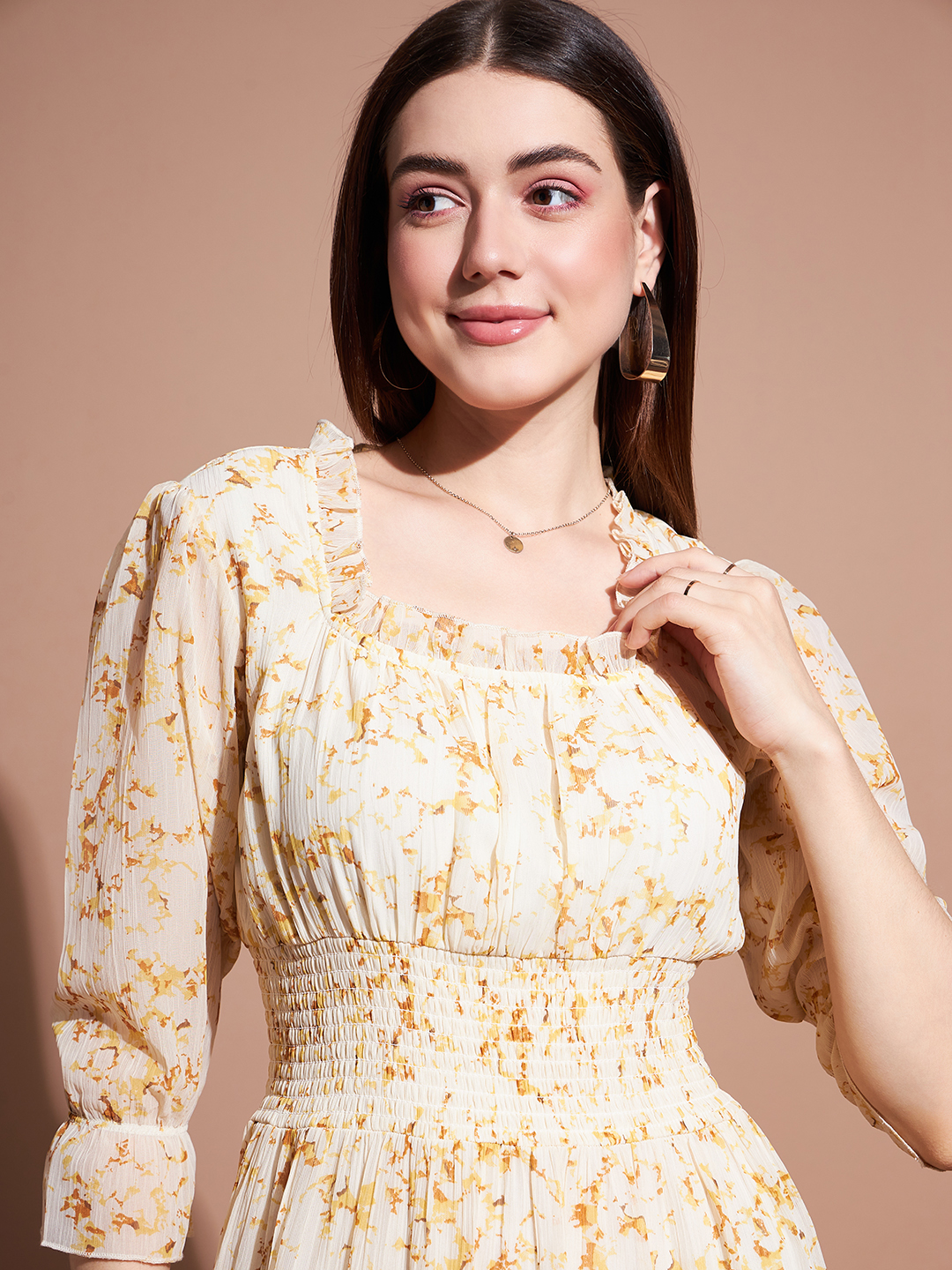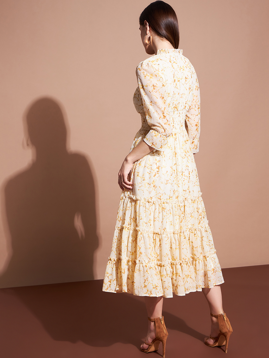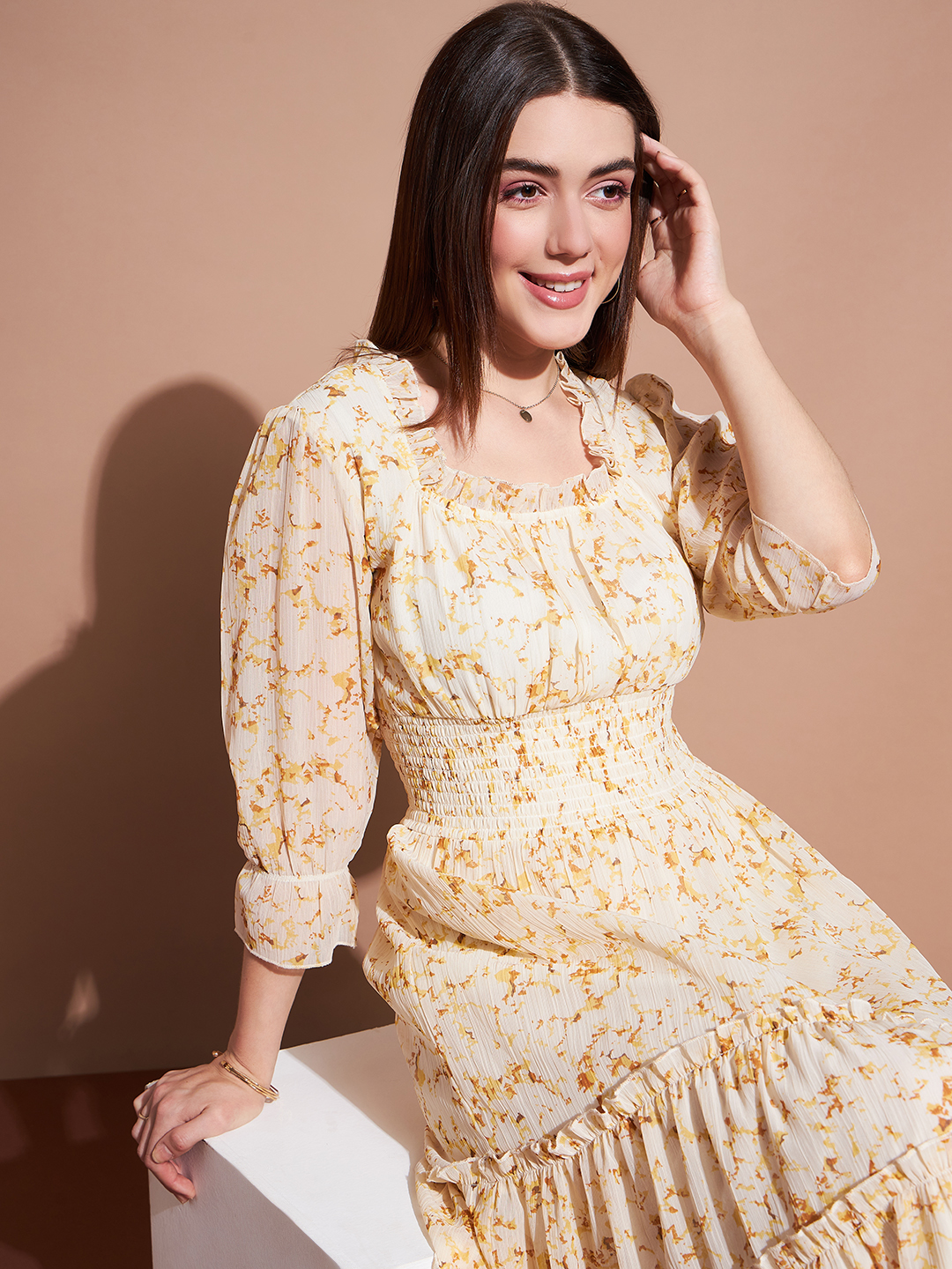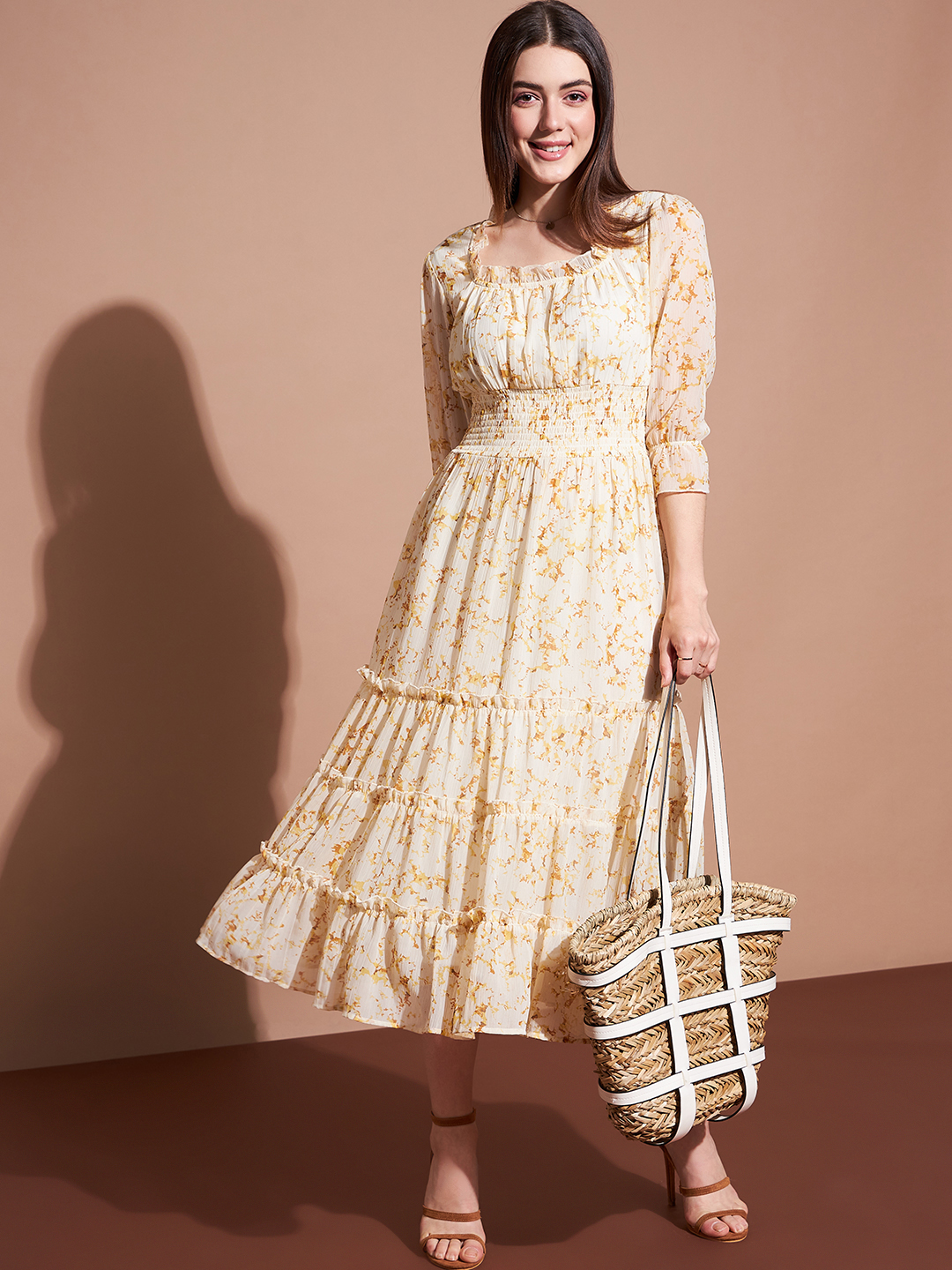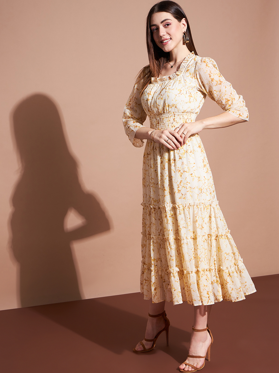Elegant and effortlessly stylish, this floral print midi dress features a flattering smocked bodice that defines the waist while allowing for a comfortable fit. The ruffled square neckline adds a delicate touch, complemented by three-quarter length sleeves for a timeless charm. The tiered skirt cascades beautifully, making this piece perfect for any occasion—casual or formal.