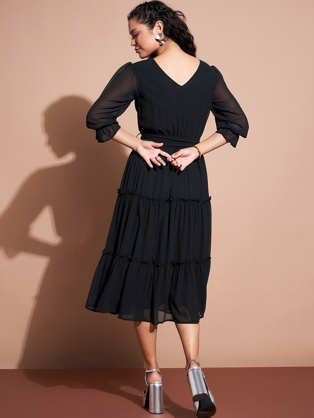 Deewa Women Black Chic Asymmetrical Pleated Midi Dress