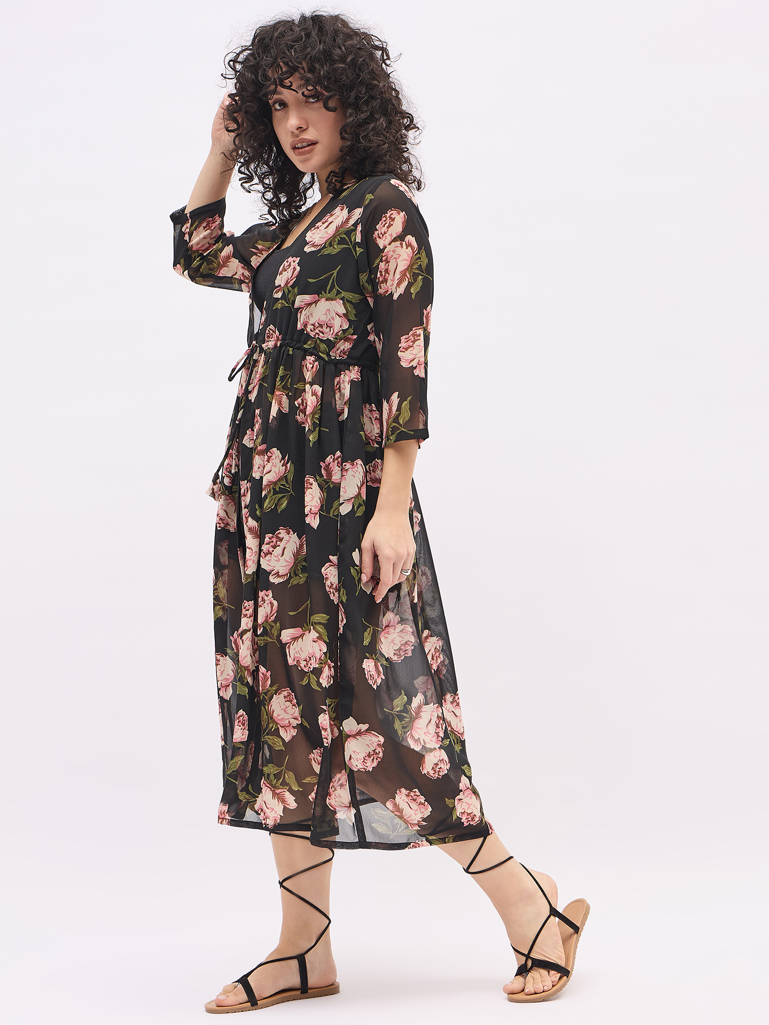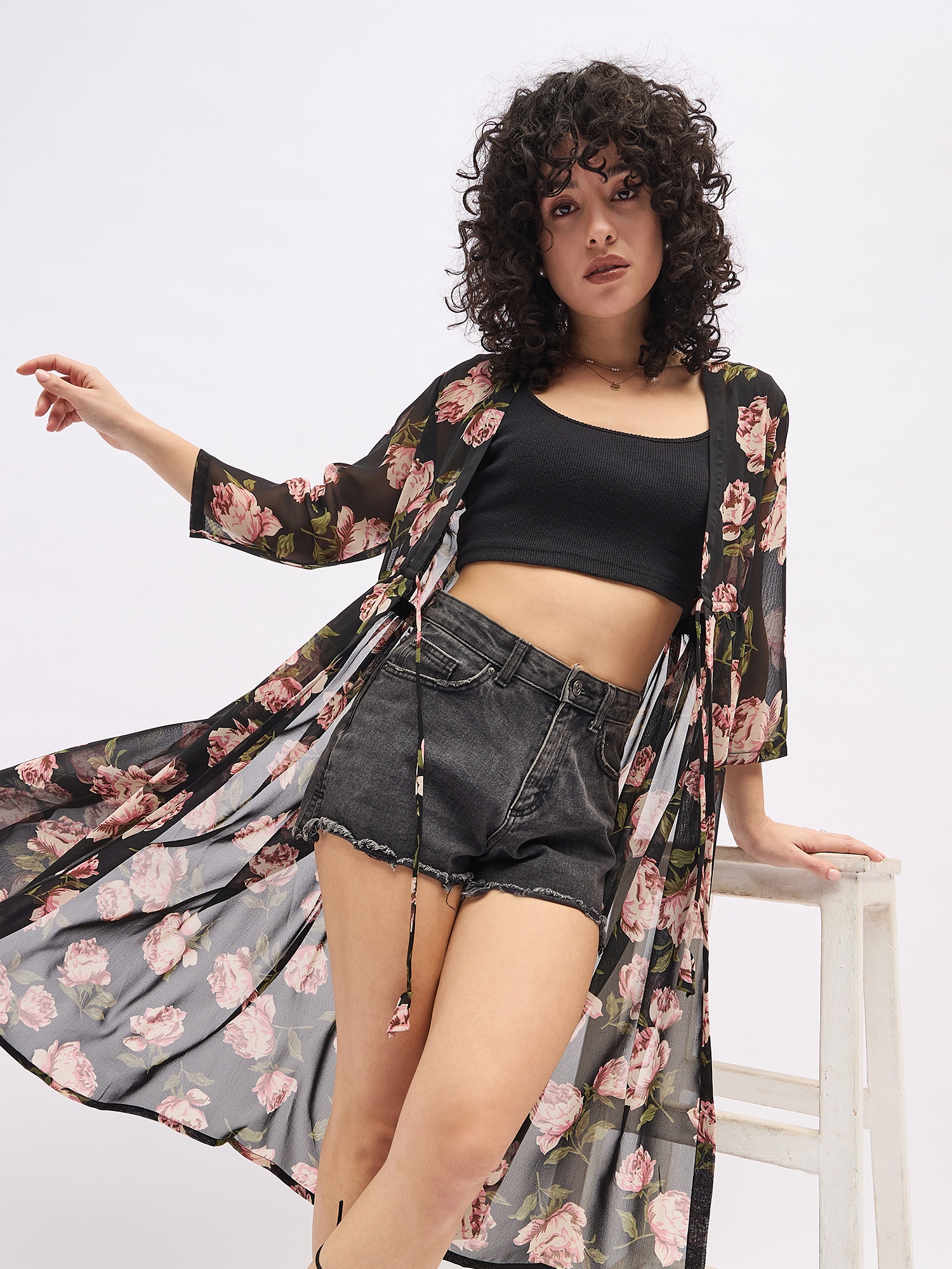 Deewa Women Black Floral Elegant Open-Front Shrug