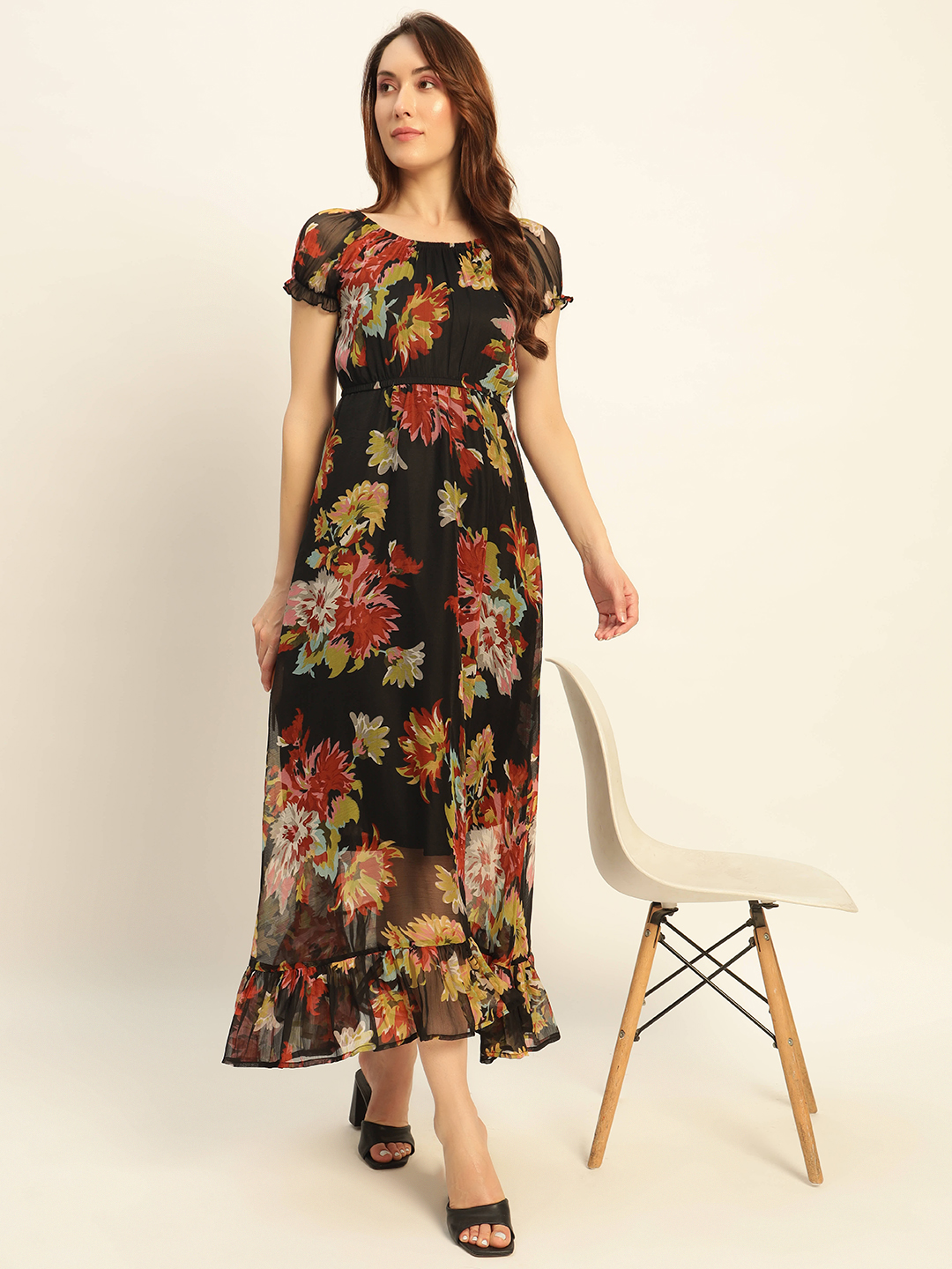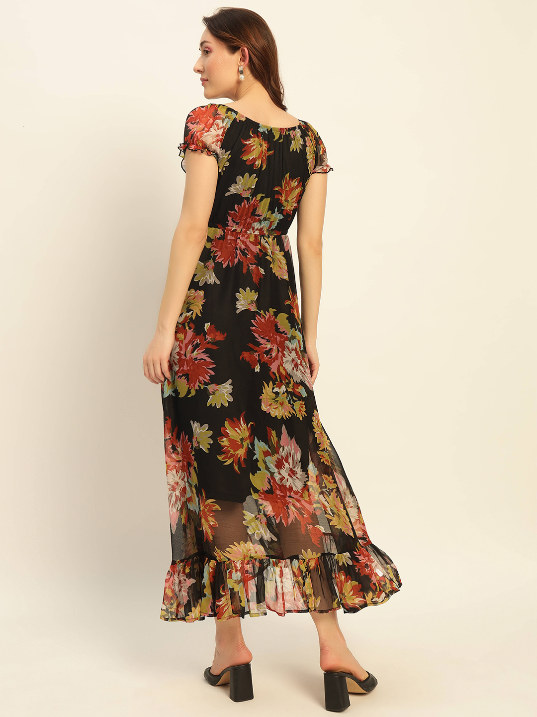 Turn heads with timeless elegance in our Black Floral Maxi Dress with Sheer Ruffle Sleeves. This ankle-length beauty features a rich black base adorned with vibrant floral prints in red, yellow, and green. The fitted bodice enhances your silhouette, while the flowing skirt and ruffled hem add graceful movement. Sheer short sleeves with ruffled edges and a classic round neckline bring a romantic touch to this versatile piece. Whether you’re attending a garden soirΓ©e or heading out for a dinner date, this dress is your go-to for refined style and comfort.