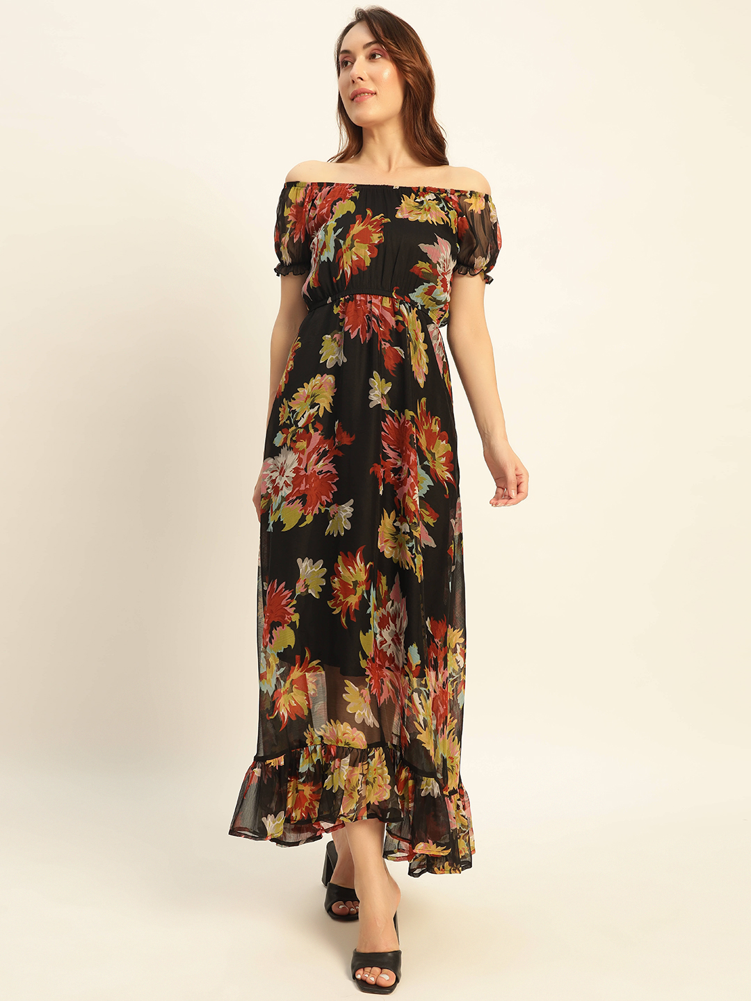Elegant black maxi dress with colorful floral prints, sheer ruffle sleeves, and a flowing ruffled hemβideal for evening events and stylish gatherings.
