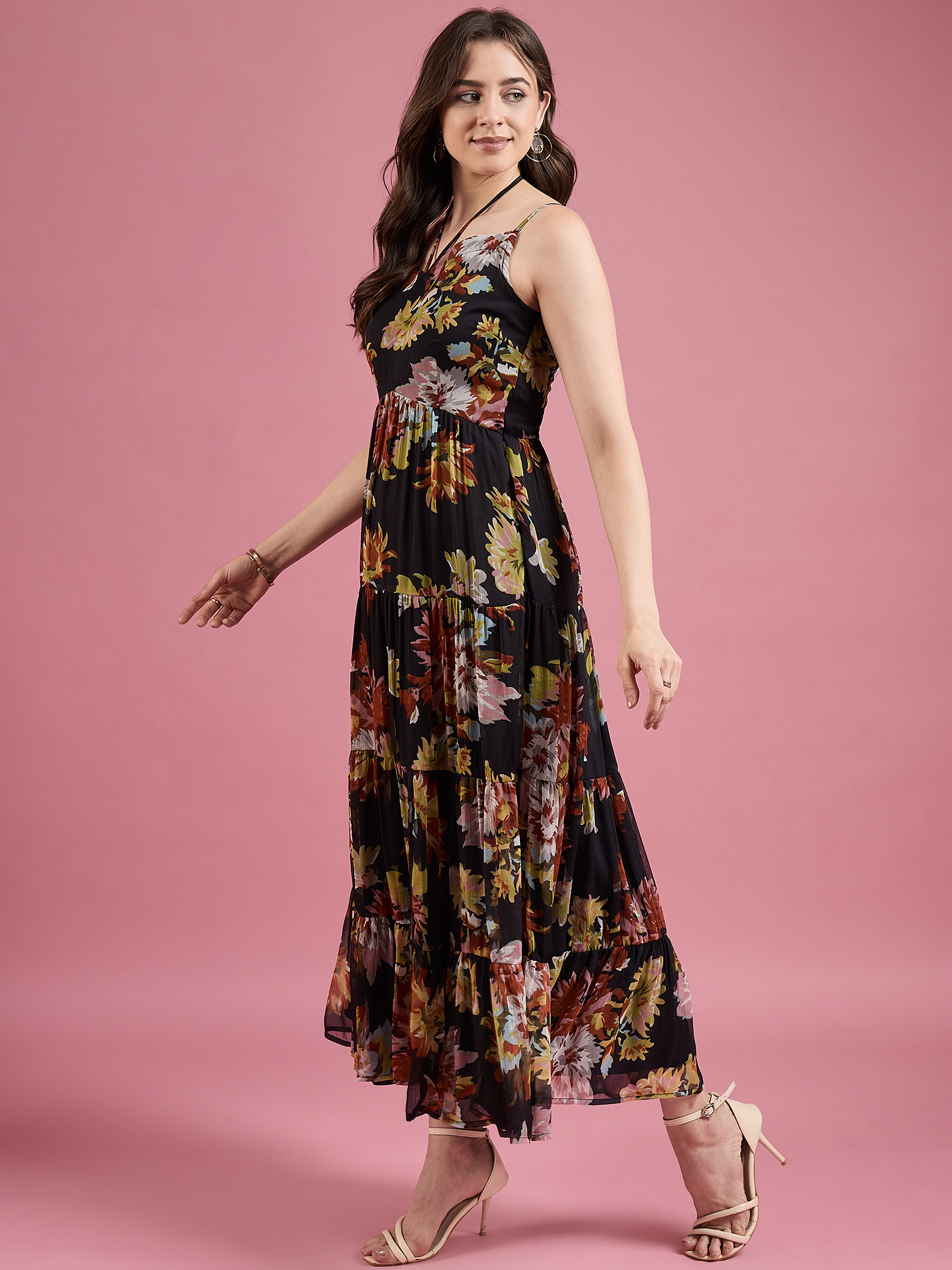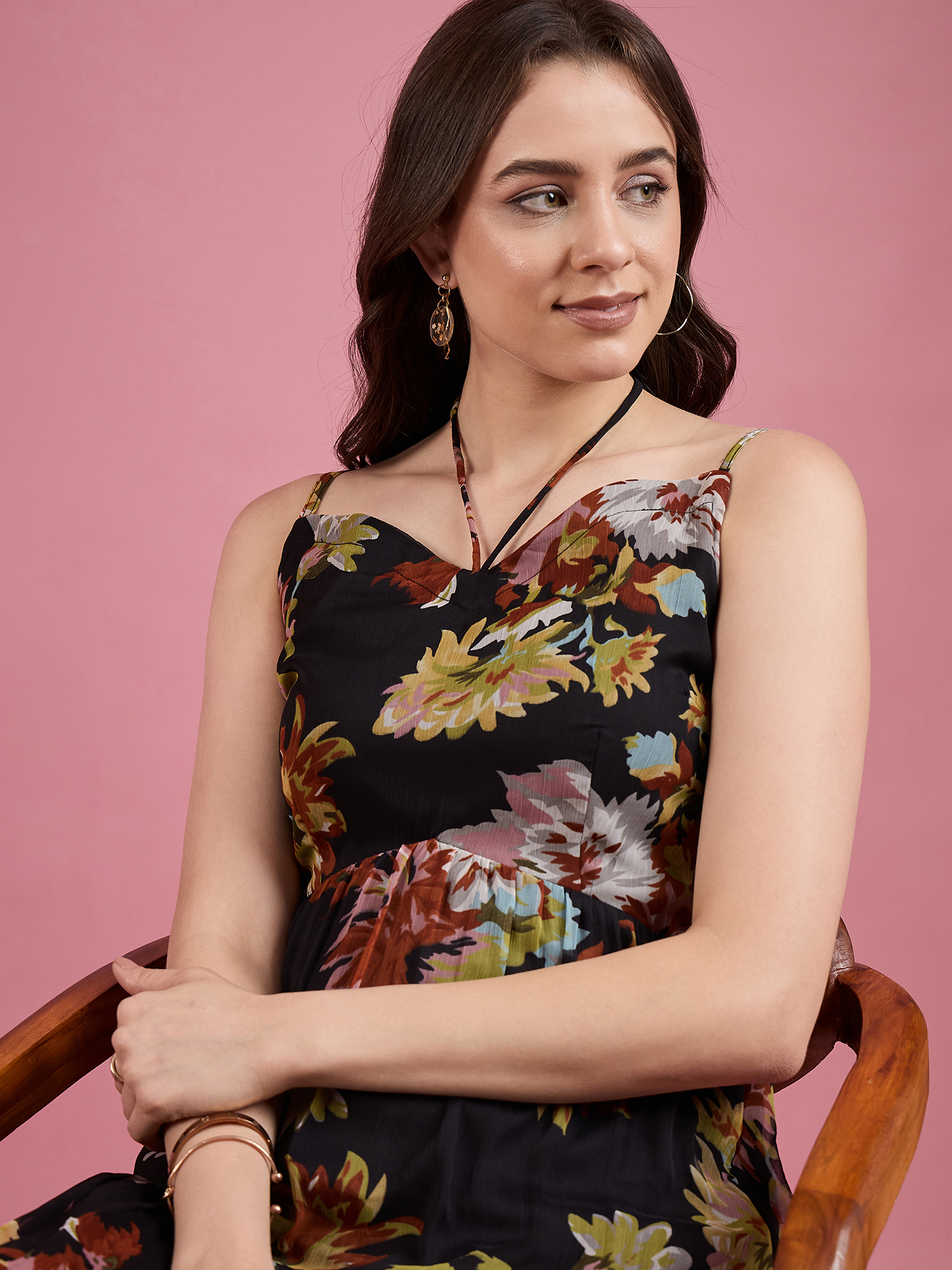 Make a bold statement with this captivating black floral print maxi dress. Featuring a sleeveless design with delicate thin straps and a flattering V-neckline, this dress effortlessly enhances your silhouette. The tiered skirt adds volume and graceful movement, making it the perfect blend of elegance and comfort for both casual and semi-formal occasions.