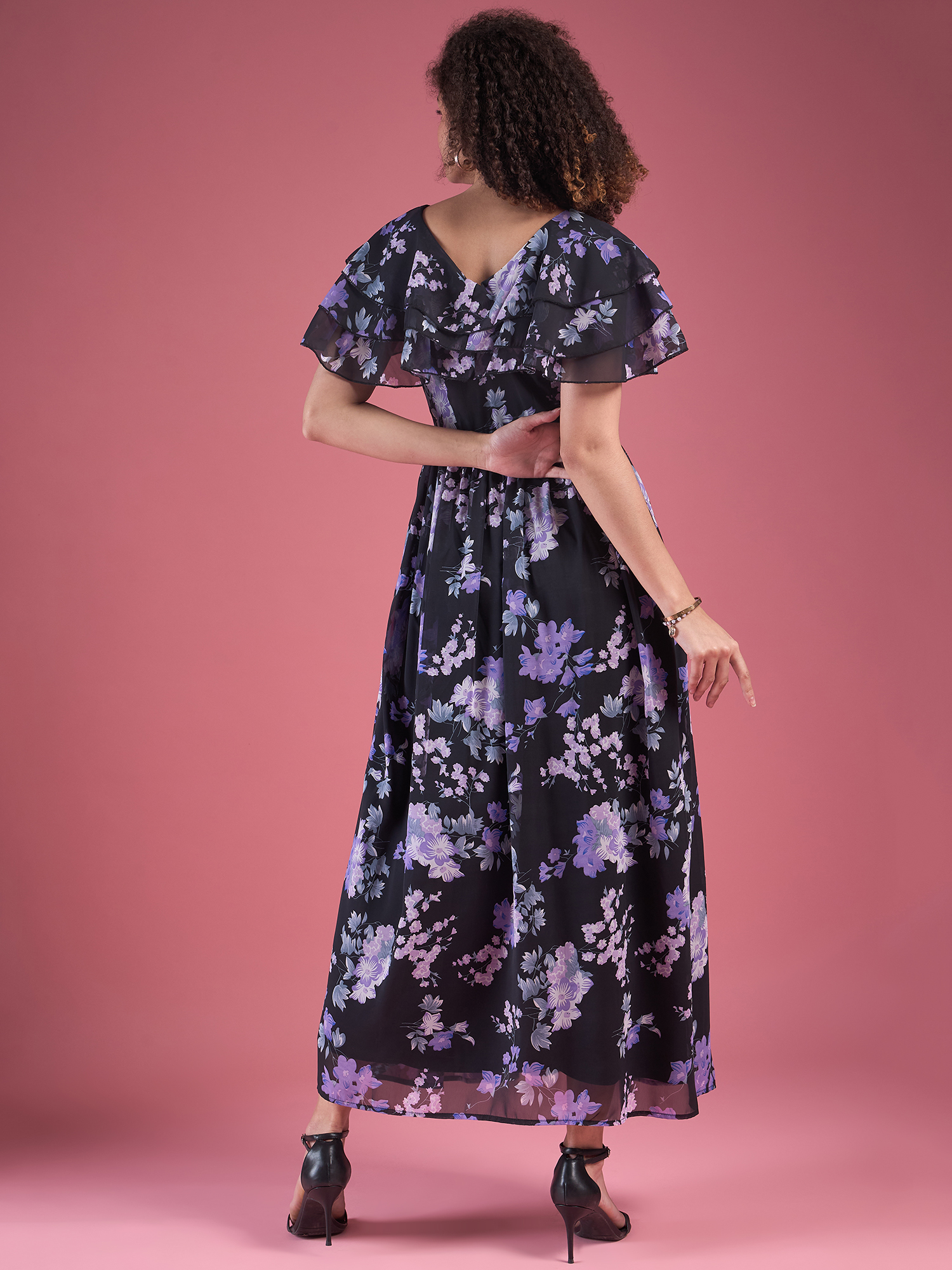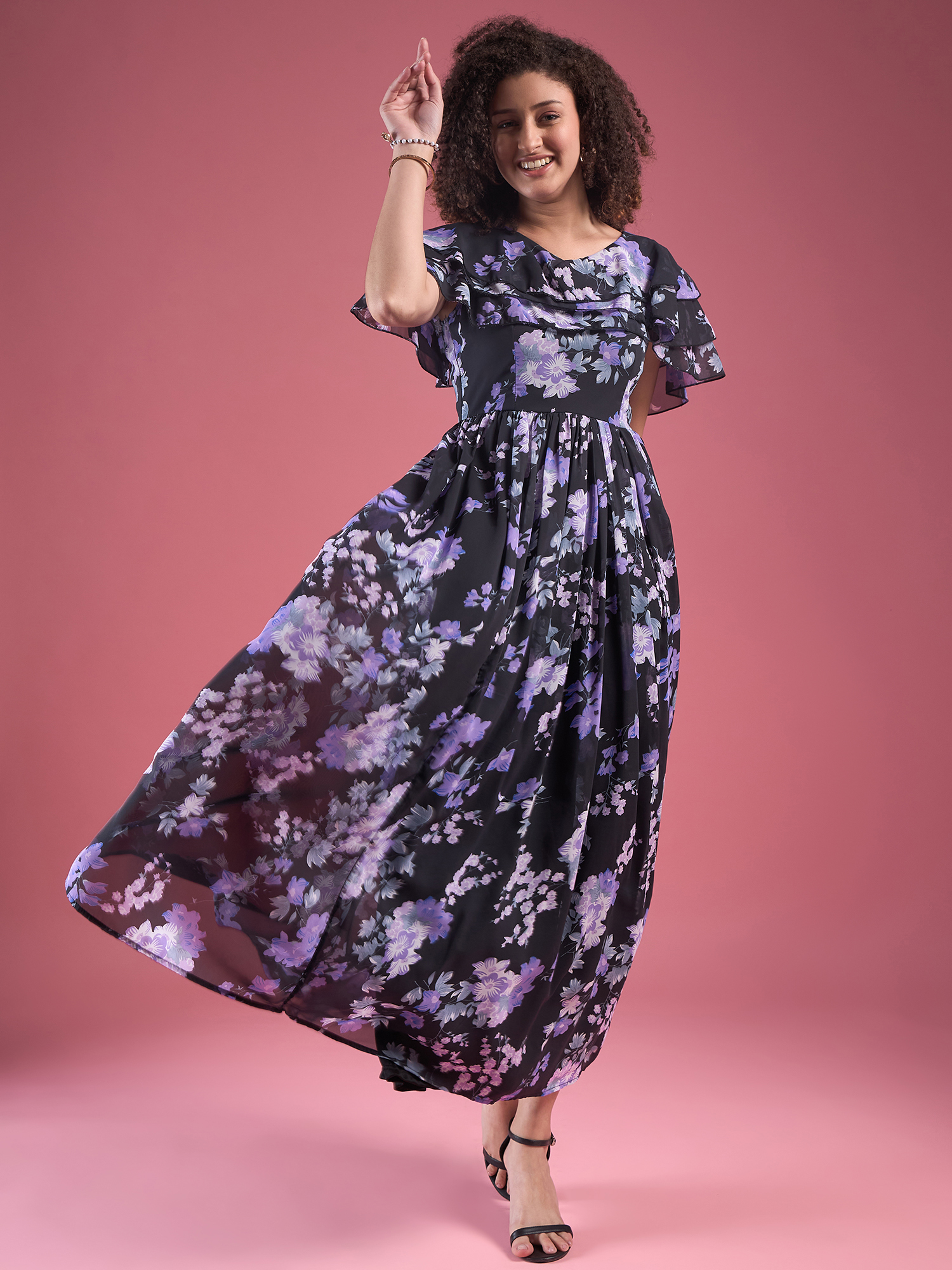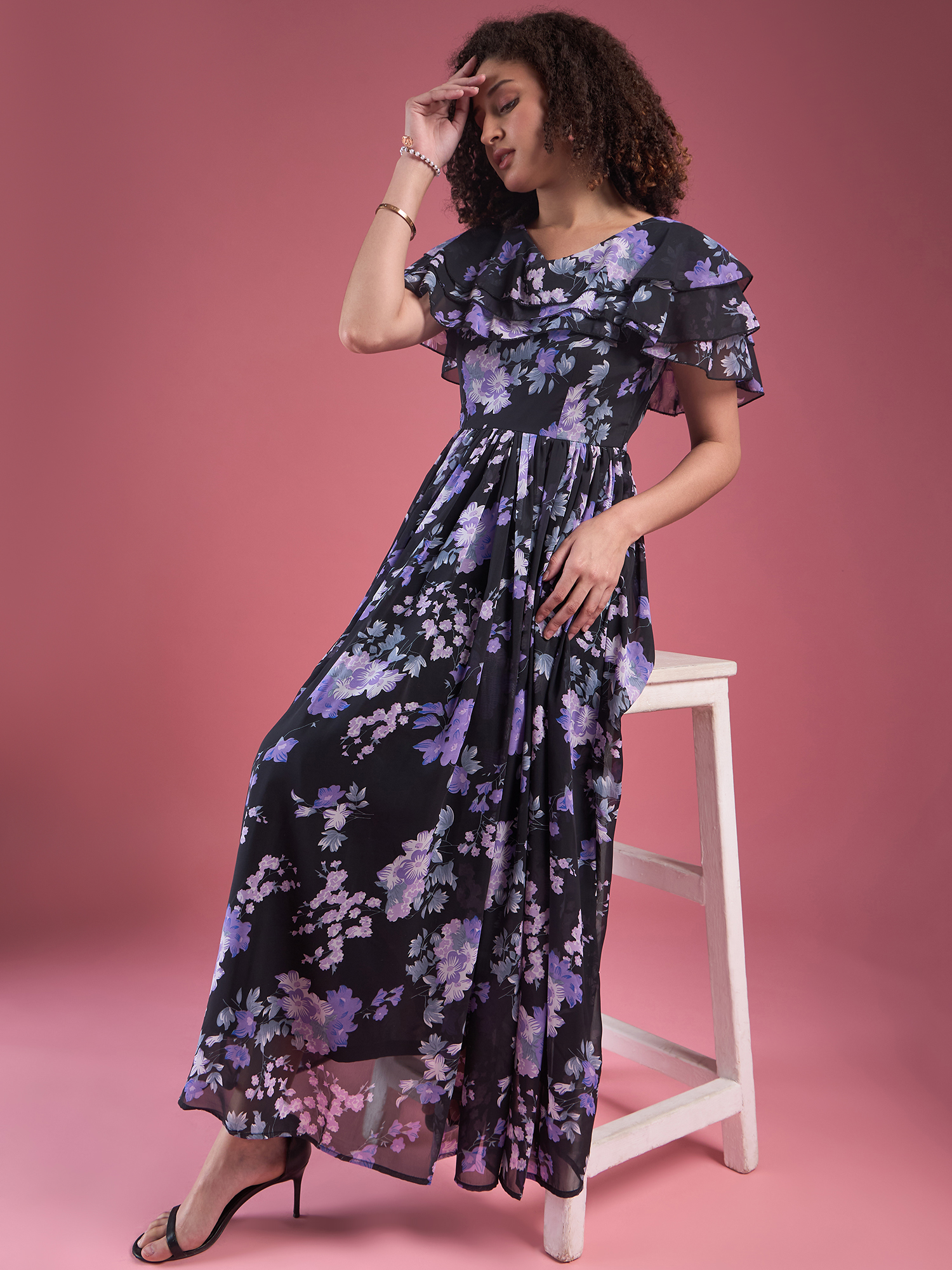 Elevate your style with this stunning Floral Chiffon Maxi Dress. Featuring a sleek black base adorned with elegant purple and white floral patterns, this dress exudes grace and sophistication. The flutter sleeves add a feminine touch, while the round neckline and flowing silhouette create an effortlessly chic look. Whether you’re attending a special event or enjoying a sunny day outdoors, this dress is a perfect blend of comfort and elegance.