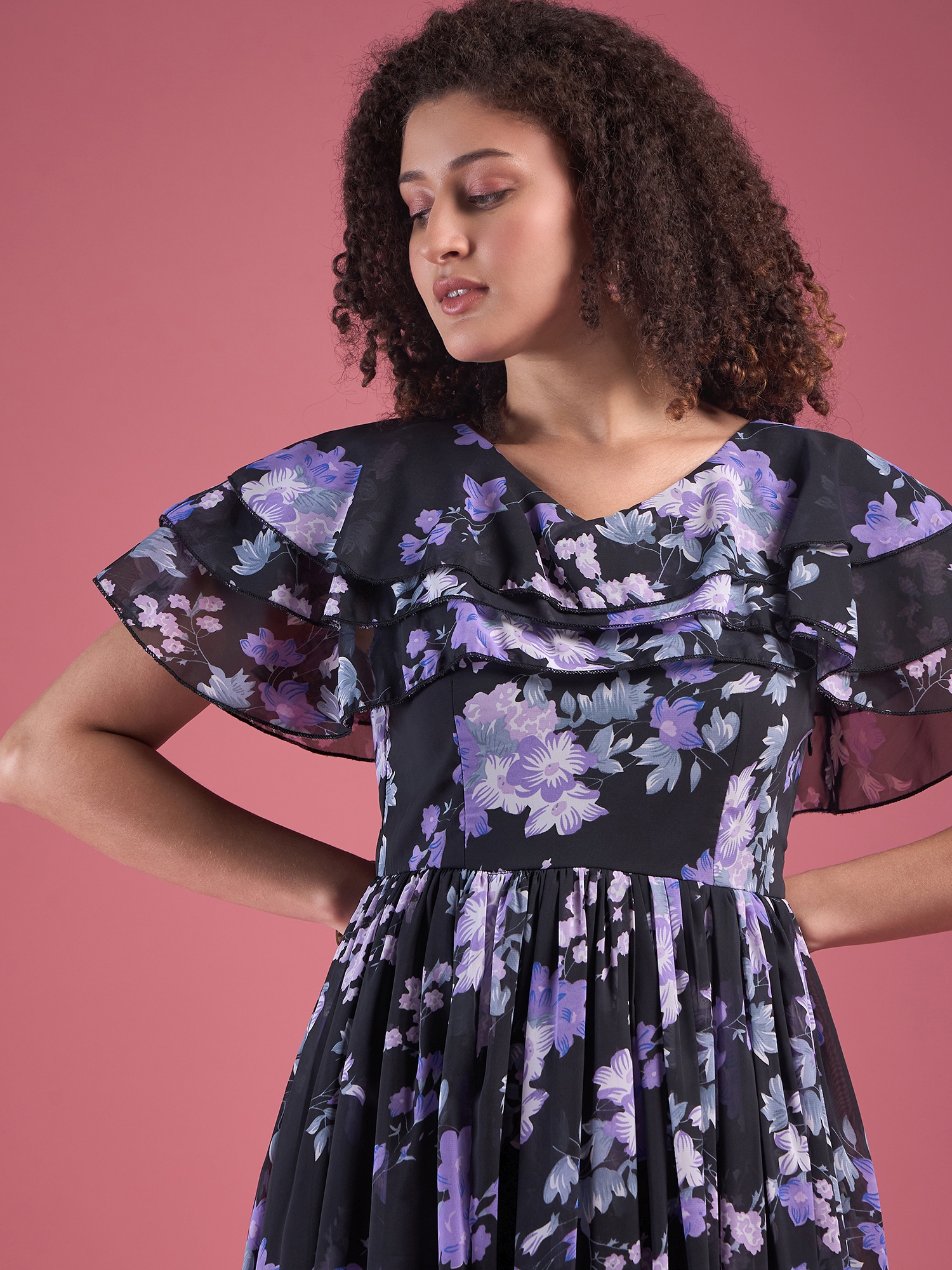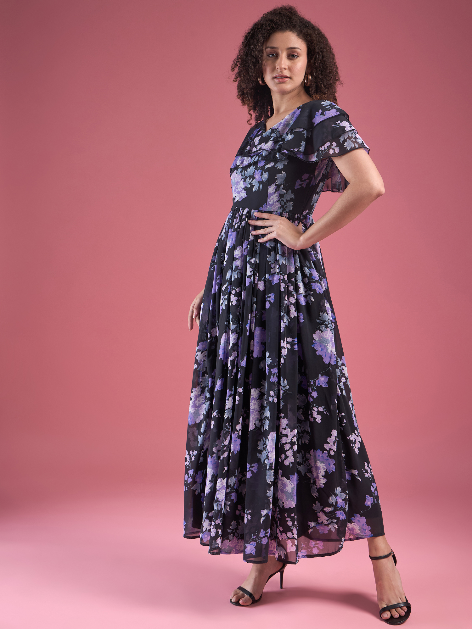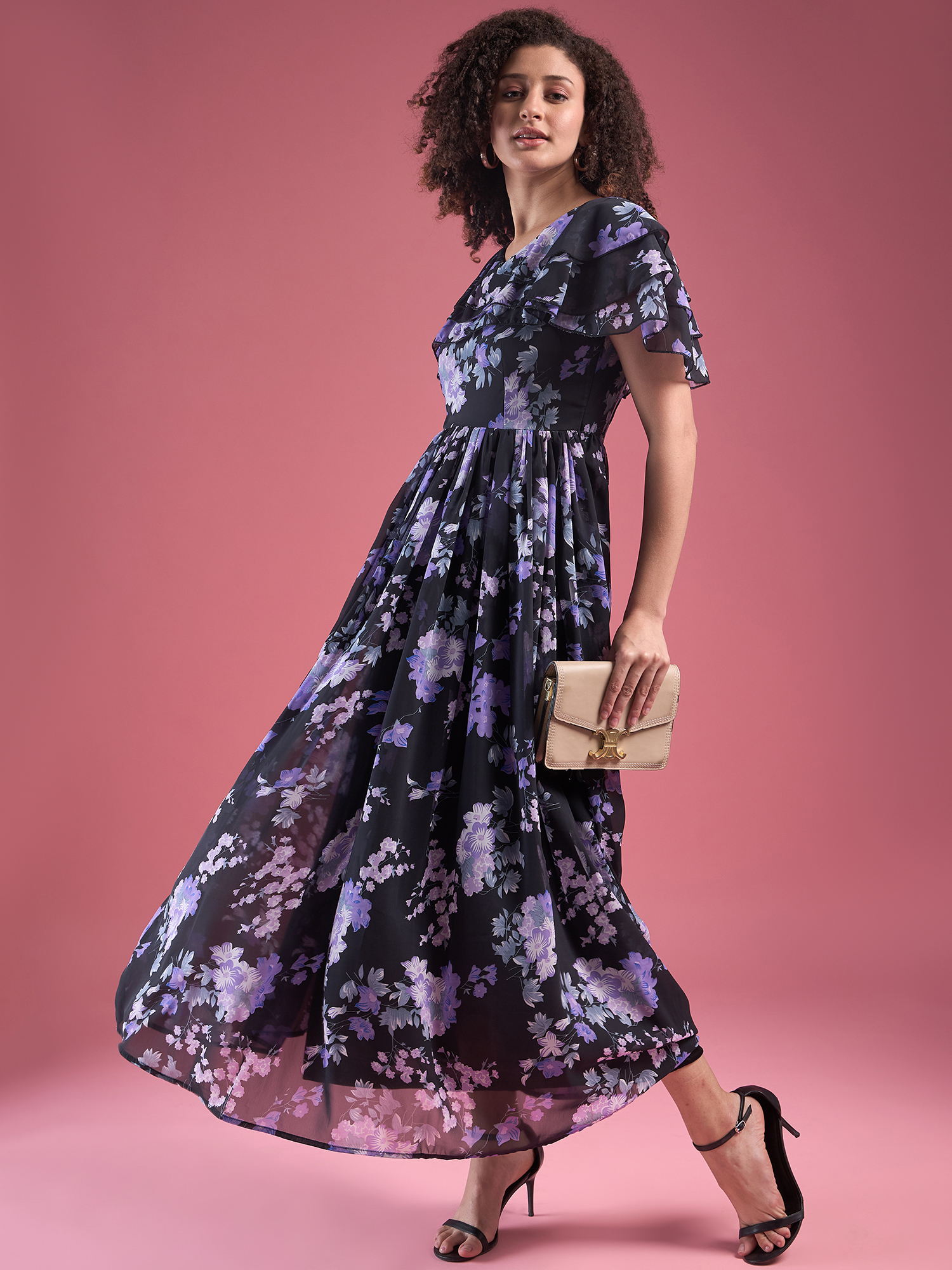 Elevate your style with this stunning Floral Chiffon Maxi Dress. Featuring a sleek black base adorned with elegant purple and white floral patterns, this dress exudes grace and sophistication. The flutter sleeves add a feminine touch, while the round neckline and flowing silhouette create an effortlessly chic look. Whether you’re attending a special event or enjoying a sunny day outdoors, this dress is a perfect blend of comfort and elegance.
