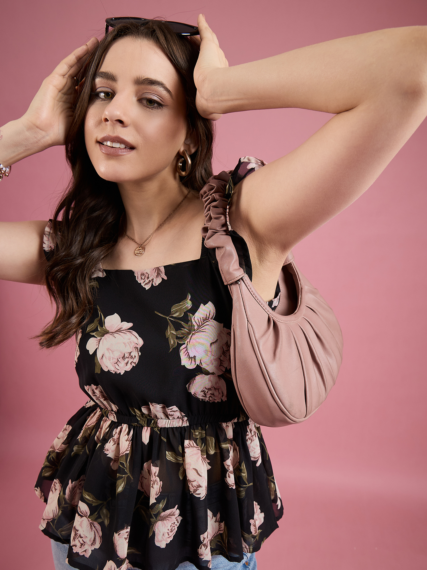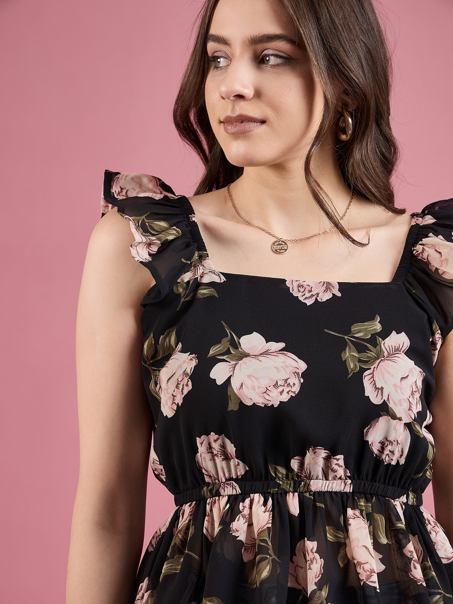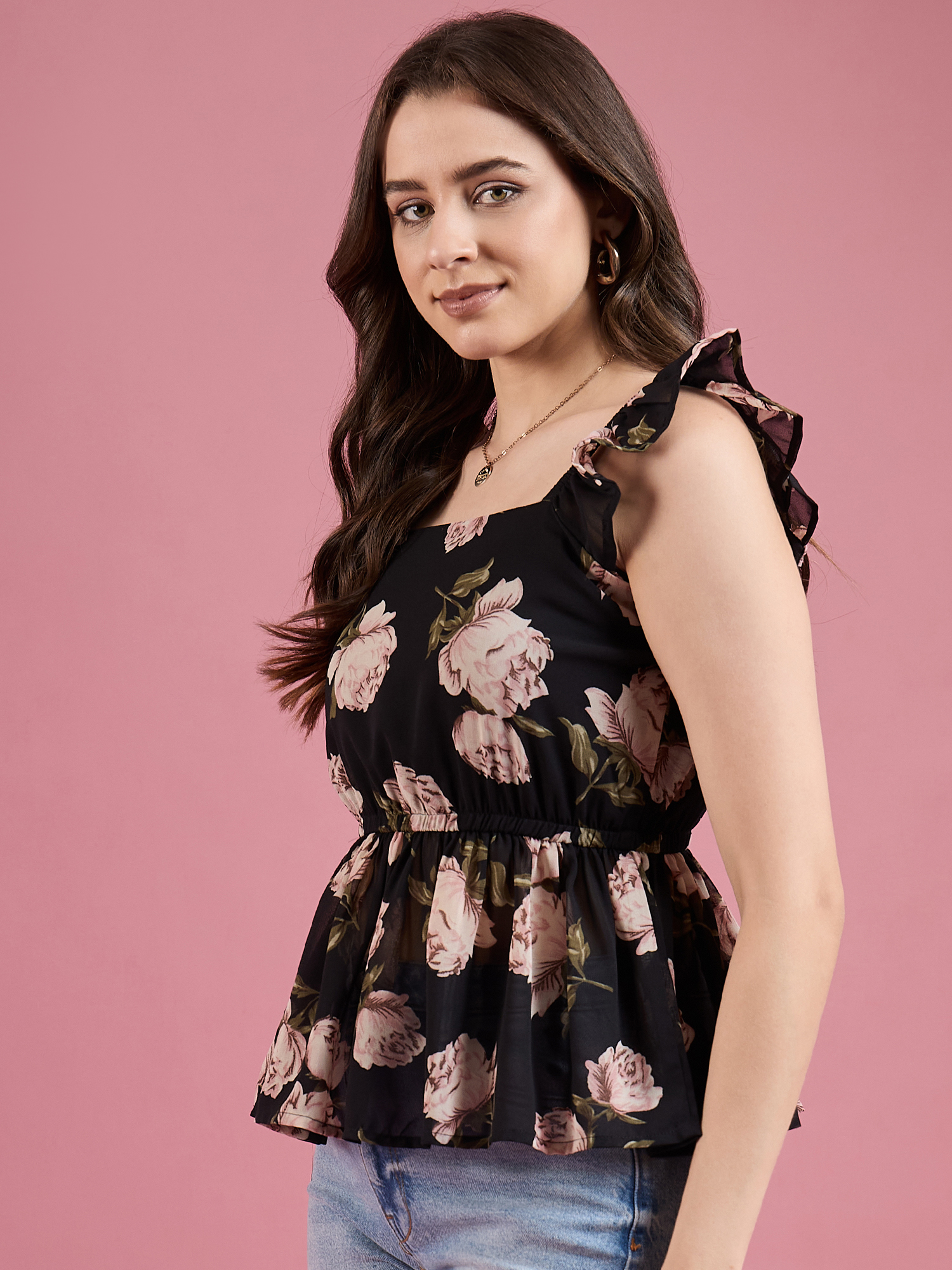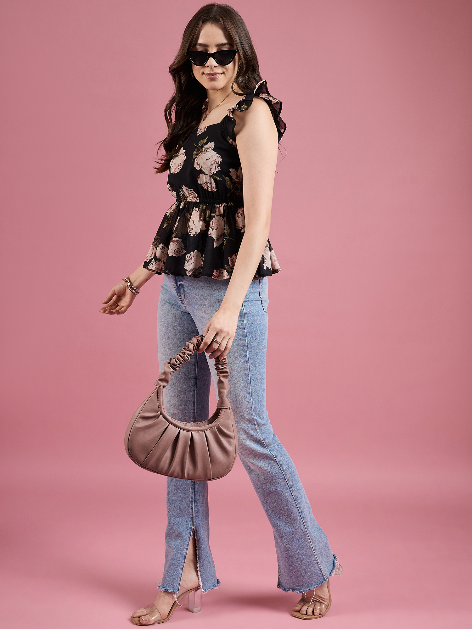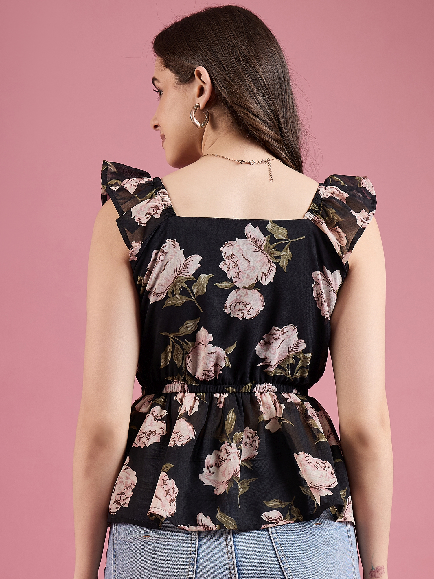 This Floral Ruffle Sleeve Peplum Top blends elegance with playful charm, featuring a striking black base adorned with delicate multicolor floral prints. The square neckline adds a structured touch, while the ruffle sleeves bring a feminine flair. Designed with a cinched waist that transitions into a flowy peplum hem, this top enhances your silhouette effortlessly. Whether you’re dressing for a brunch date or a casual outing, this piece ensures a chic and sophisticated look.