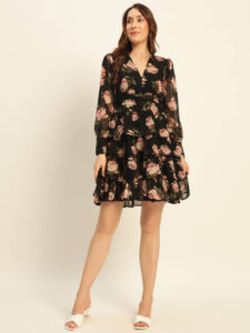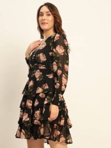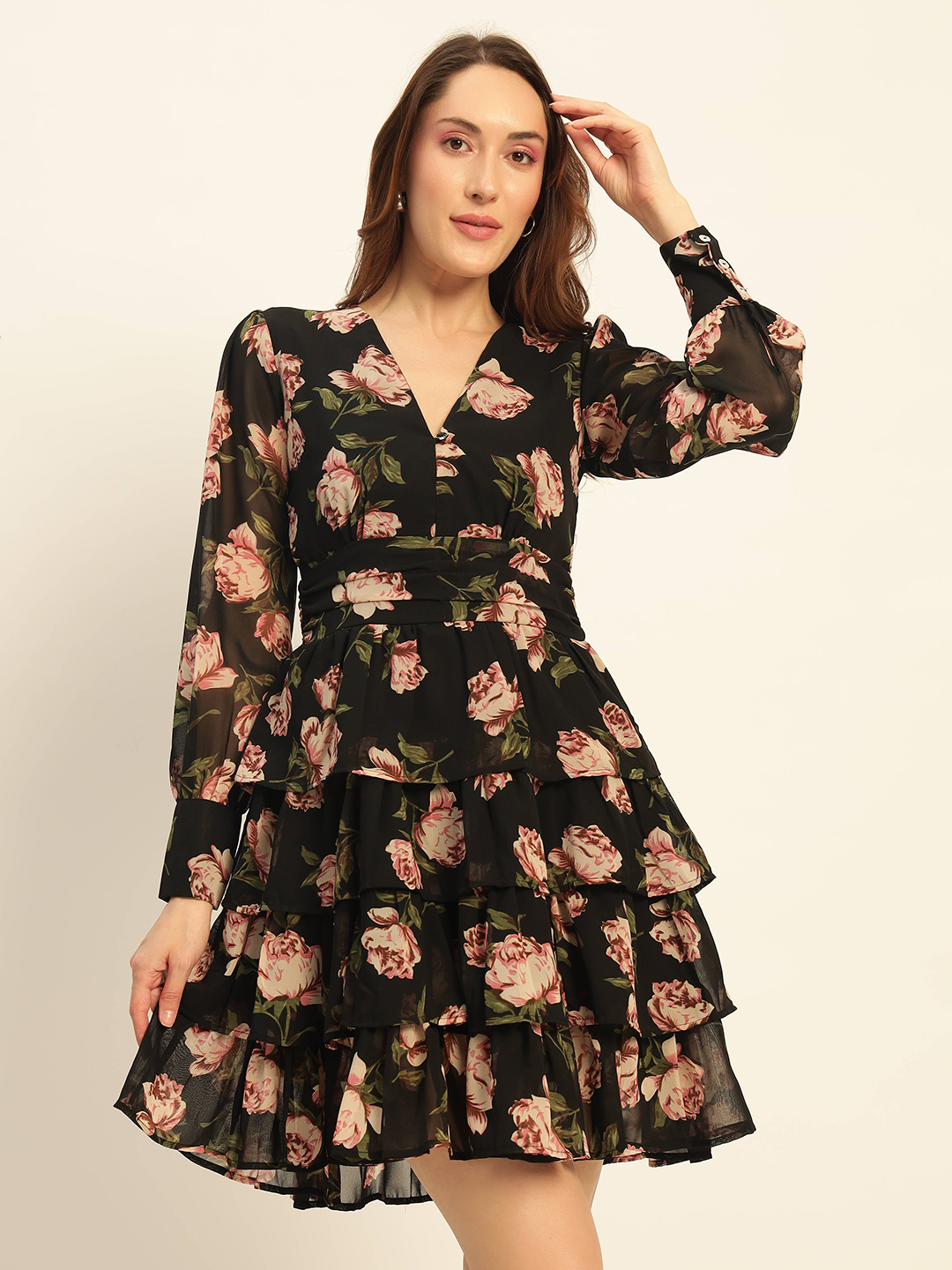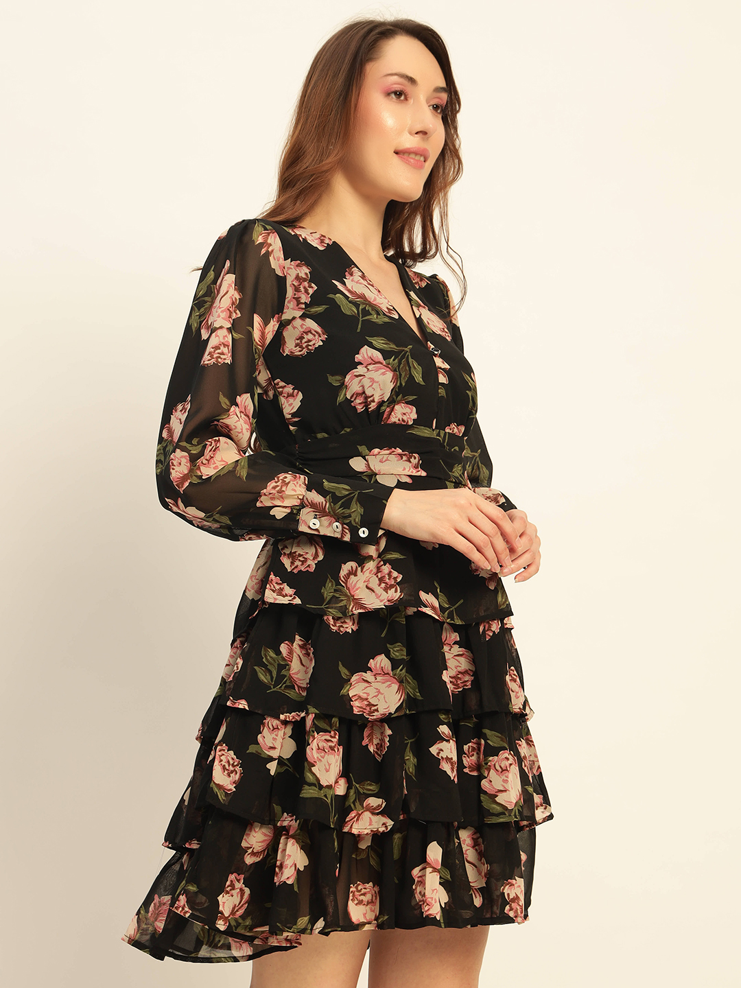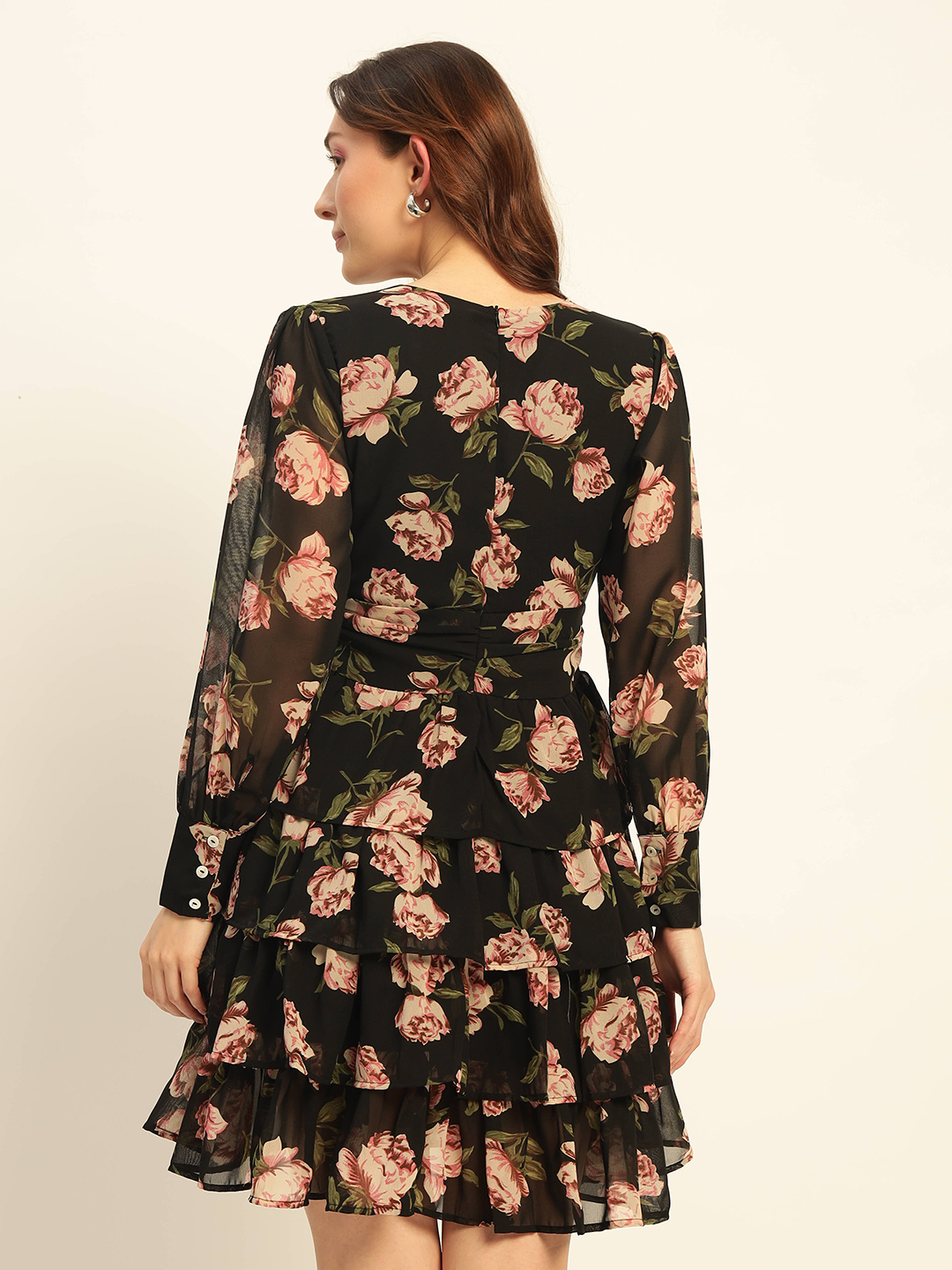 Step into timeless elegance with our Black Floral Tiered Maxi Dress, a perfect blend of romance and sophistication. This stunning piece features a deep V-neckline, sheer long sleeves adorned with delicate floral prints, and a flattering fitted waist that enhances your silhouette. The tiered skirt flows gracefully with every step, showcasing layers of pink and white blossoms against a rich black backdrop. Whether you’re attending a festive gathering or a candlelit dinner, this dress promises effortless charm and standout style.