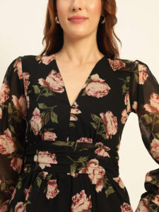 Elegant black floral maxi dress with sheer sleeves, fitted waist, and tiered skirt—ideal for festive evenings, garden parties, and romantic dinners.