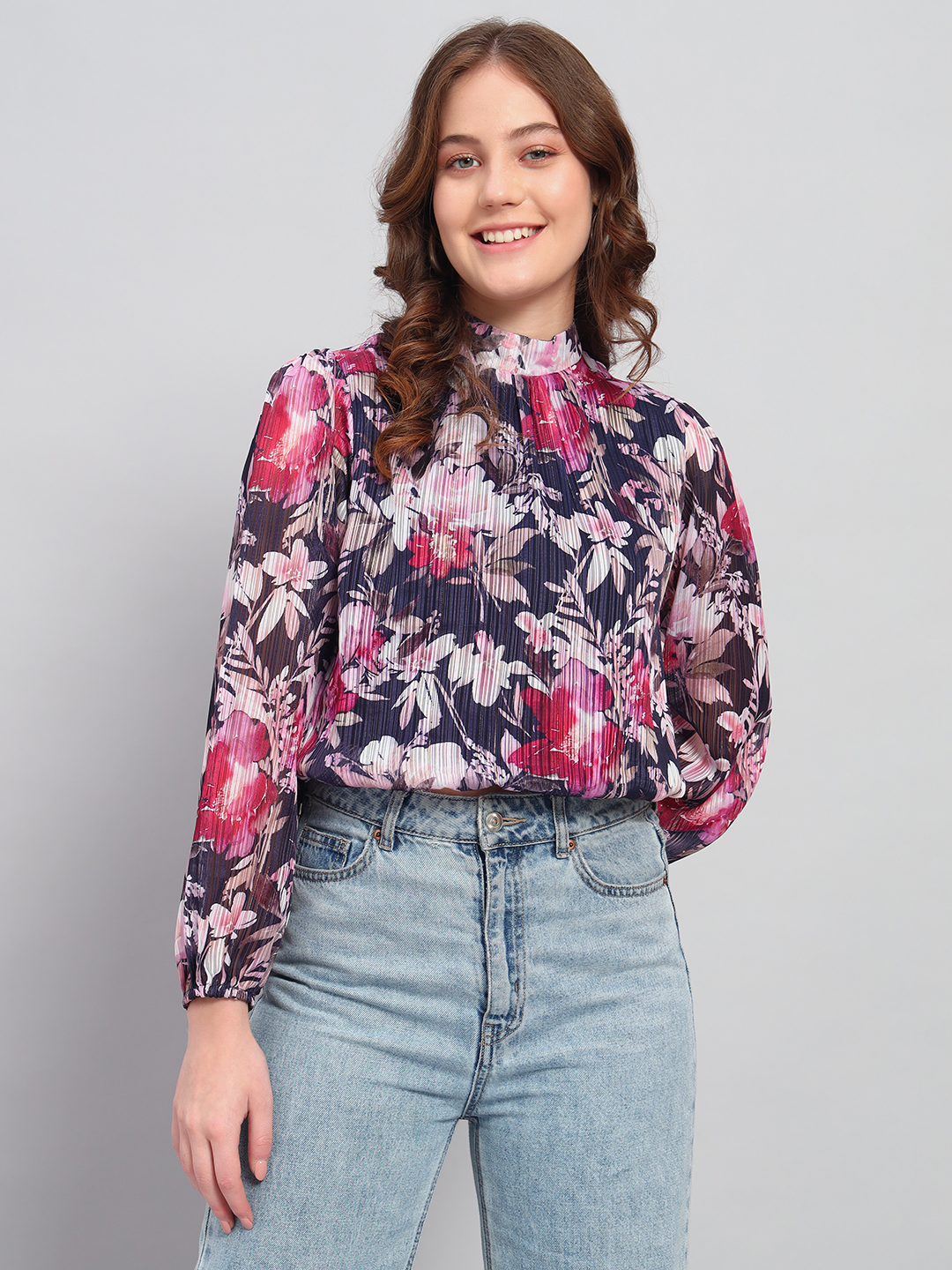 Deewa Women Black Pastel Bloom Pleated Floral Blouse