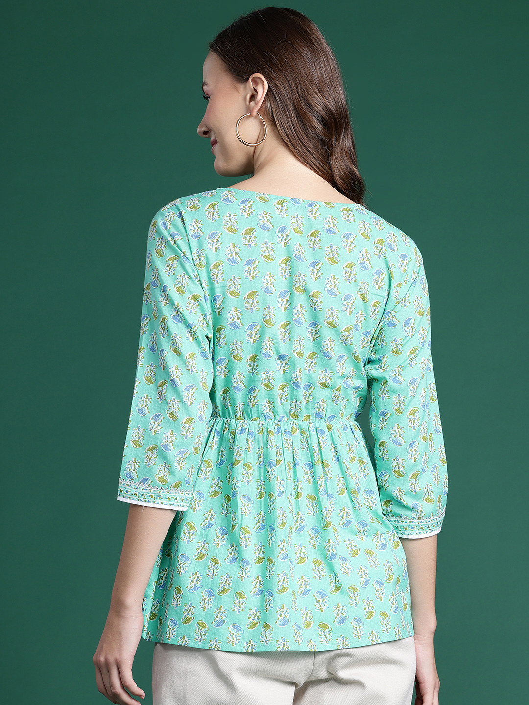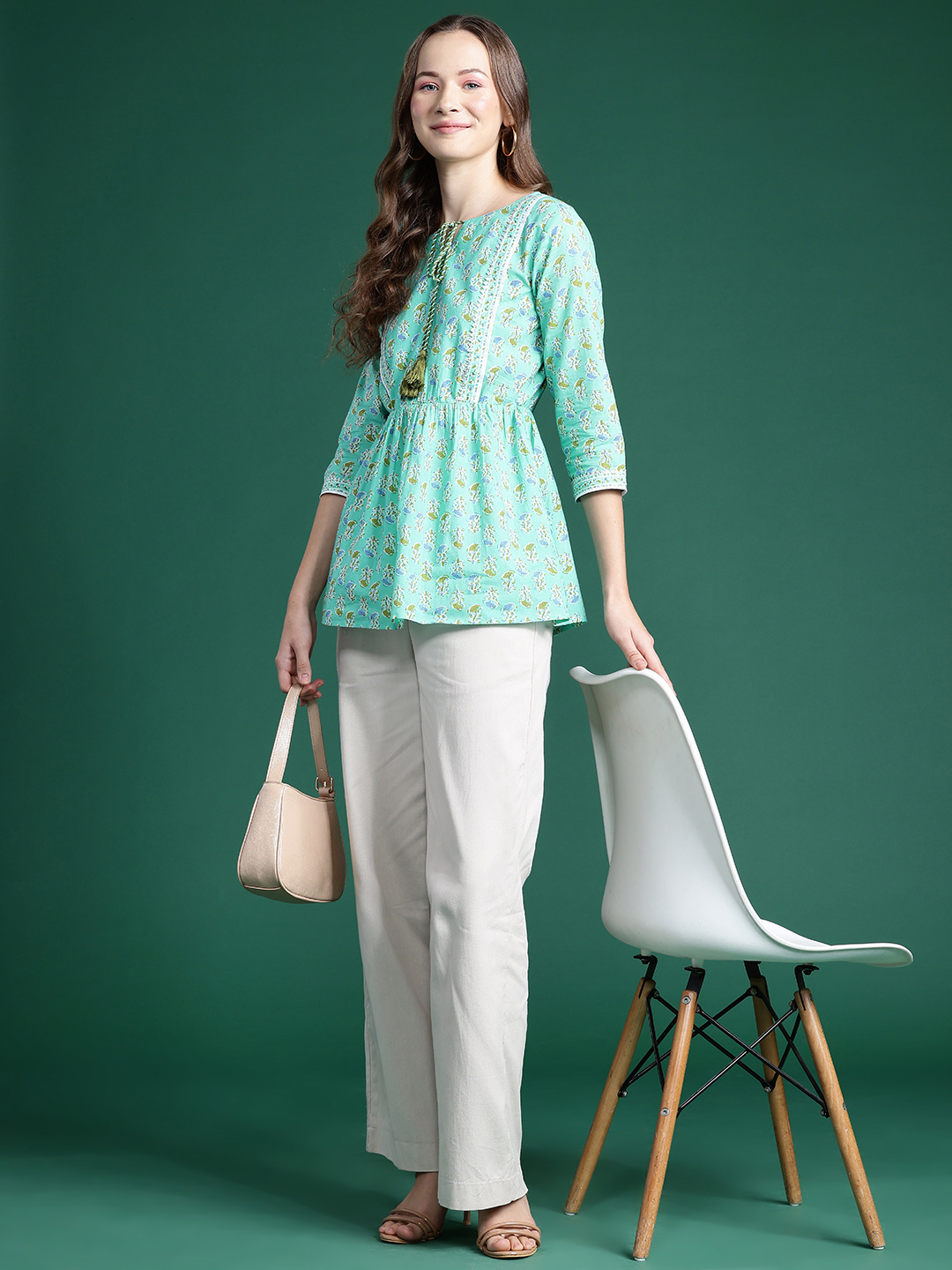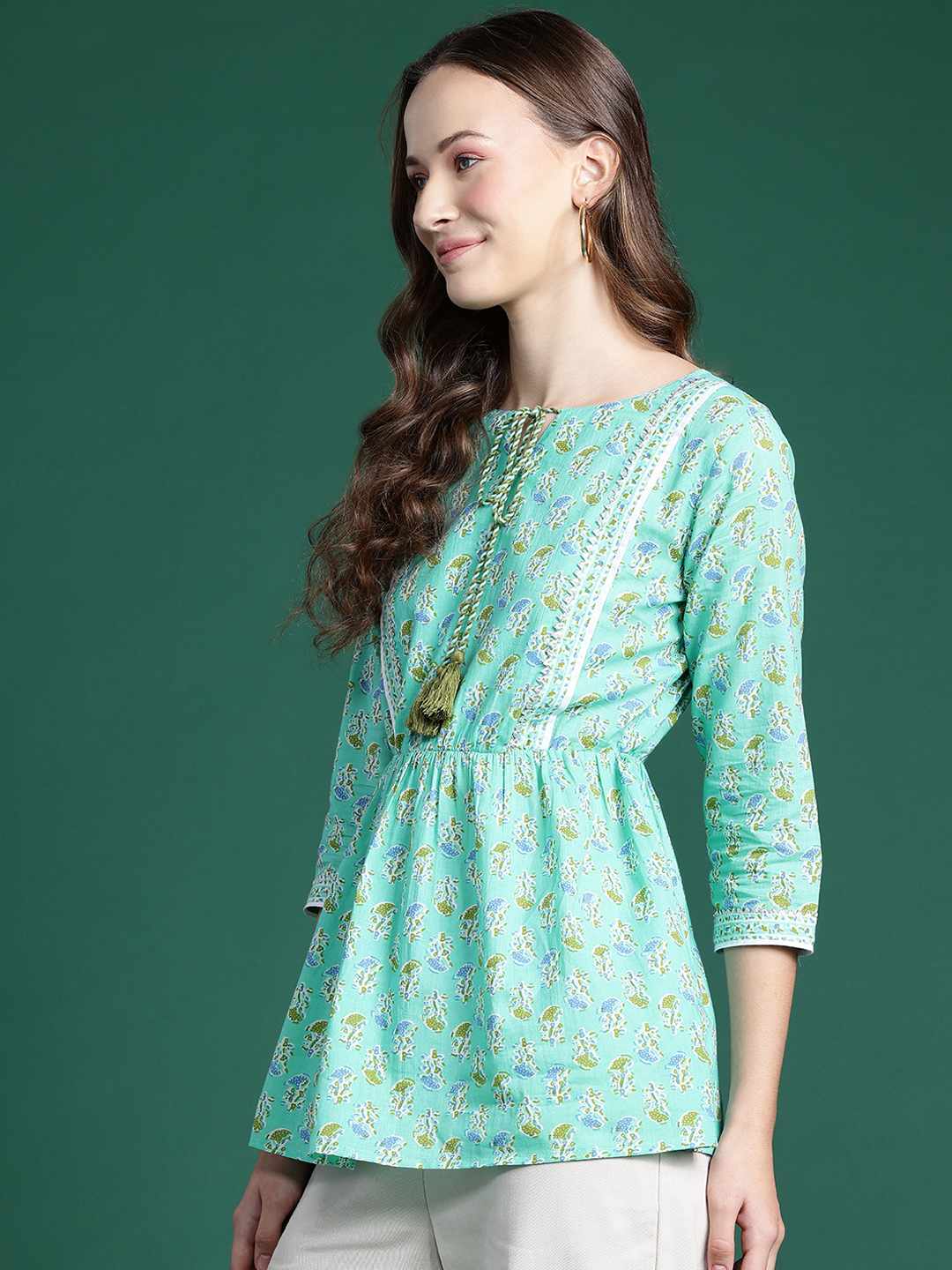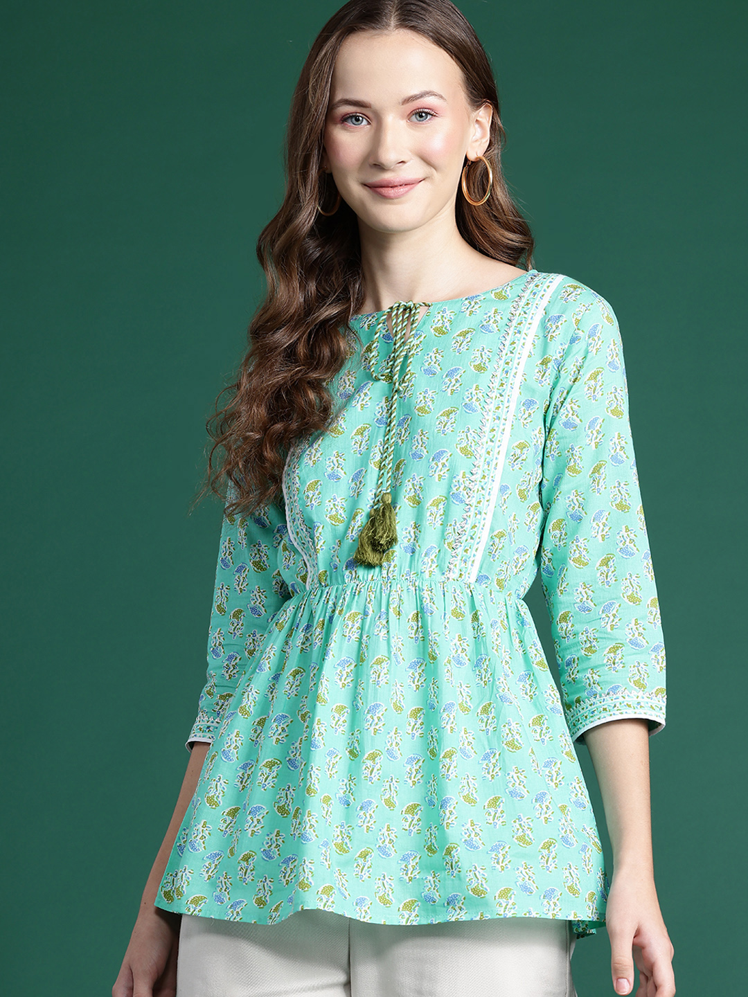 Enhance your wardrobe with this Blue Floral Print Peplum Top, designed for a chic and effortless look. The delicate white floral print on a rich Blue background adds a touch of elegance, while the round neckline with tassel tie detail creates a subtle statement. Featuring three-quarter sleeves with a contrasting white geometric pattern on the cuffs, this peplum silhouette offers a flattering fit perfect for casual outings and semi-formal occasions.