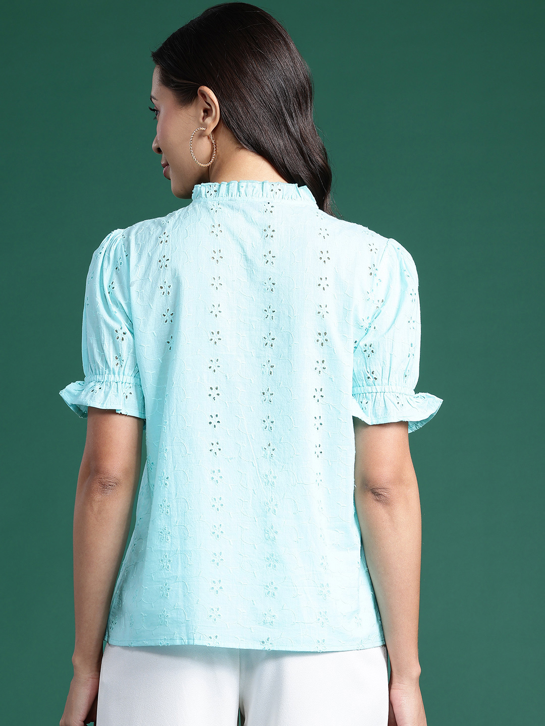 This blue eyelet blouse is ideal for a variety of occasions. Pair it with jeans for a casual daytime look or style it with a flowy skirt for a sophisticated, semi-formal outfit. Whether for brunch, weekend outings, or a relaxed office look, this versatile piece ensures effortless style.