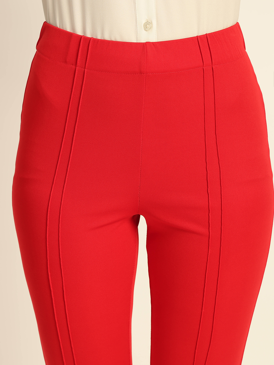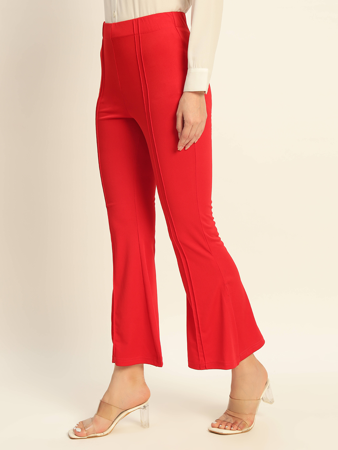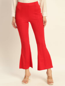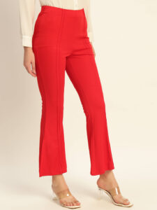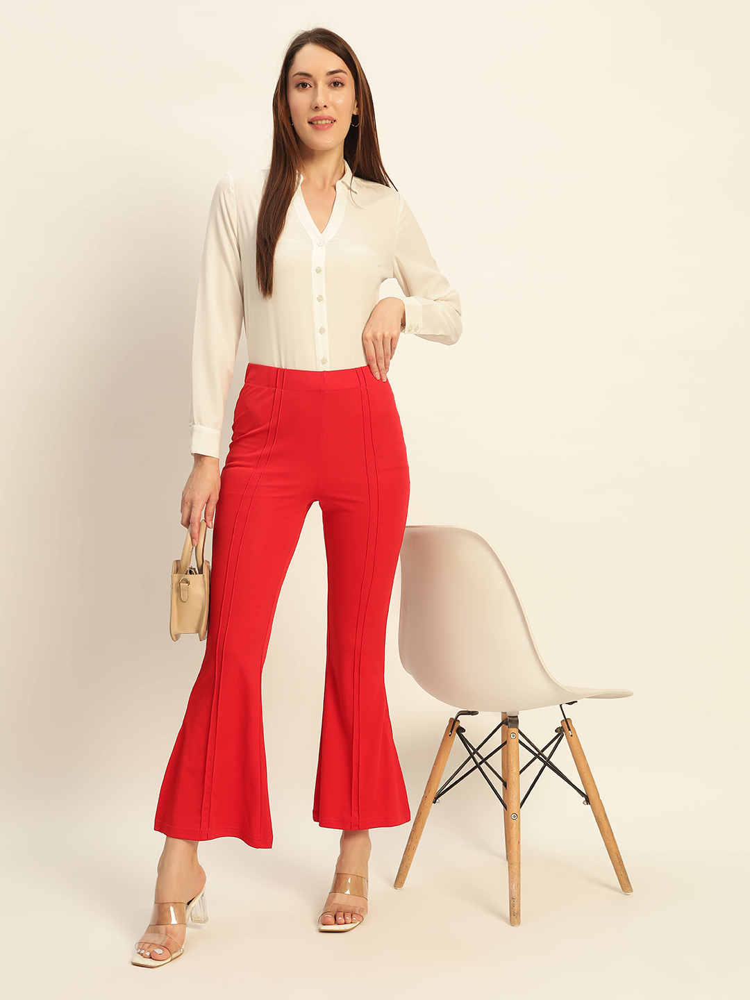 Make heads turn wherever you go in these Bold Red High-Rise Flared Trousers for Women 🔥. Featuring a clean silhouette with vertical seam detailing, these trousers are the ultimate fusion of comfort, confidence, and style. The high-rise waist offers a flattering fit, while the flared hem adds a chic, retro-inspired twist that elongates your legs.