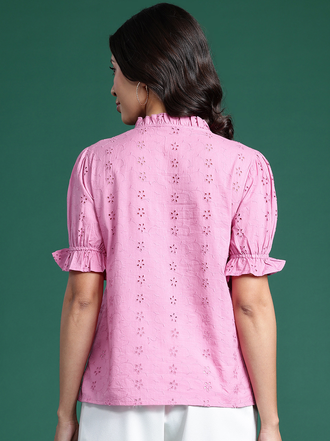 This Fushia Eyelet Detail Short Sleeve Top is a perfect blend of elegance and everyday comfort. Featuring delicate eyelet detailing throughout, this top exudes a chic, feminine charm. The ruffled short sleeves add a playful touch, while the bow-tie neckline with a keyhole cutout offers a subtle statement. Whether you’re heading to brunch or dressing up for a semi-formal gathering, this top ensures a stylish, effortless look.