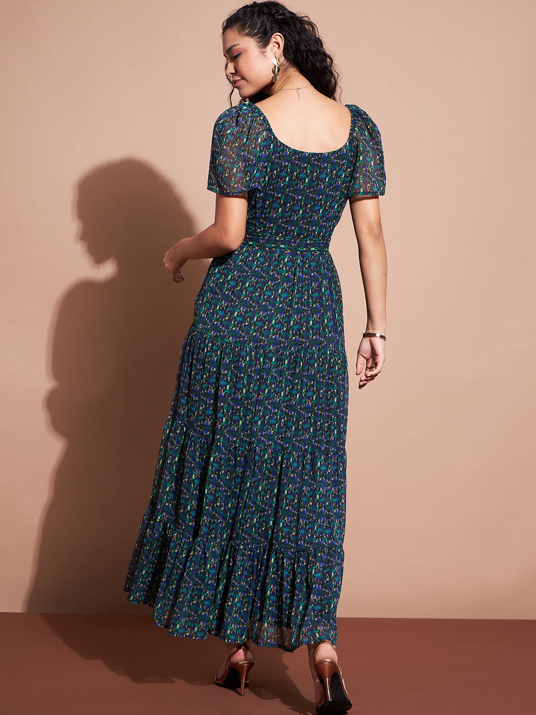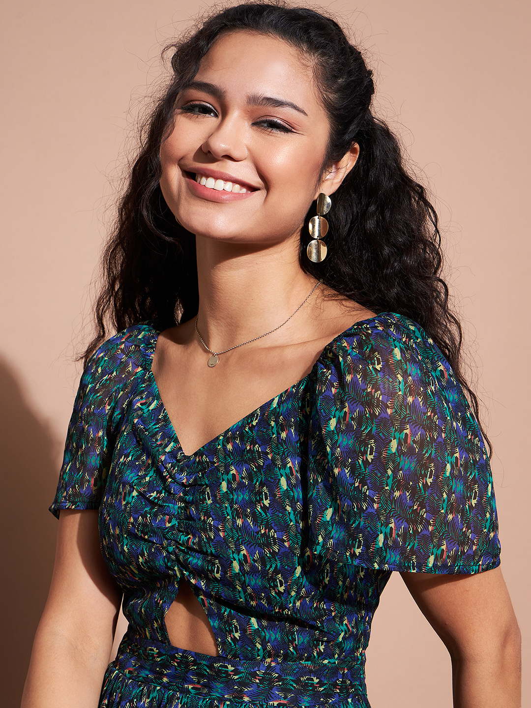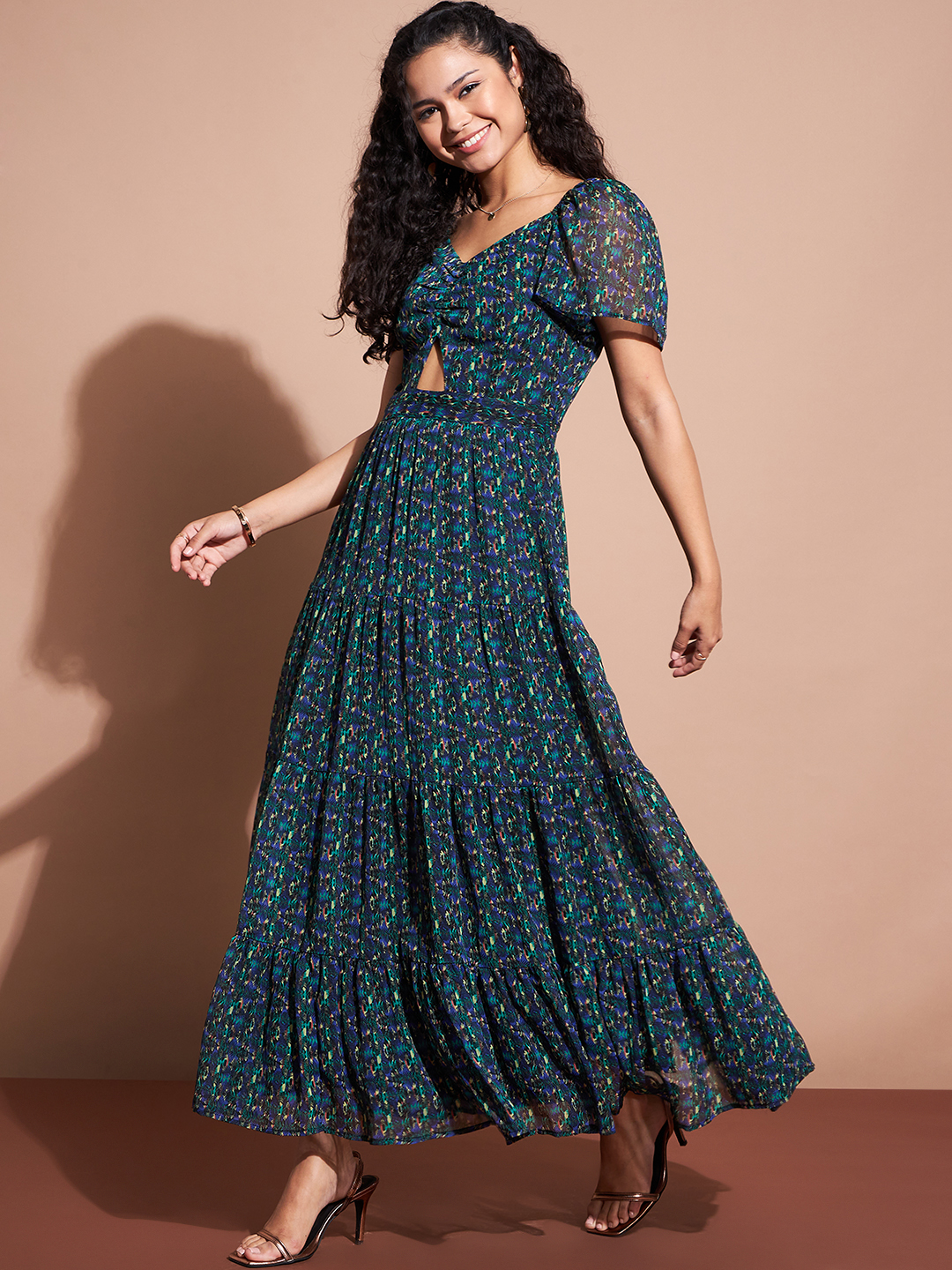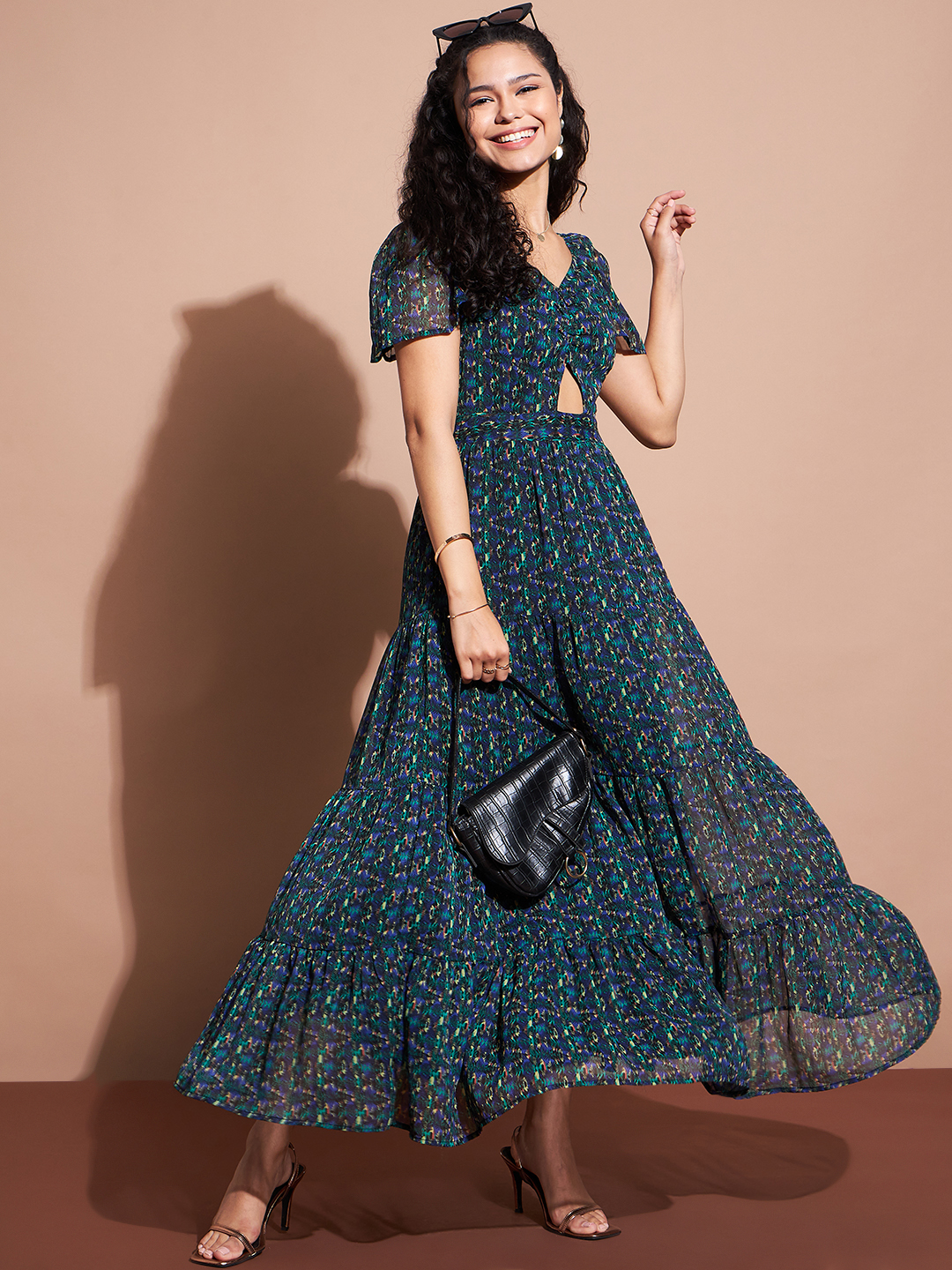 Embrace effortless elegance with this navy blue floral print maxi dress. Designed with a flattering V-neckline and chic short sleeves, this dress features a unique cut-out detail at the waist that adds a modern touch. The flowing silhouette ensures graceful movement, making it the perfect choice for both casual and special occasions.