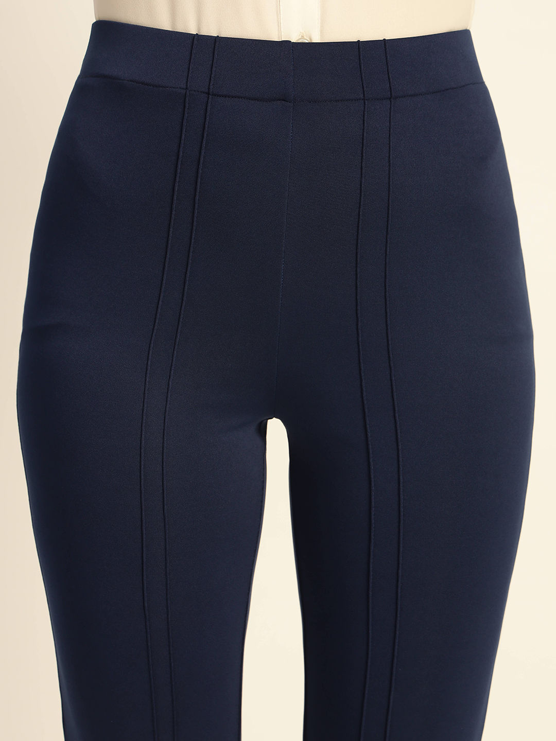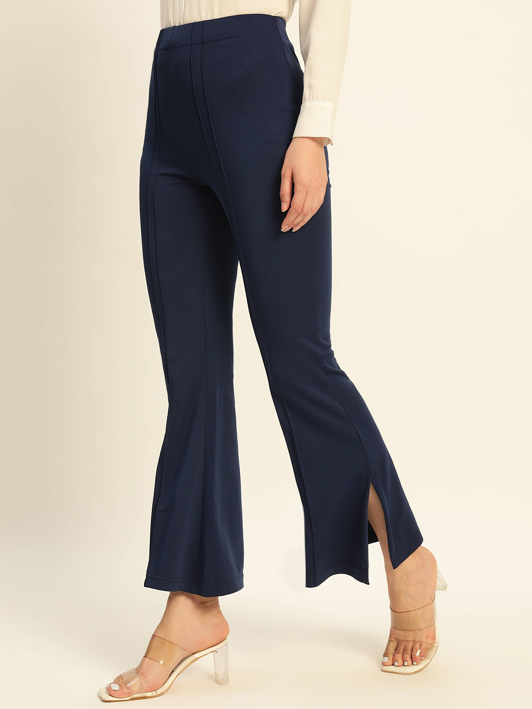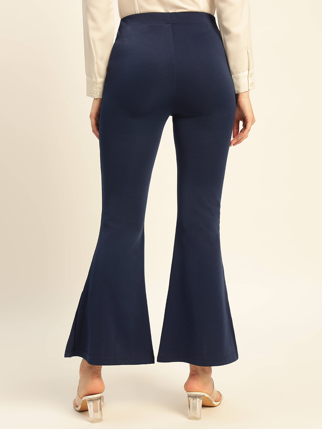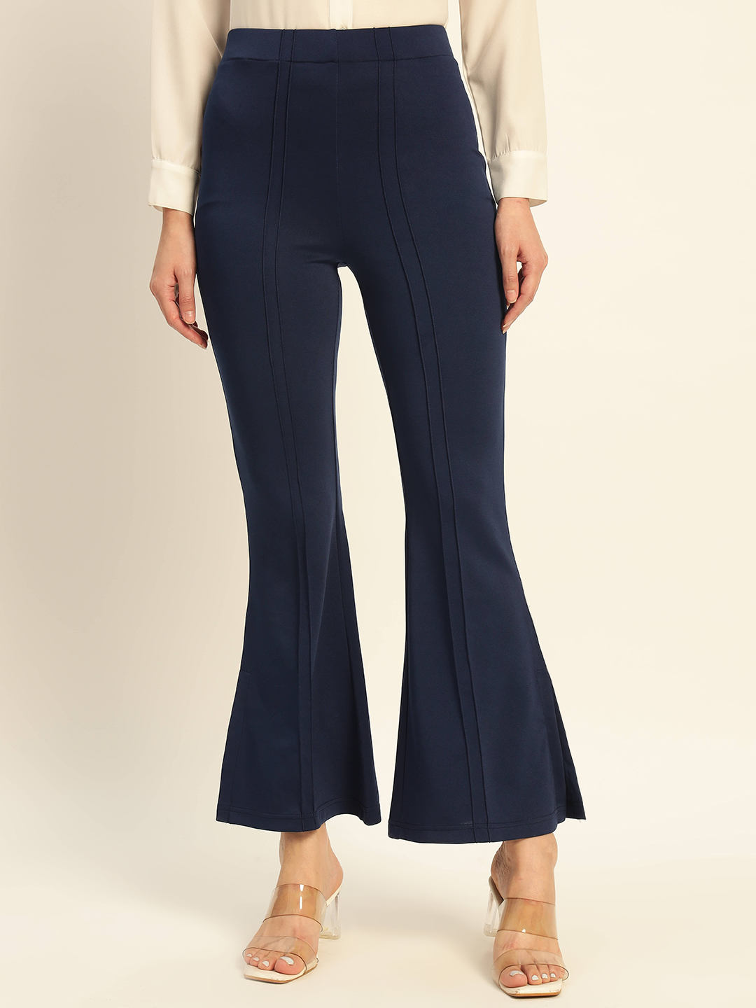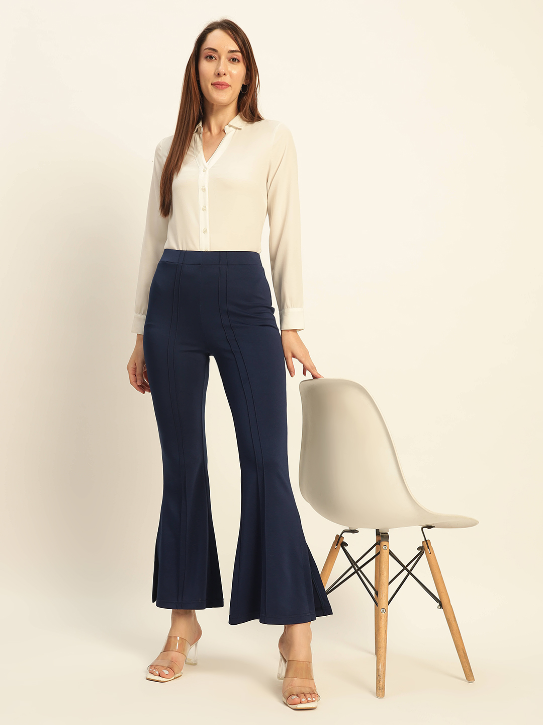 Step up your style game with these High-Rise Navy Flared Trousers for Women ๐Ÿ’ผโœจ. Designed with a tailored silhouette and front seam detail, these trousers bring a refined touch to your everyday office attire or smart casual outings. The flattering high-waist fit hugs you in the right places, while the flared leg enhances your silhouette โ€” perfect for lengthening your frame.