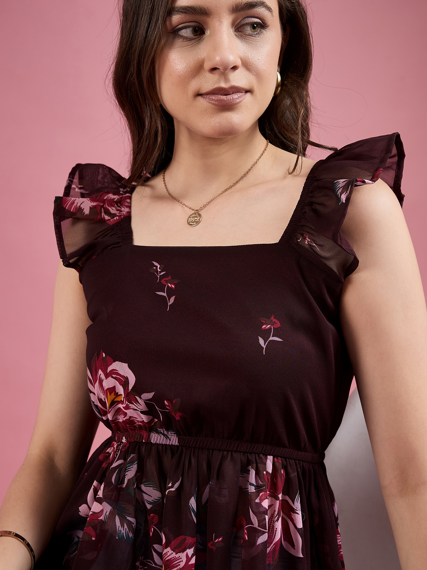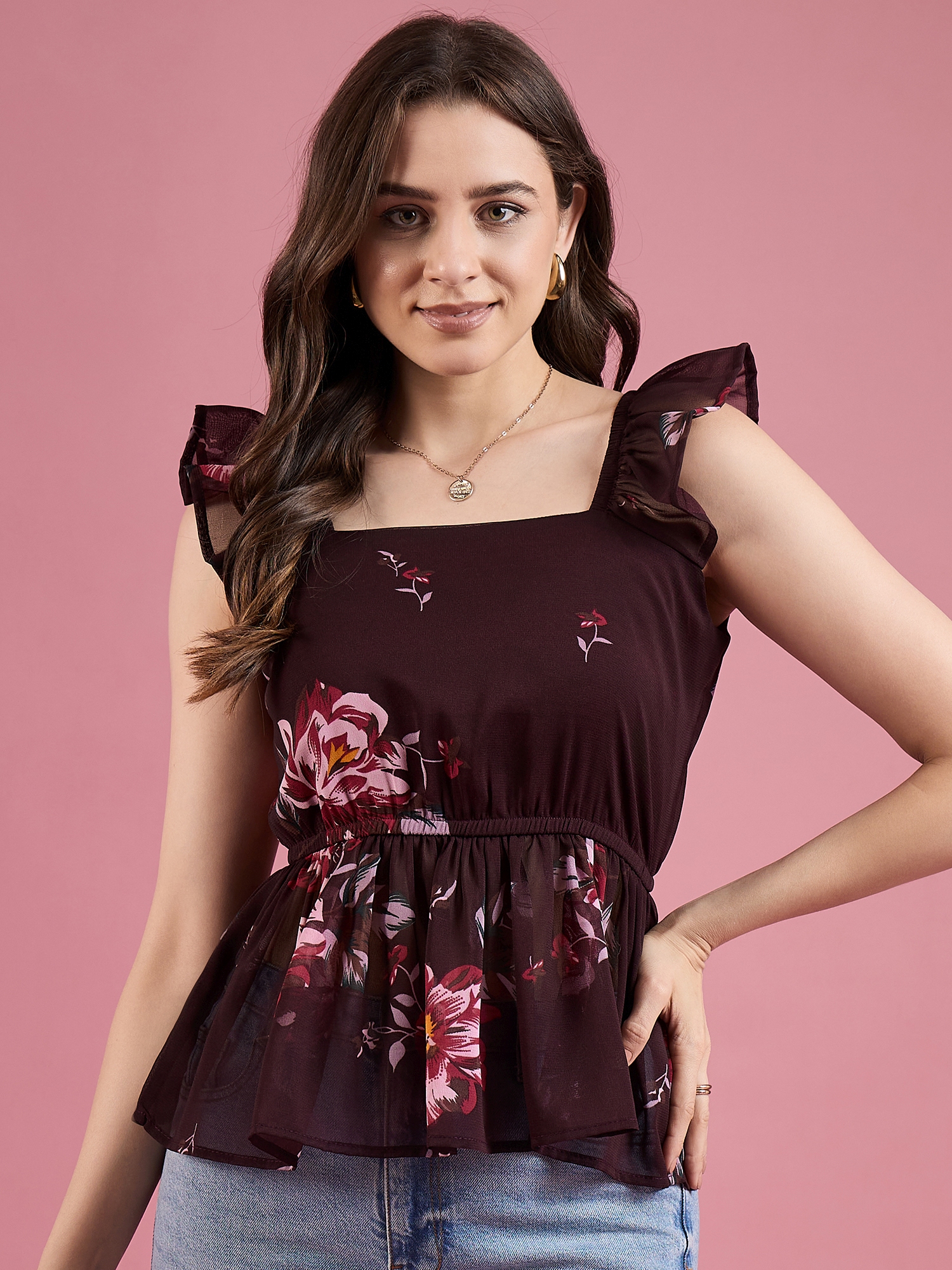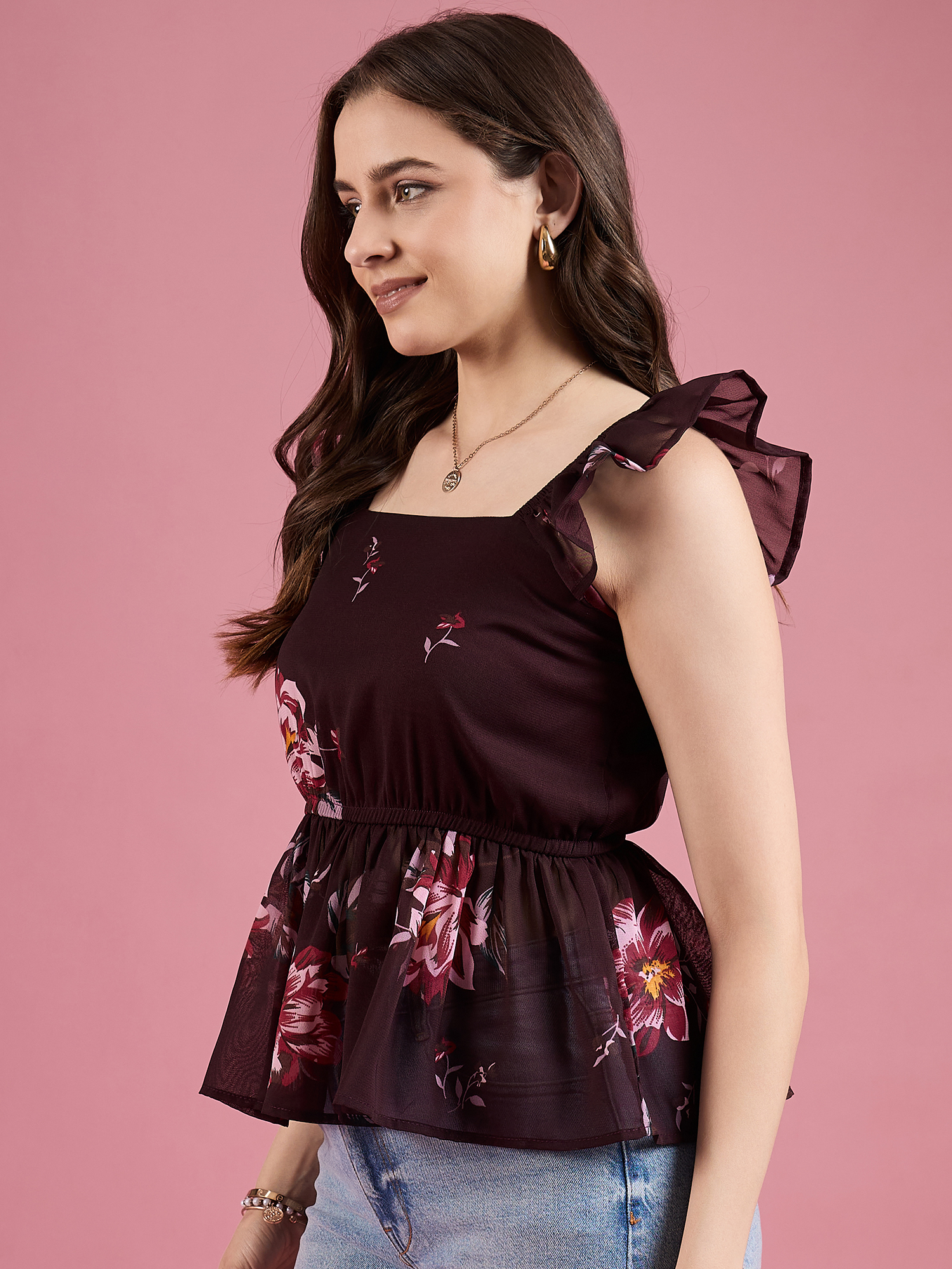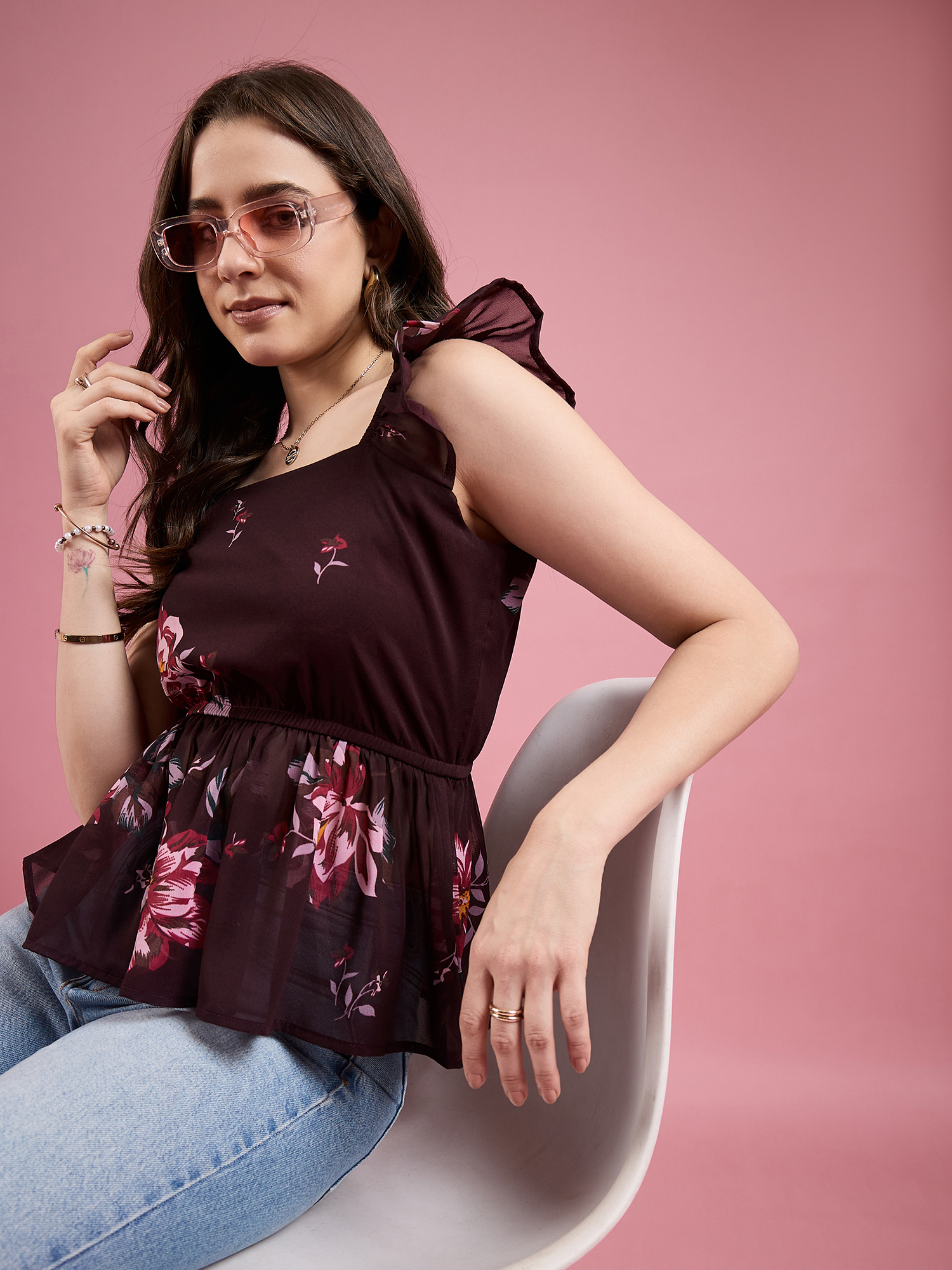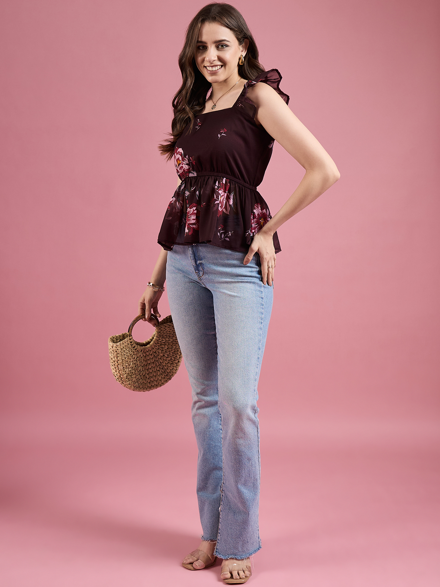 This Floral Ruffle Sleeve Peplum Top blends elegance with playful charm, featuring a striking maroon base adorned with delicate multicolor floral prints. The square neckline adds a structured touch, while the ruffle sleeves bring a feminine flair. Designed with a cinched waist that transitions into a flowy peplum hem, this top enhances your silhouette effortlessly. Whether you’re dressing for a brunch date or a casual outing, this piece ensures a chic and sophisticated look.