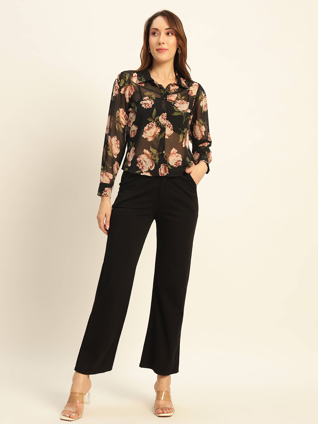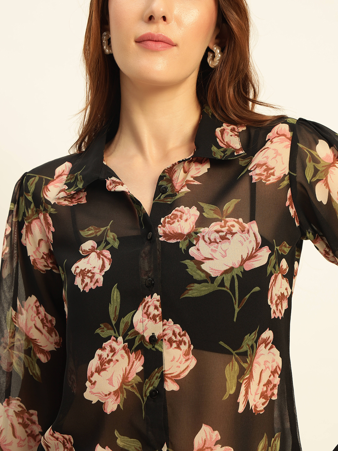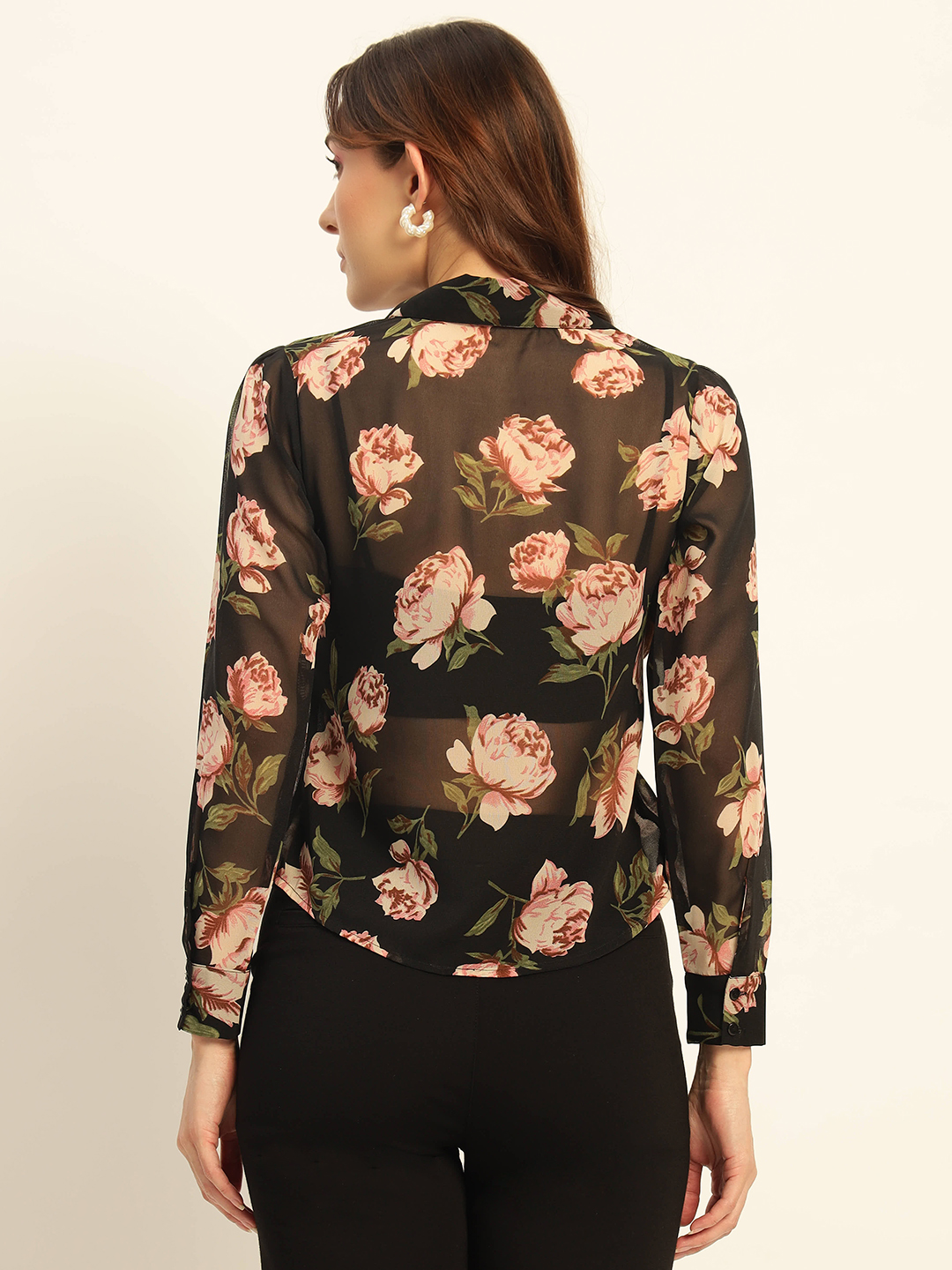 A sheer black blouse with romantic floral prints, button-up front, and long sleeves – perfect for layering and elegant styling πŸŒΈπŸ–€.