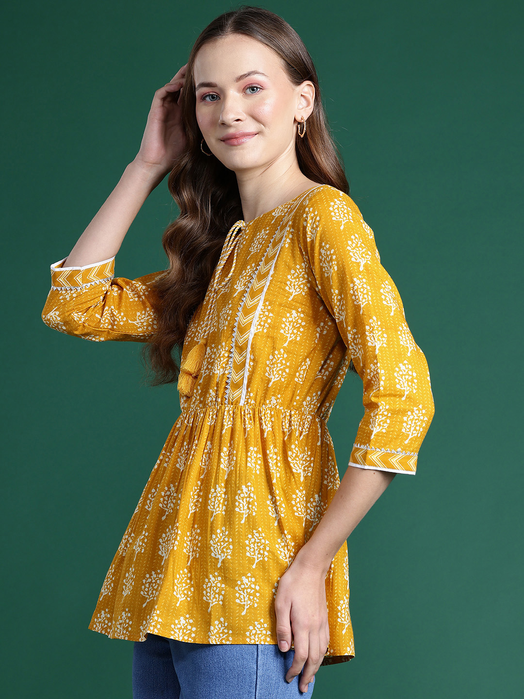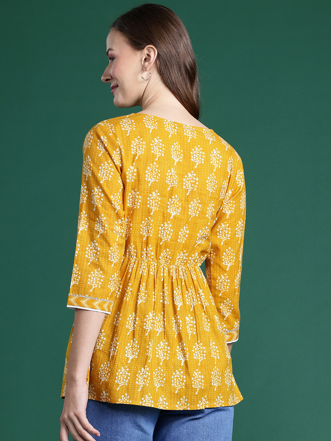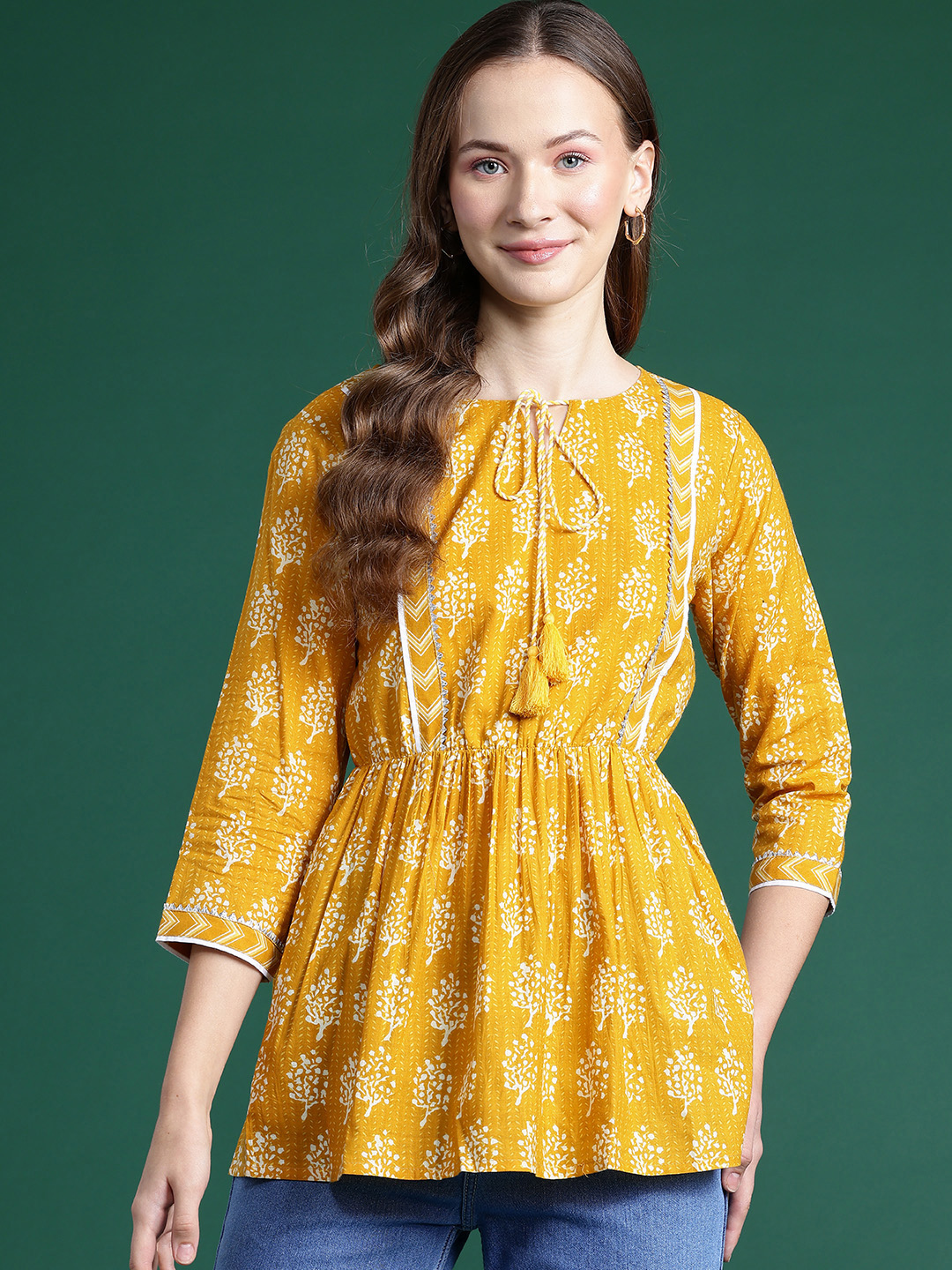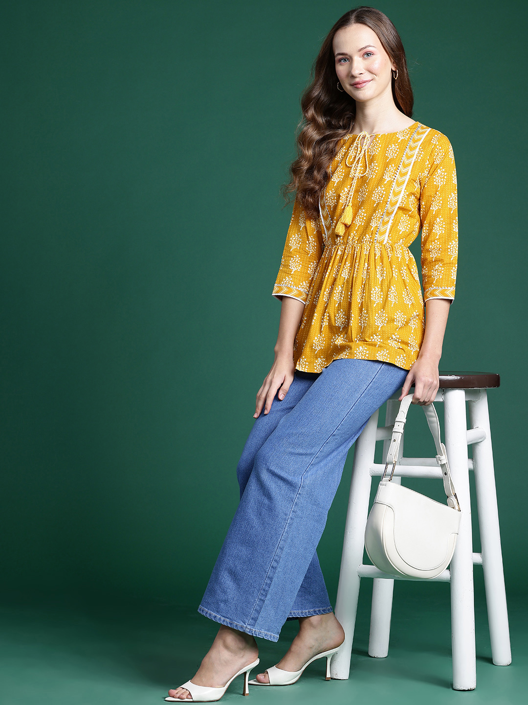Step into everyday elegance with this charming Mustard peplum top, adorned with a delicate floral print and detailed white embroidery on the neckline and sleeves. The round neckline with playful tassel ties adds a boho-chic flair, while the gathered waist creates a flattering peplum silhouette that complements all body types. Perfect for adding feminine flair to your daily wardrobe.