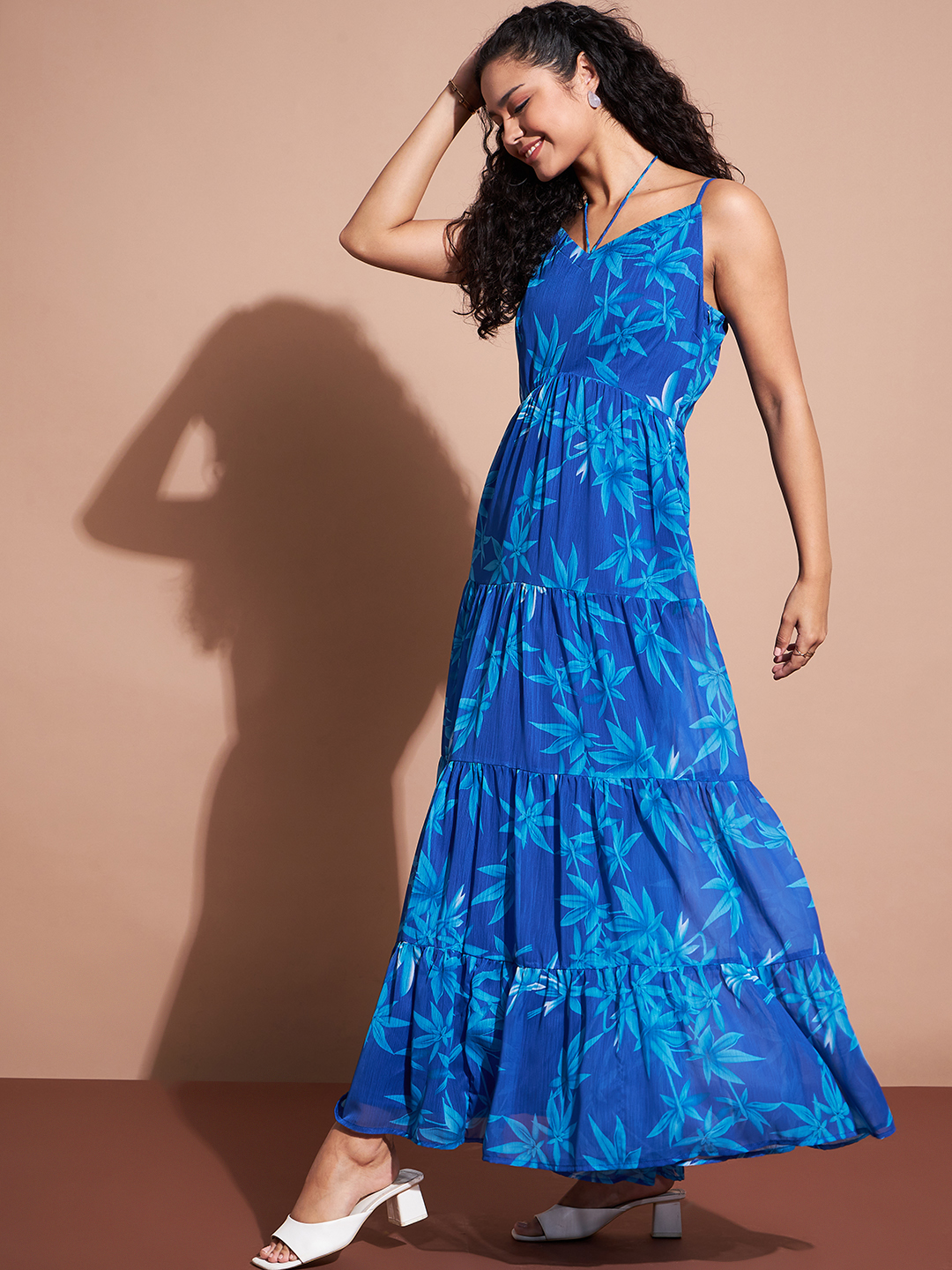 Step into effortless elegance with this vibrant Navy Blue Floral Maxi Dress. Designed with a stunning pink and white floral print on a rich green background, this dress features a flattering V-neckline, sleeveless cut, and a gracefully tiered skirt that adds movement and charm. Perfect for warm-weather days, this dress effortlessly blends style and comfort, making it a go-to piece for casual and vacation looks.