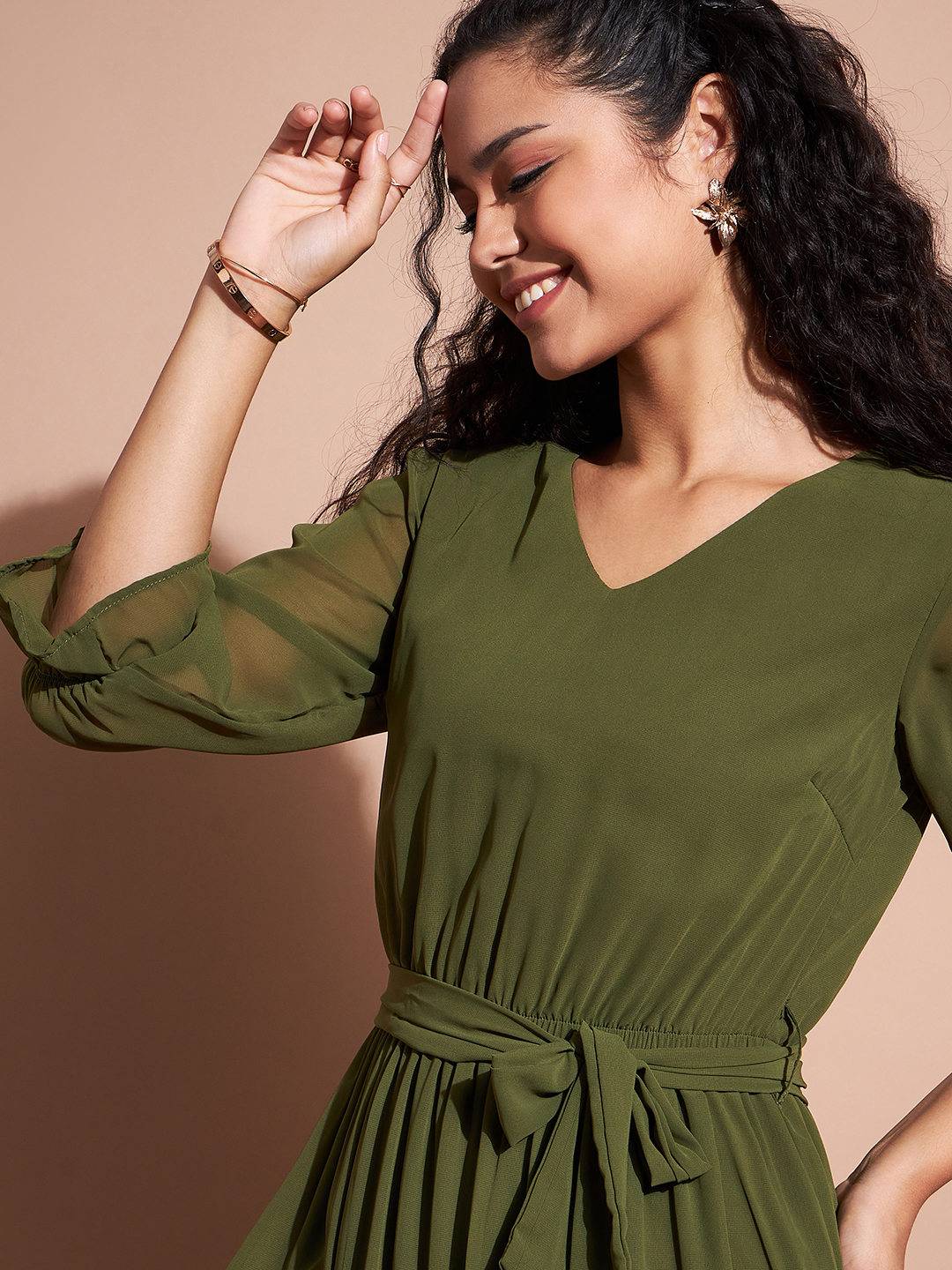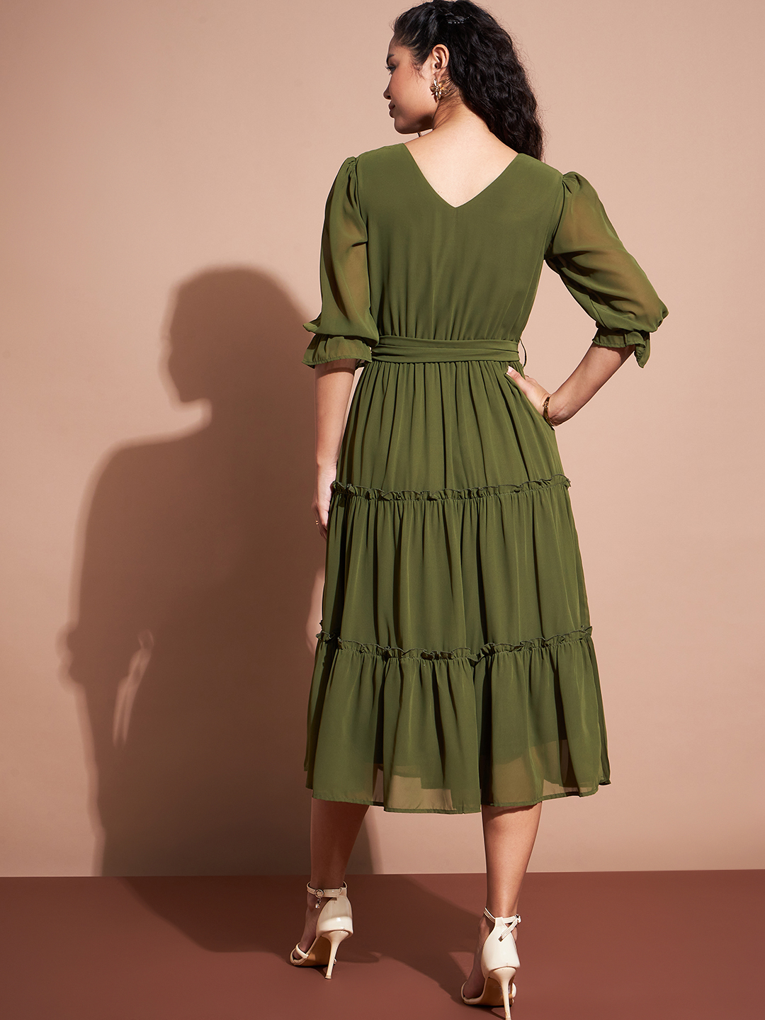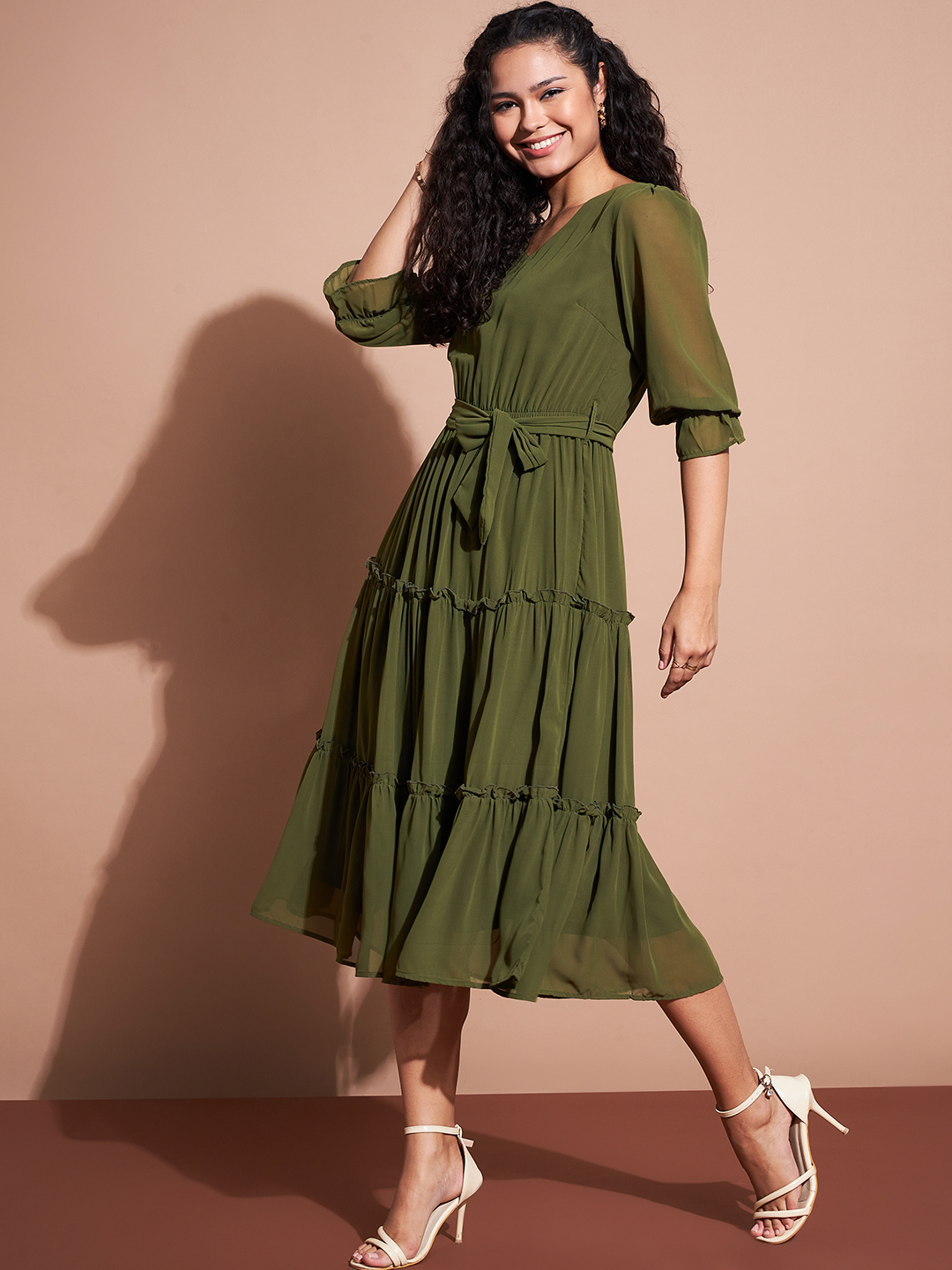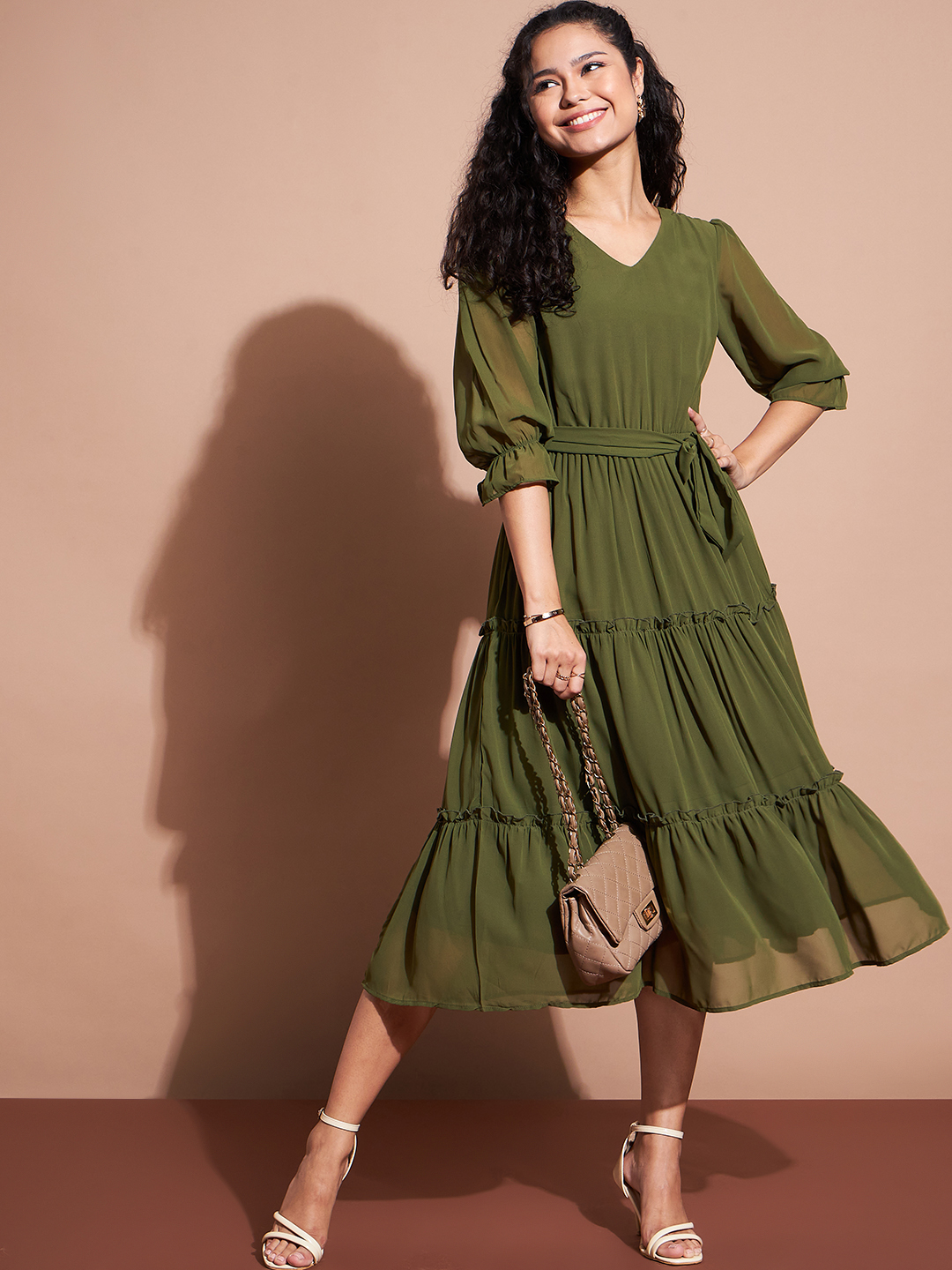 Deewa Women Olive Green Midi Dress with Ruffle Detail Dress