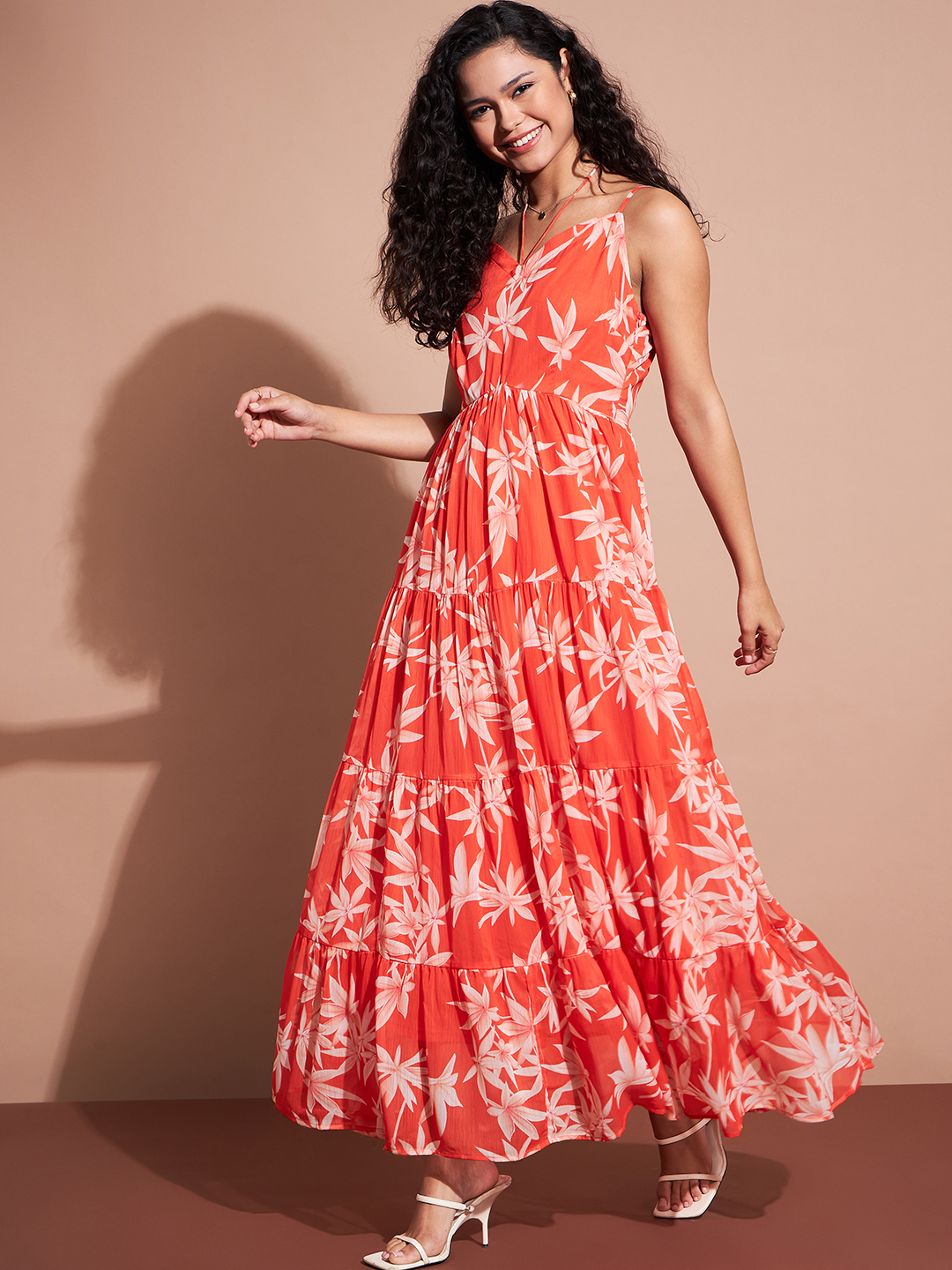 Deewa Women Orange Elegant Floral Printed Maxi Dress