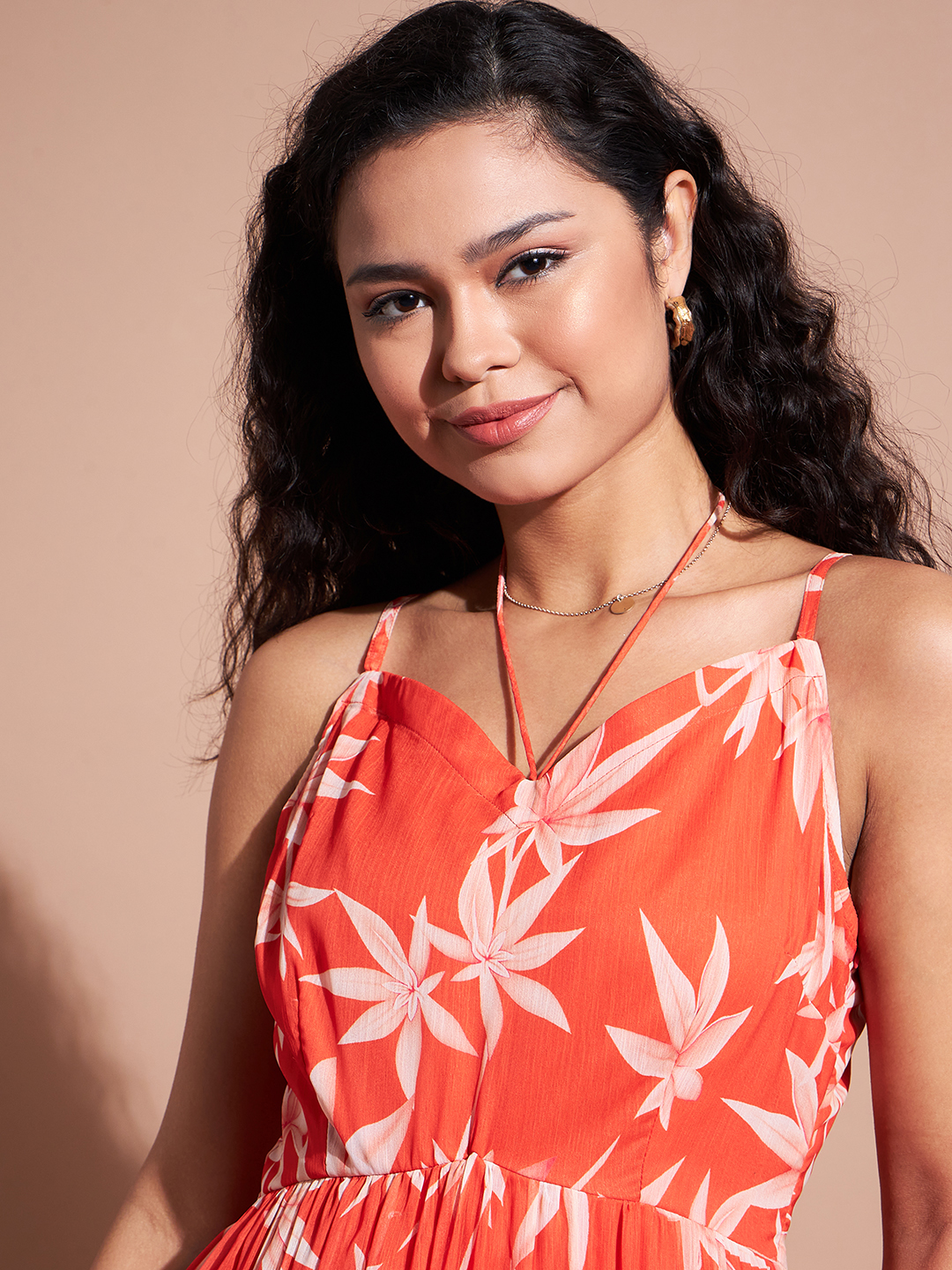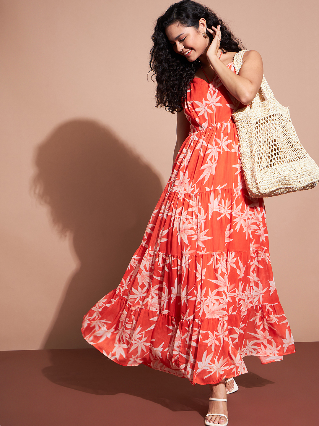 Step into effortless elegance with this vibrant Orange Floral Maxi Dress. Designed with a stunning pink and white floral print on a rich green background, this dress features a flattering V-neckline, sleeveless cut, and a gracefully tiered skirt that adds movement and charm. Perfect for warm-weather days, this dress effortlessly blends style and comfort, making it a go-to piece for casual and vacation looks.