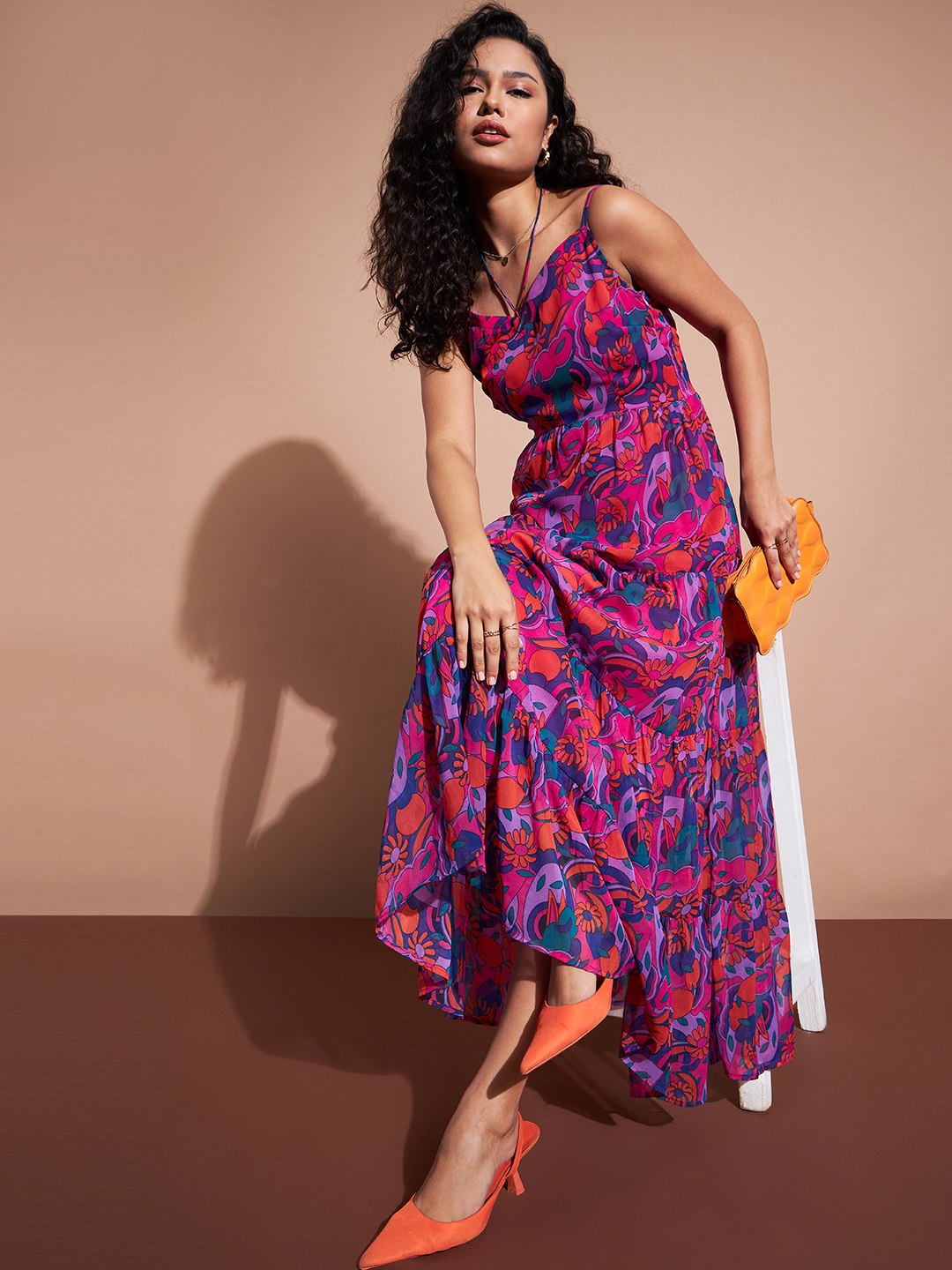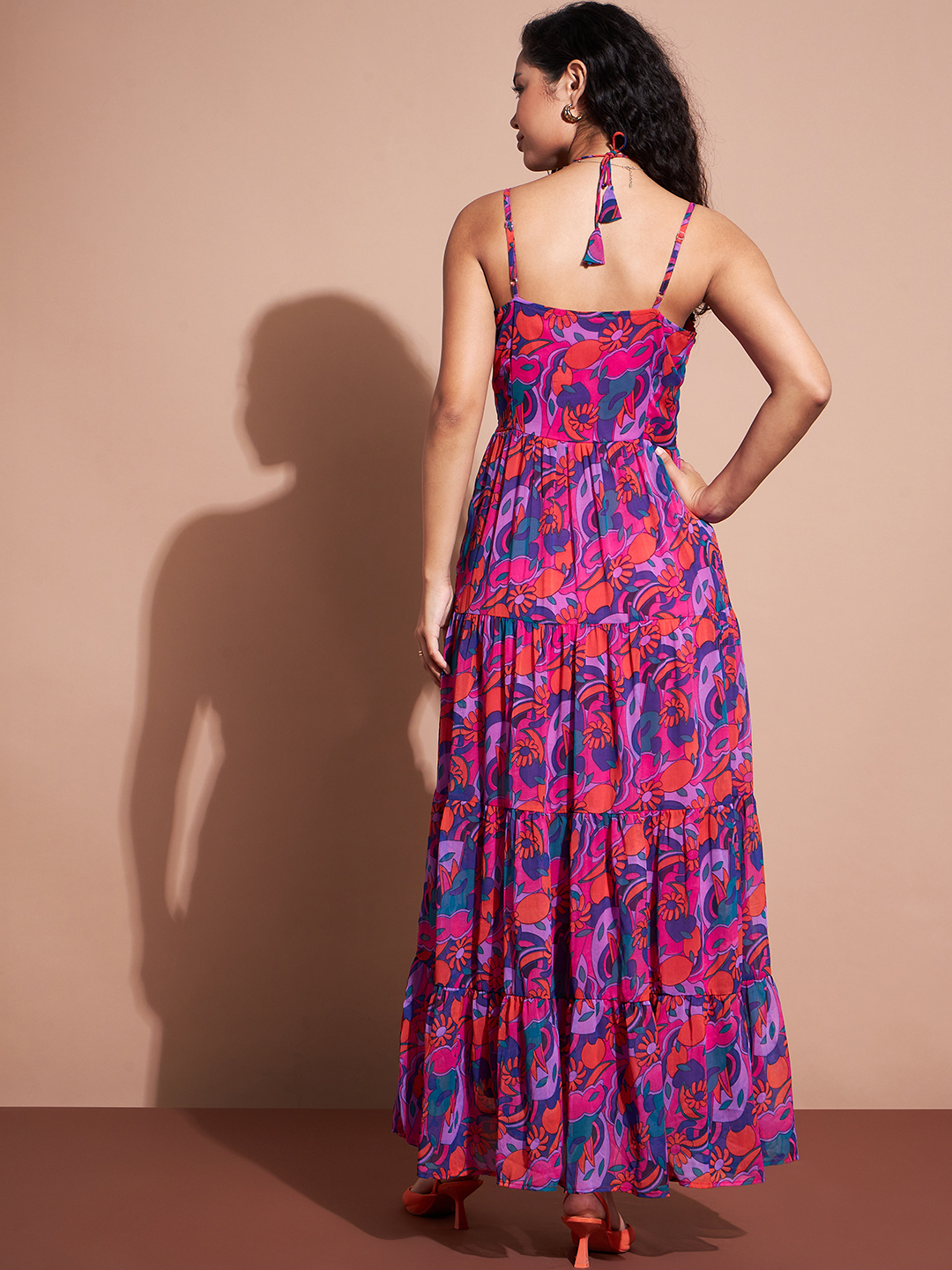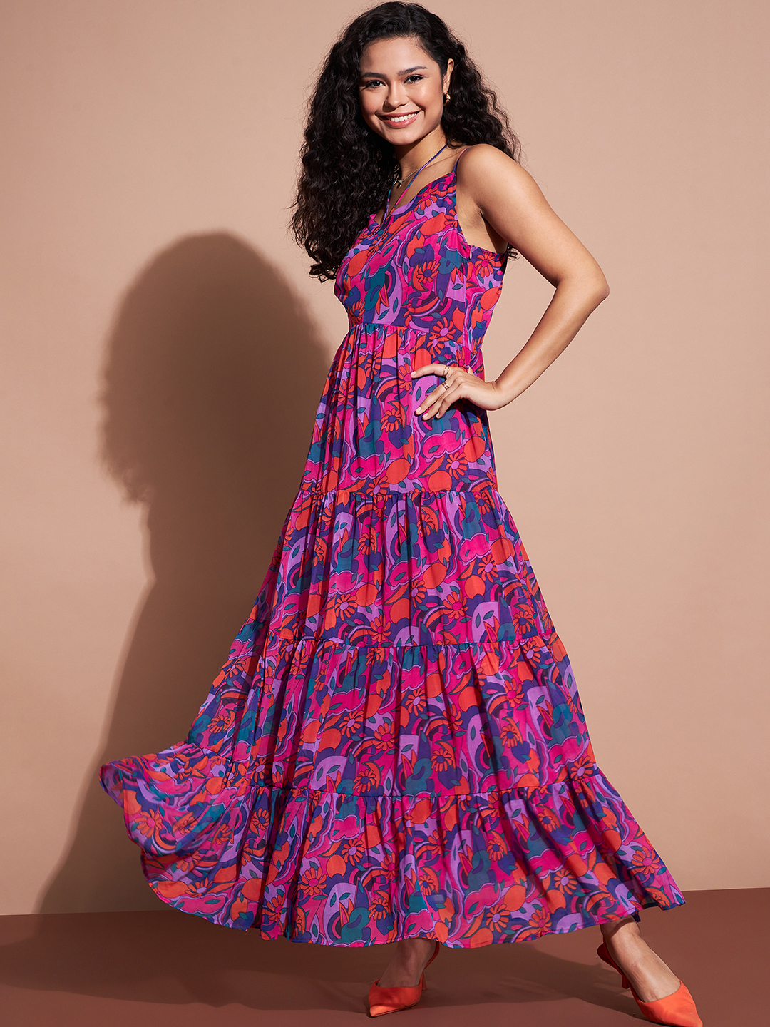 Step into effortless elegance with this vibrant Pink Floral Maxi Dress. Designed with a stunning pink and white floral print on a rich green background, this dress features a flattering V-neckline, sleeveless cut, and a gracefully tiered skirt that adds movement and charm. Perfect for warm-weather days, this dress effortlessly blends style and comfort, making it a go-to piece for casual and vacation looks.