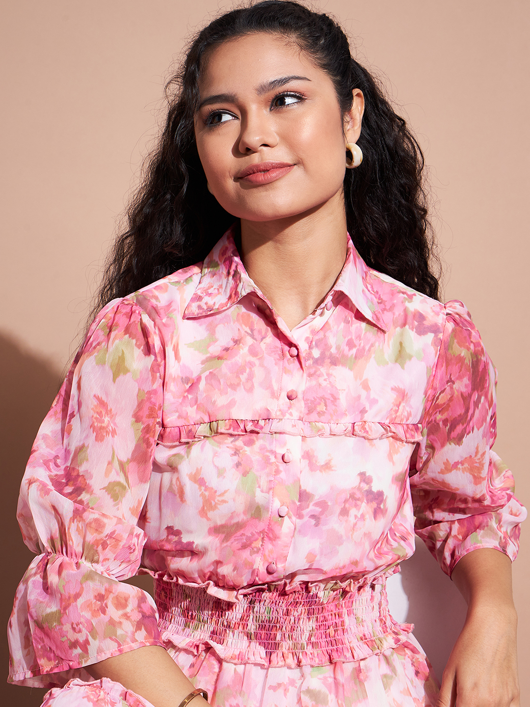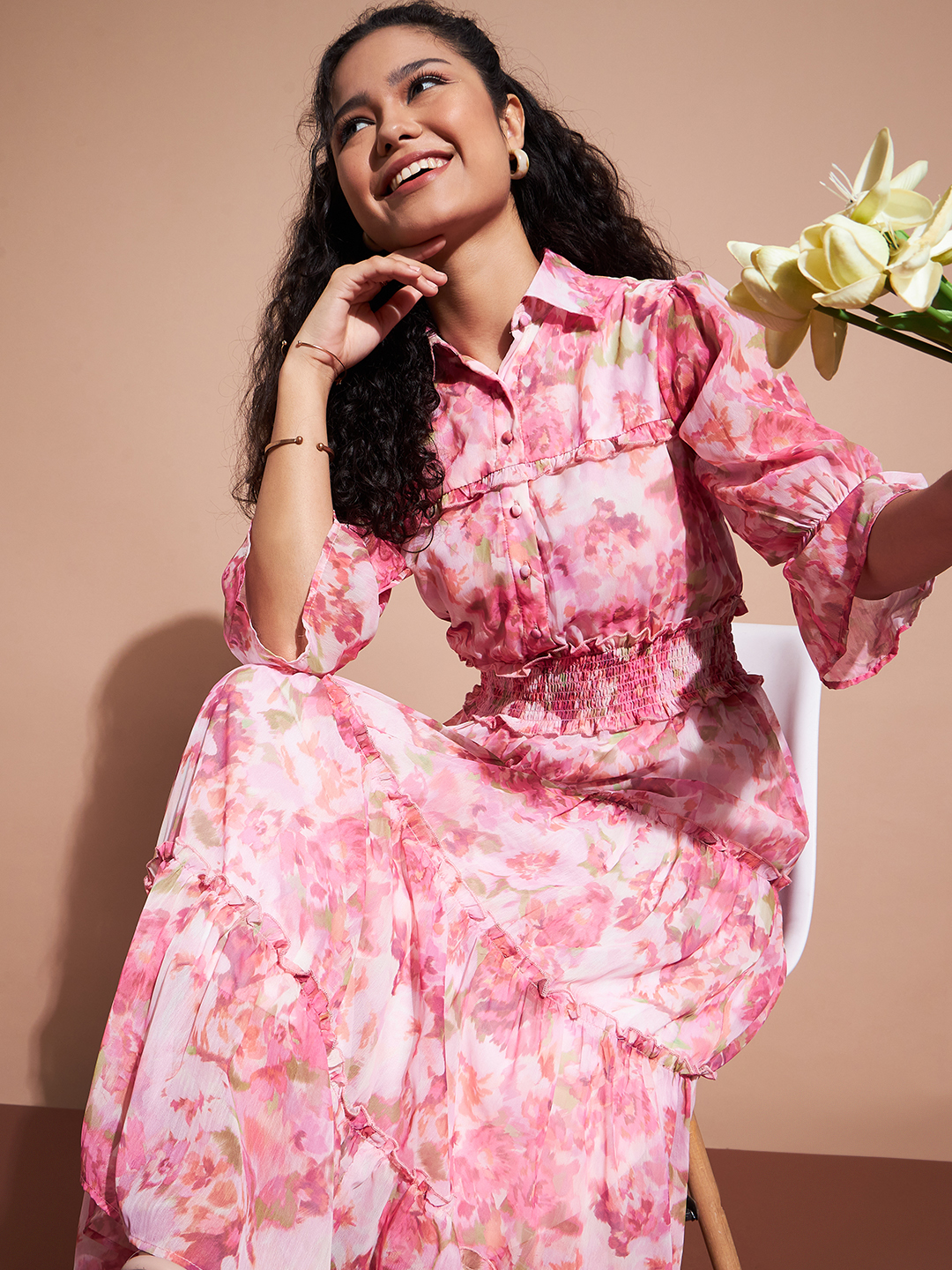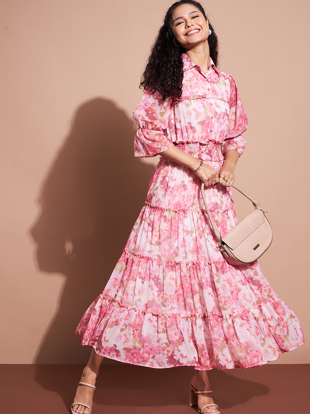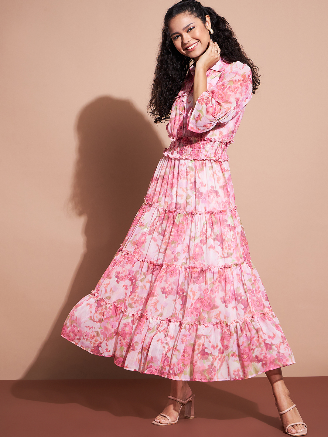 Elevate your wardrobe with this stunning floral tiered maxi dress, featuring a romantic pink and white watercolor print. Designed with a sophisticated collared neckline, long sleeves with cuffed detailing, and a smocked waist for a flattering silhouette. The tiered skirt adds effortless movement, making this dress both elegant and comfortable.