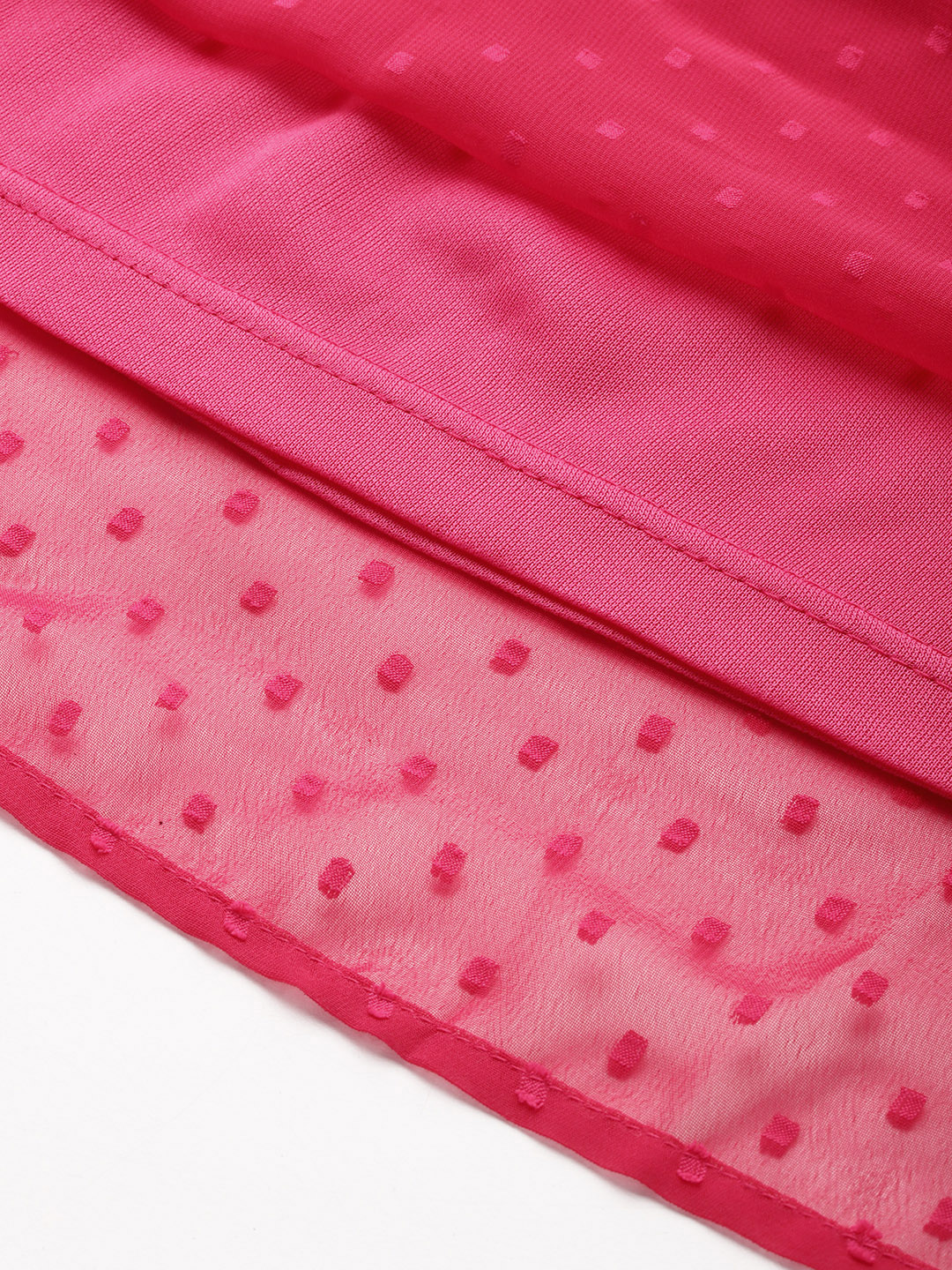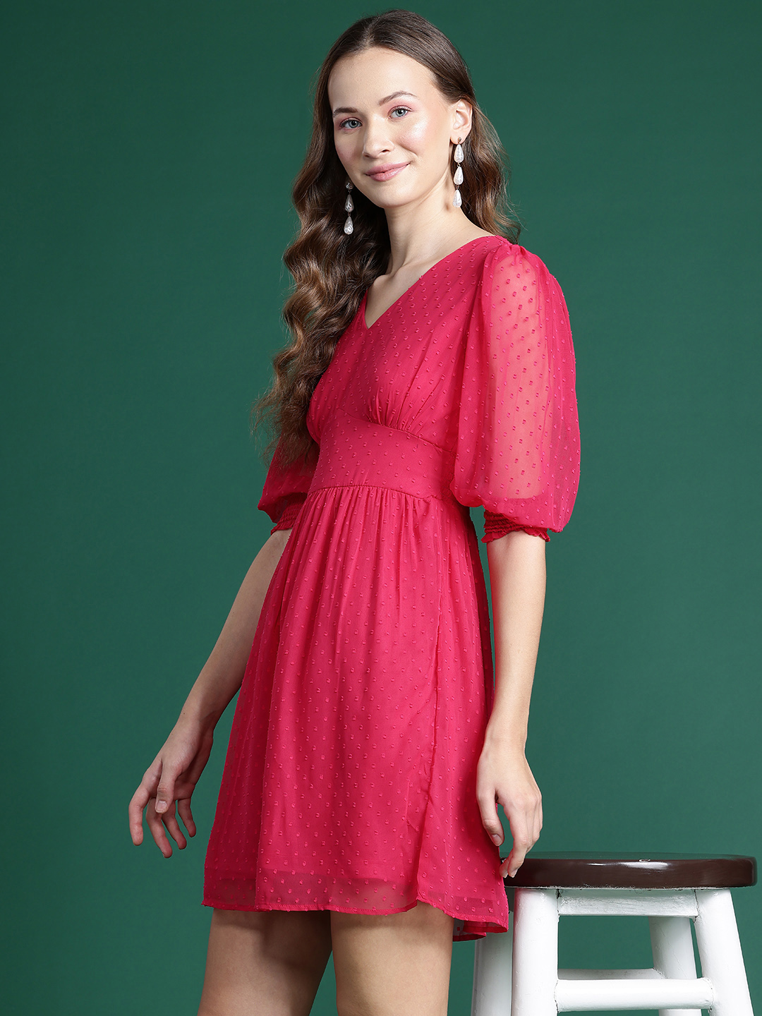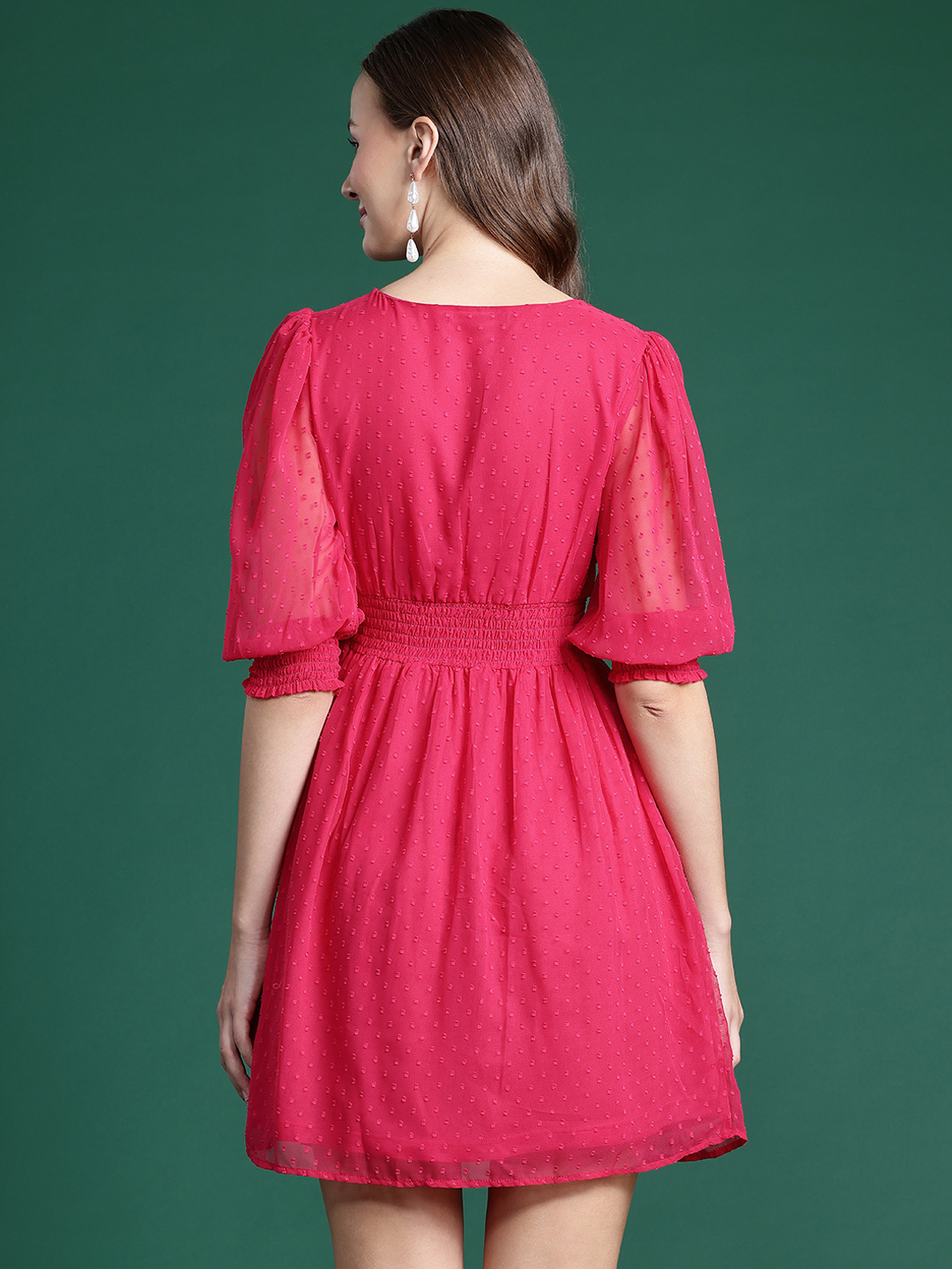 This vibrant Pink dress showcases a playful self design mesh overlay, adding a whimsical charm to your wardrobe. Designed with a flattering V-neckline and stylish puff sleeves, it offers a vintage-inspired silhouette that enhances your look. The fitted bodice gracefully cinches the waist, while the flowing skirt provides effortless movement. Perfect for casual and semi-formal occasions, this dress ensures a stunning and elegant appearance.