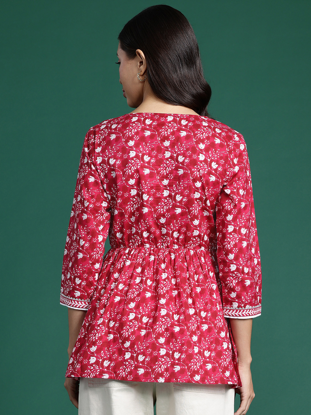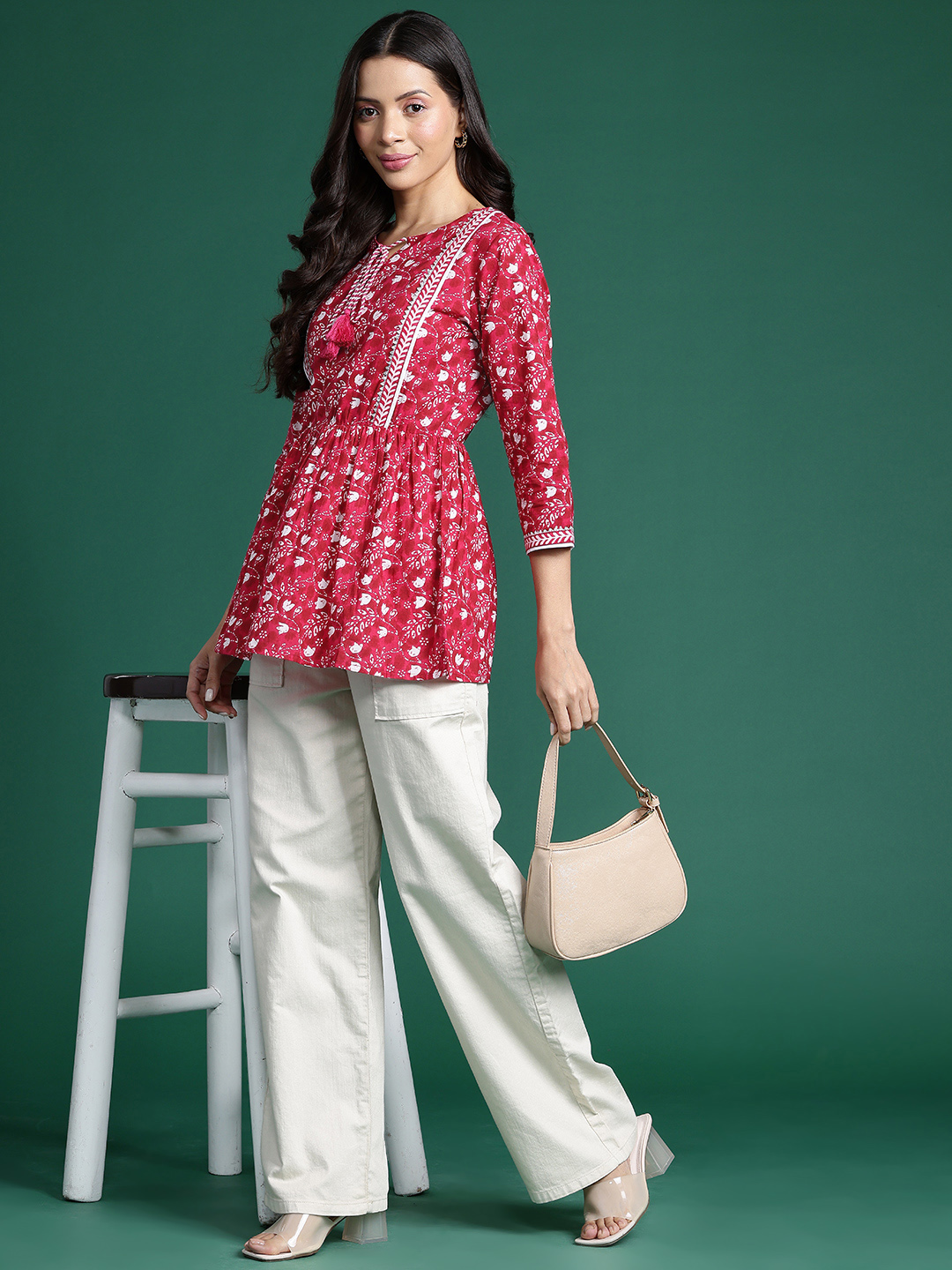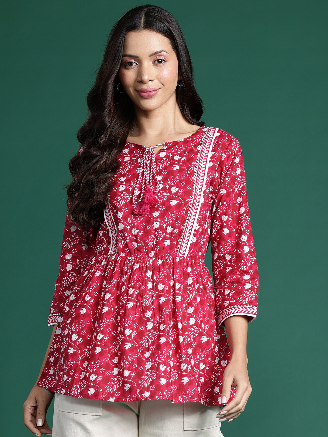 Enhance your wardrobe with this Red Floral Print Peplum Top, designed for a chic and effortless look. The delicate white floral print on a rich Red background adds a touch of elegance, while the round neckline with tassel tie detail creates a subtle statement. Featuring three-quarter sleeves with a contrasting white geometric pattern on the cuffs, this peplum silhouette offers a flattering fit perfect for casual outings and semi-formal occasions.