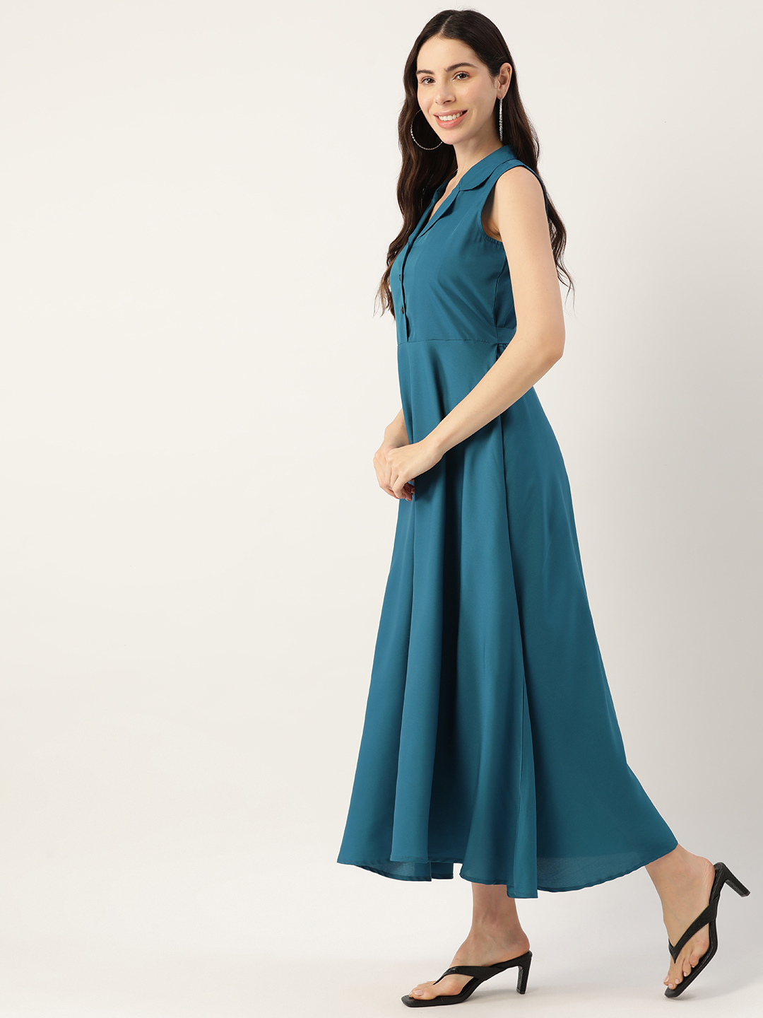 Add a touch of sophistication to your wardrobe with this teal sleeveless maxi dress. Featuring a smart shirt collar with a buttoned placket, this dress merges contemporary minimalism with feminine grace. The solid teal hue gives it a timeless appeal, while the flared hem offers fluid movement for a graceful silhouette. Perfect for warm-weather days when you want to look put-together yet feel completely at ease.